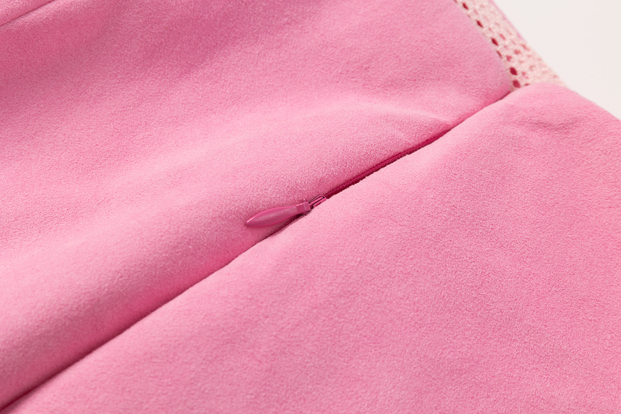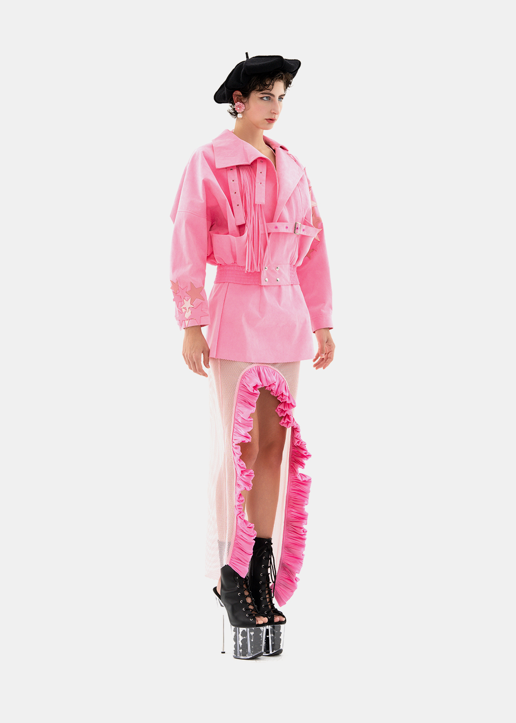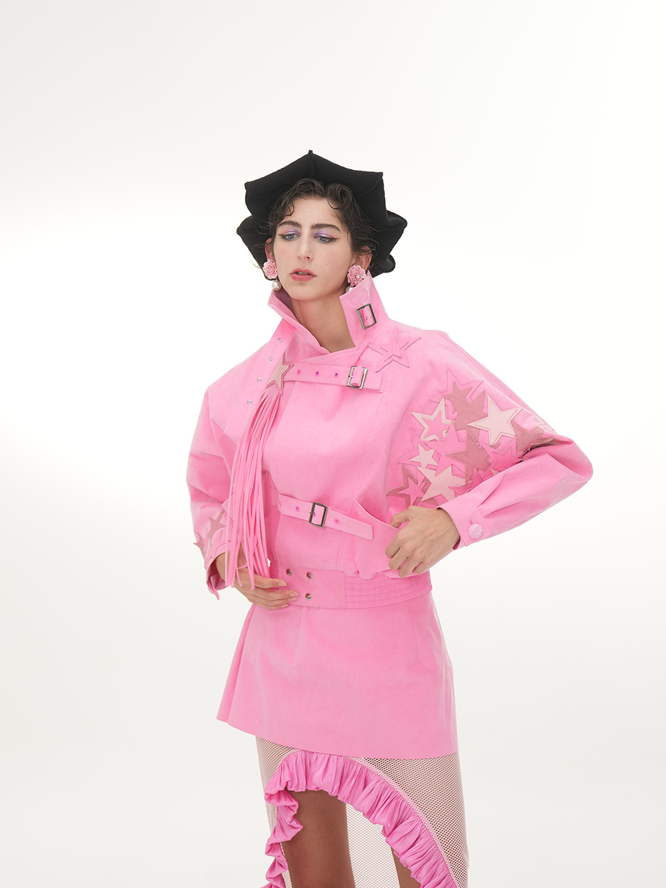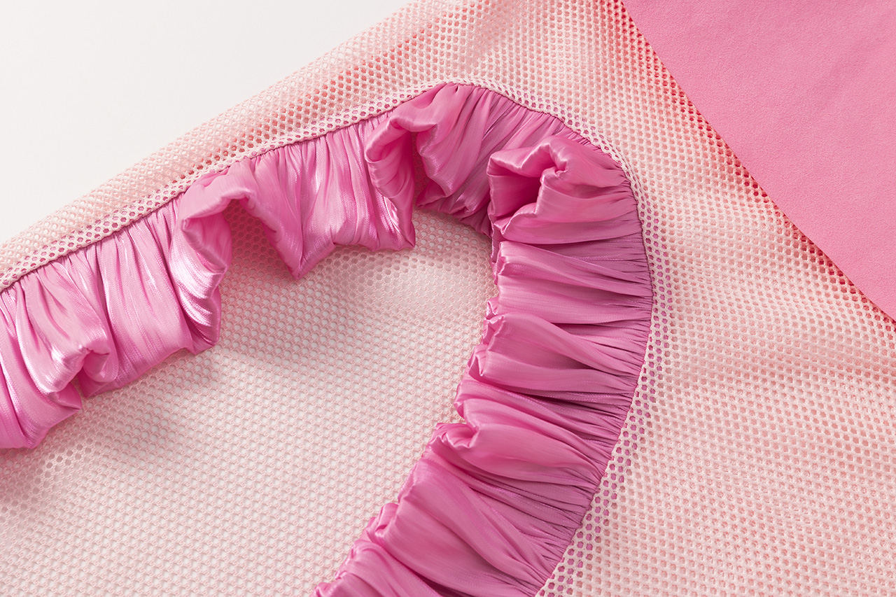 这款荷叶边双层裙选用粉色纸感廓型面料,挺括有型,赋予裙身利落的轮廓与时尚张力。内层搭配粉色网纱,点缀层层叠叠的荷叶边,轻盈灵动,仿佛春日绽放的花朵,浪漫而富有层次感。斜向剪裁巧妙露出修长腿部线条,拉长身材比例,既展现年轻活力,又充满先锋时尚态度。