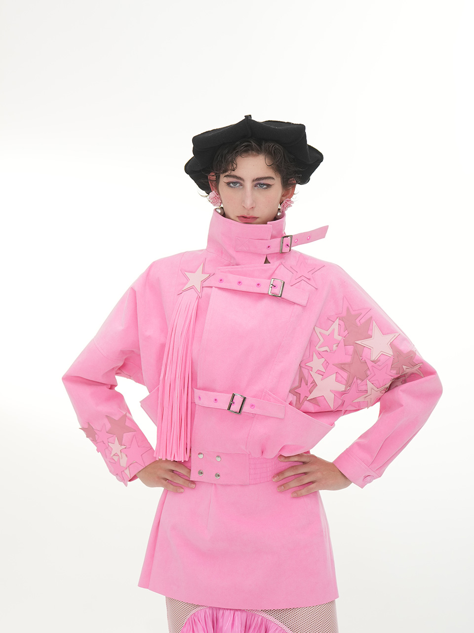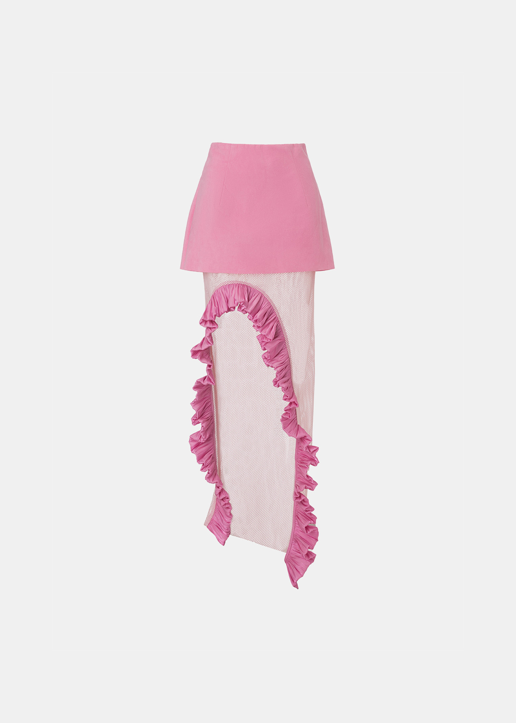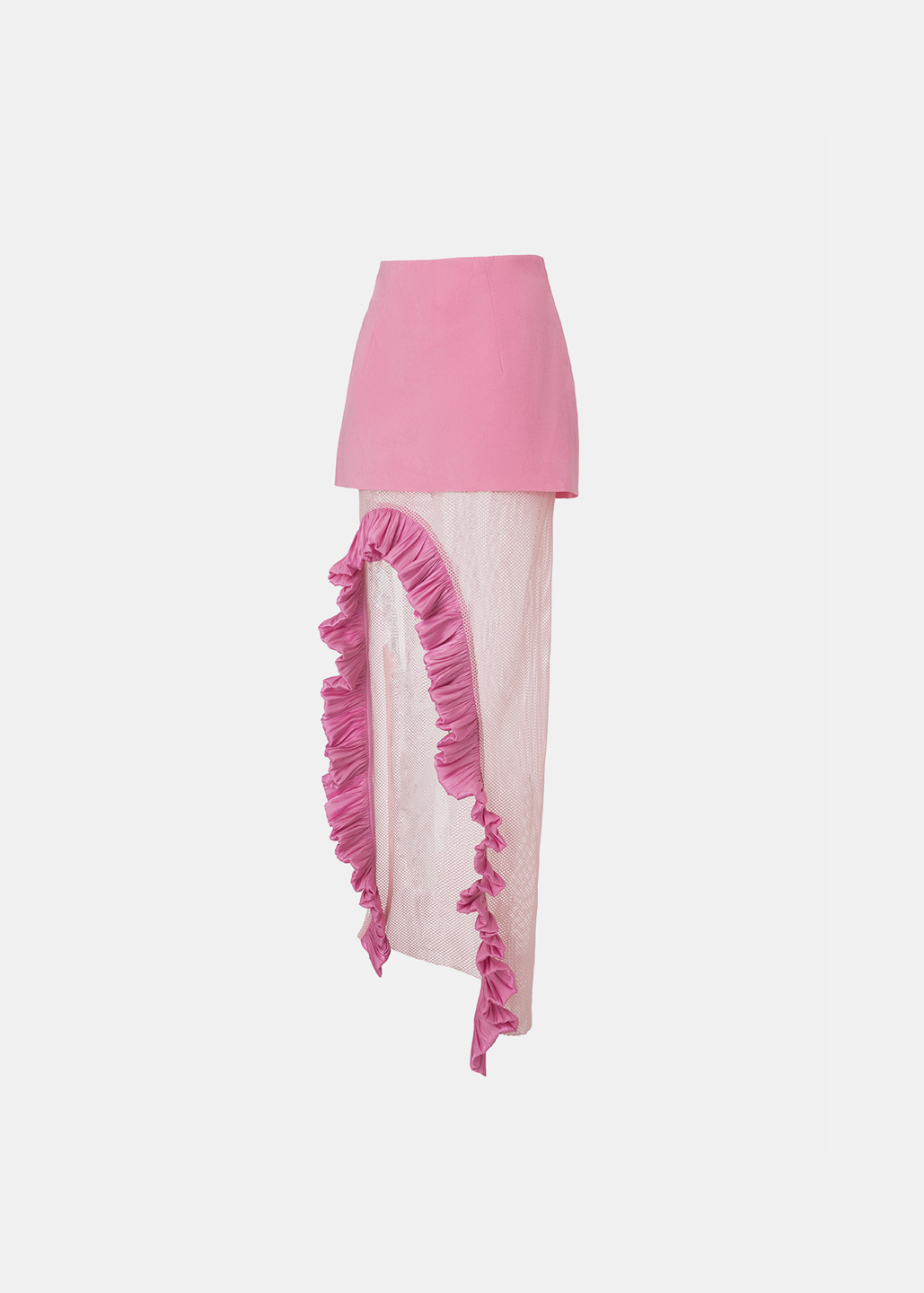 这款荷叶边双层裙选用粉色纸感廓型面料,挺括有型,赋予裙身利落的轮廓与时尚张力。内层搭配粉色网纱,点缀层层叠叠的荷叶边,轻盈灵动,仿佛春日绽放的花朵,浪漫而富有层次感。斜向剪裁巧妙露出修长腿部线条,拉长身材比例,既展现年轻活力,又充满先锋时尚态度。