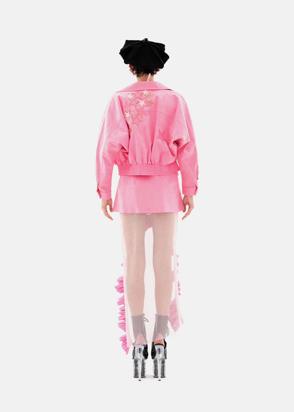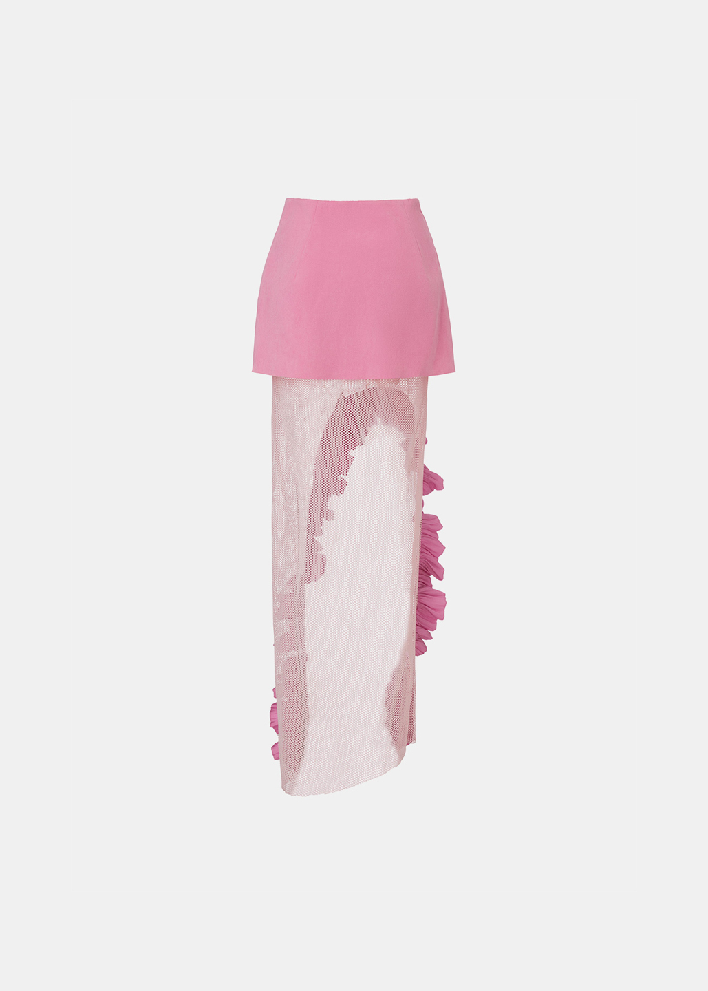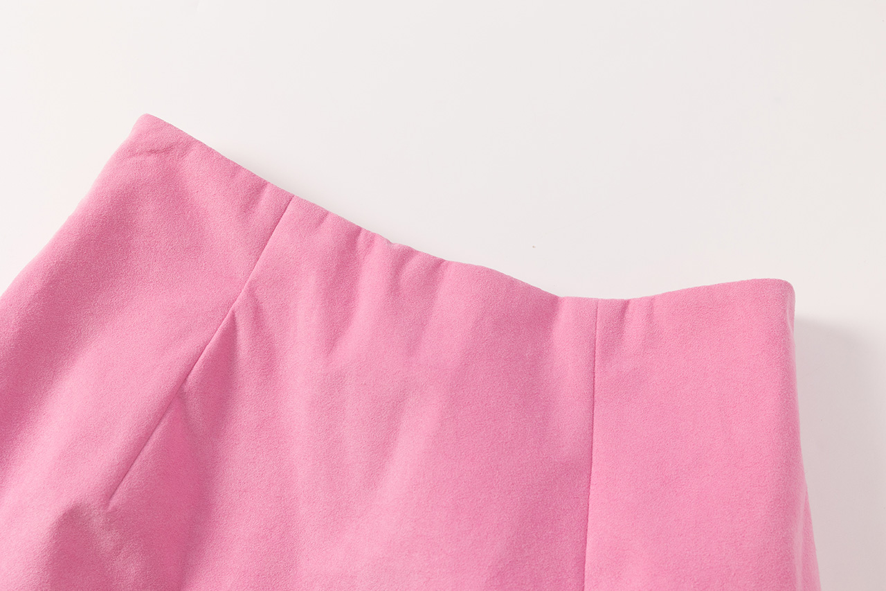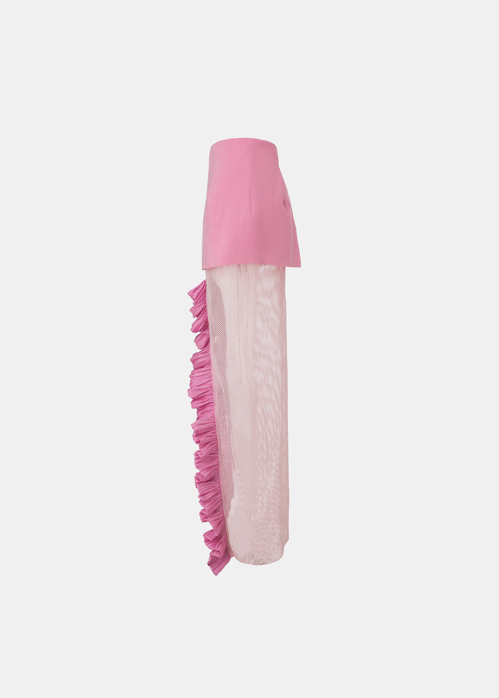 这款荷叶边双层裙选用粉色纸感廓型面料,挺括有型,赋予裙身利落的轮廓与时尚张力。内层搭配粉色网纱,点缀层层叠叠的荷叶边,轻盈灵动,仿佛春日绽放的花朵,浪漫而富有层次感。斜向剪裁巧妙露出修长腿部线条,拉长身材比例,既展现年轻活力,又充满先锋时尚态度。