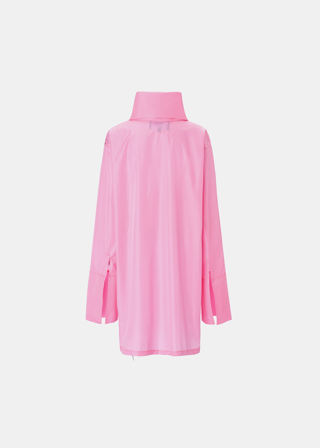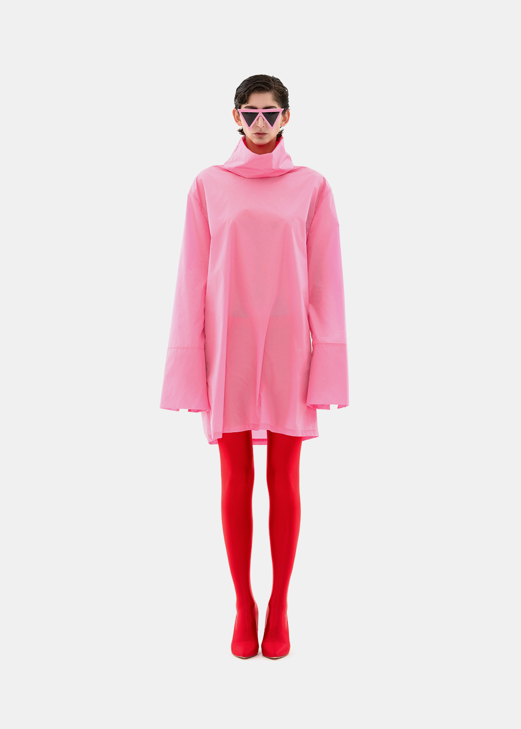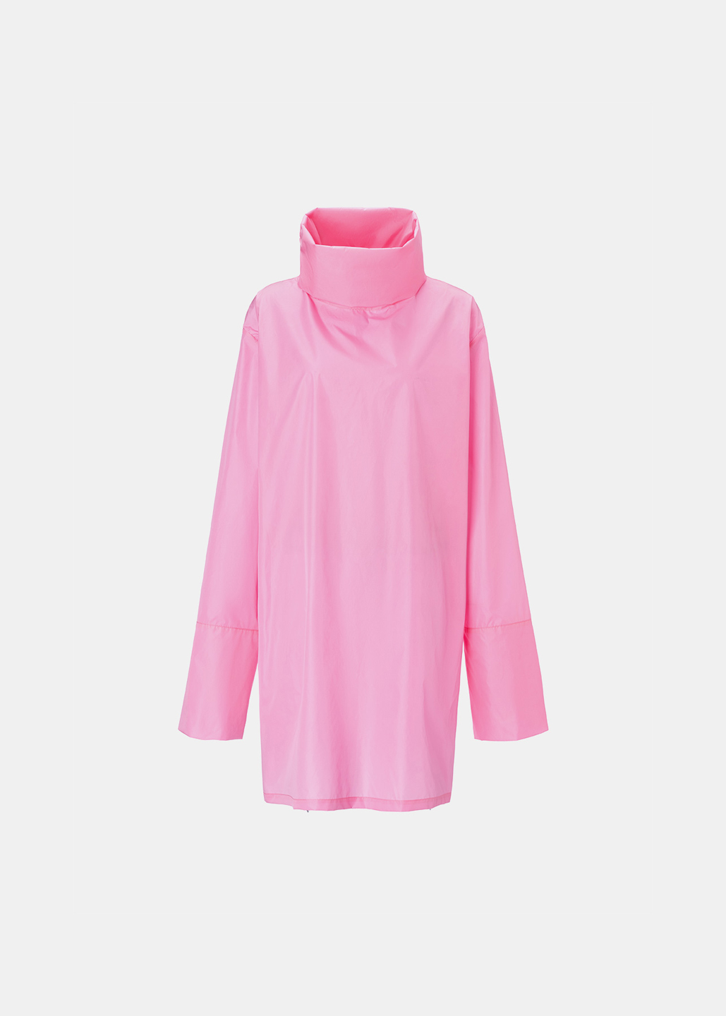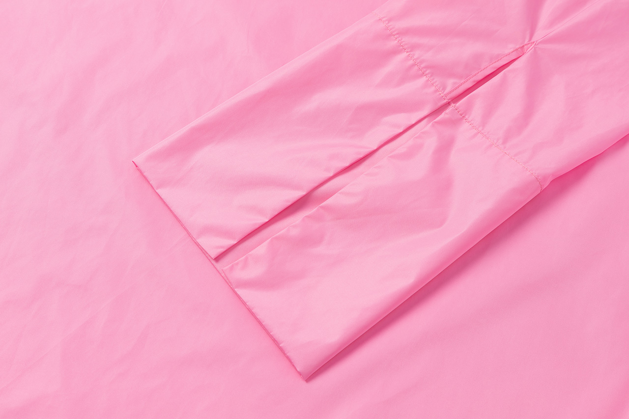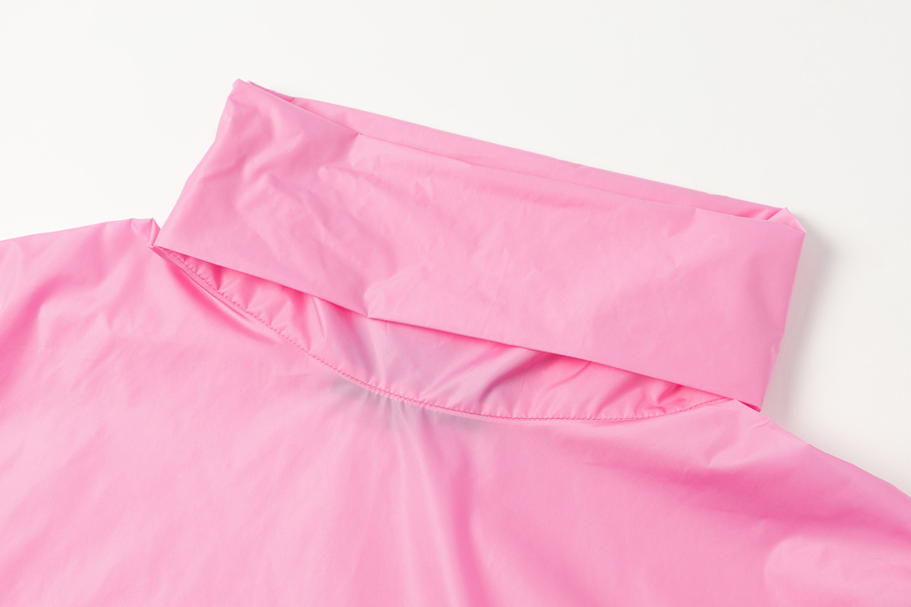 这款粉红卫衣,选用雨衣面料,折射独特光泽,高领剪裁利落干练。袖口长卡夫与主体面料呼应,风格和谐统一。摒弃繁复装饰,回归纯粹本质,彰显面料质感与简约设计之美。