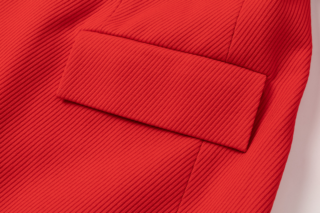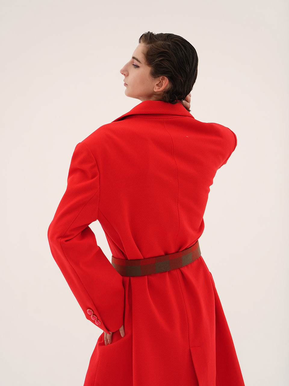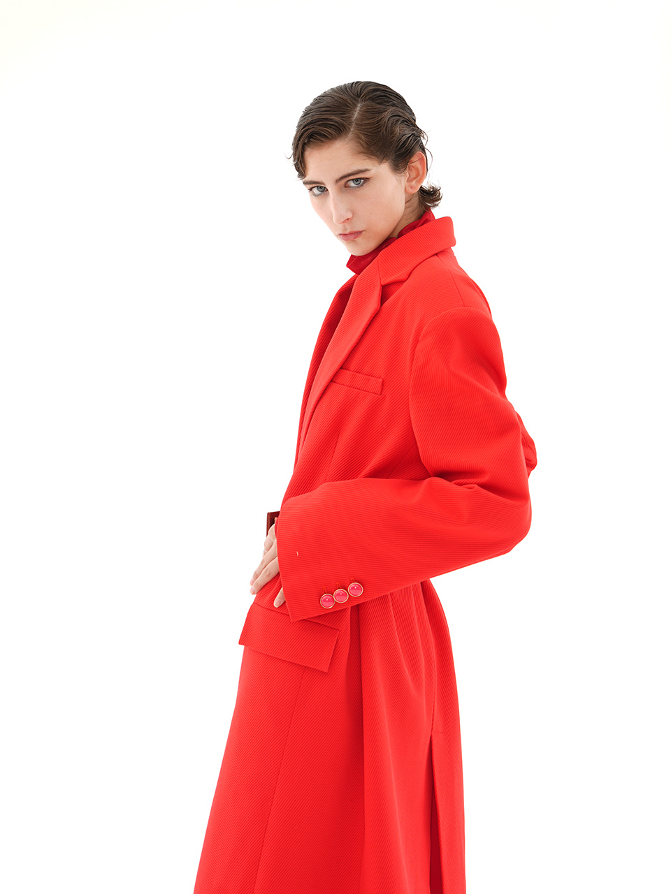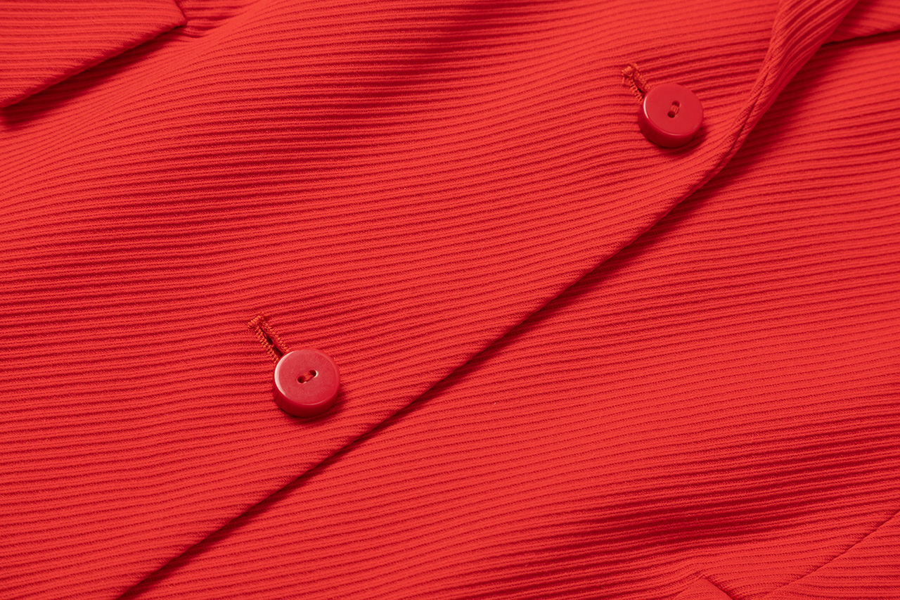 这款红色大衣,采用斜纹优质全棉面料,质感细腻且挺括有型,赋予整体高级大气的风范。宽肩设计强化肩部线条,展现出强大的气场与力量感,既帅气又充满自信。红色立体纽扣点缀其间,成为点睛之笔,为整体增添了一抹精致与层次感。整体设计既保留了经典大衣的干练气质,又通过细节的雕琢,彰显现代时尚的张力。