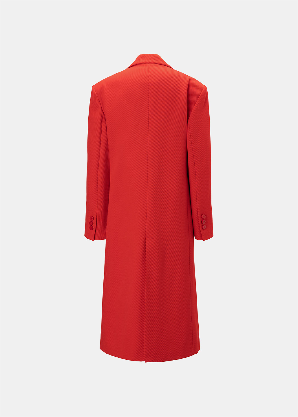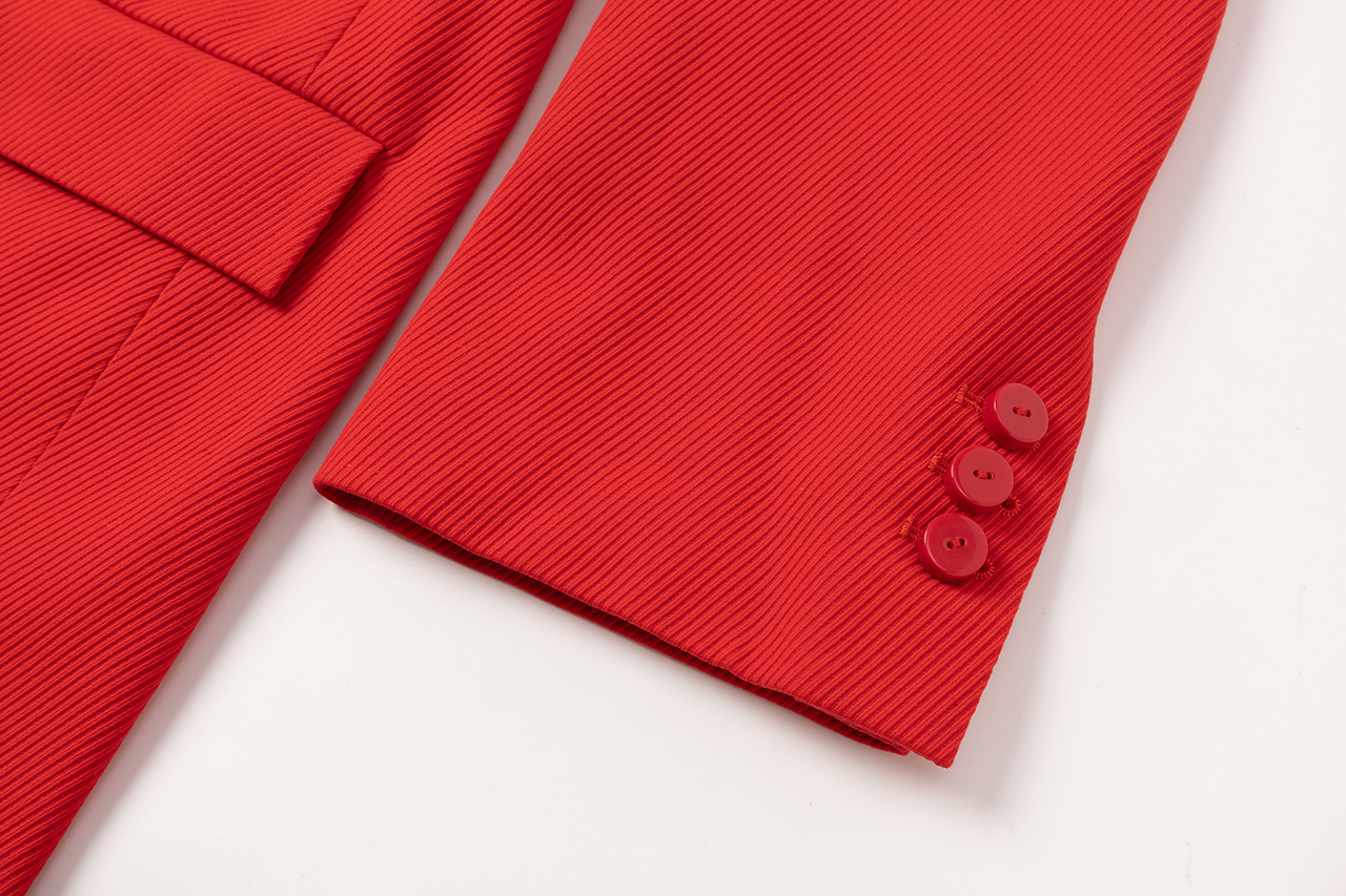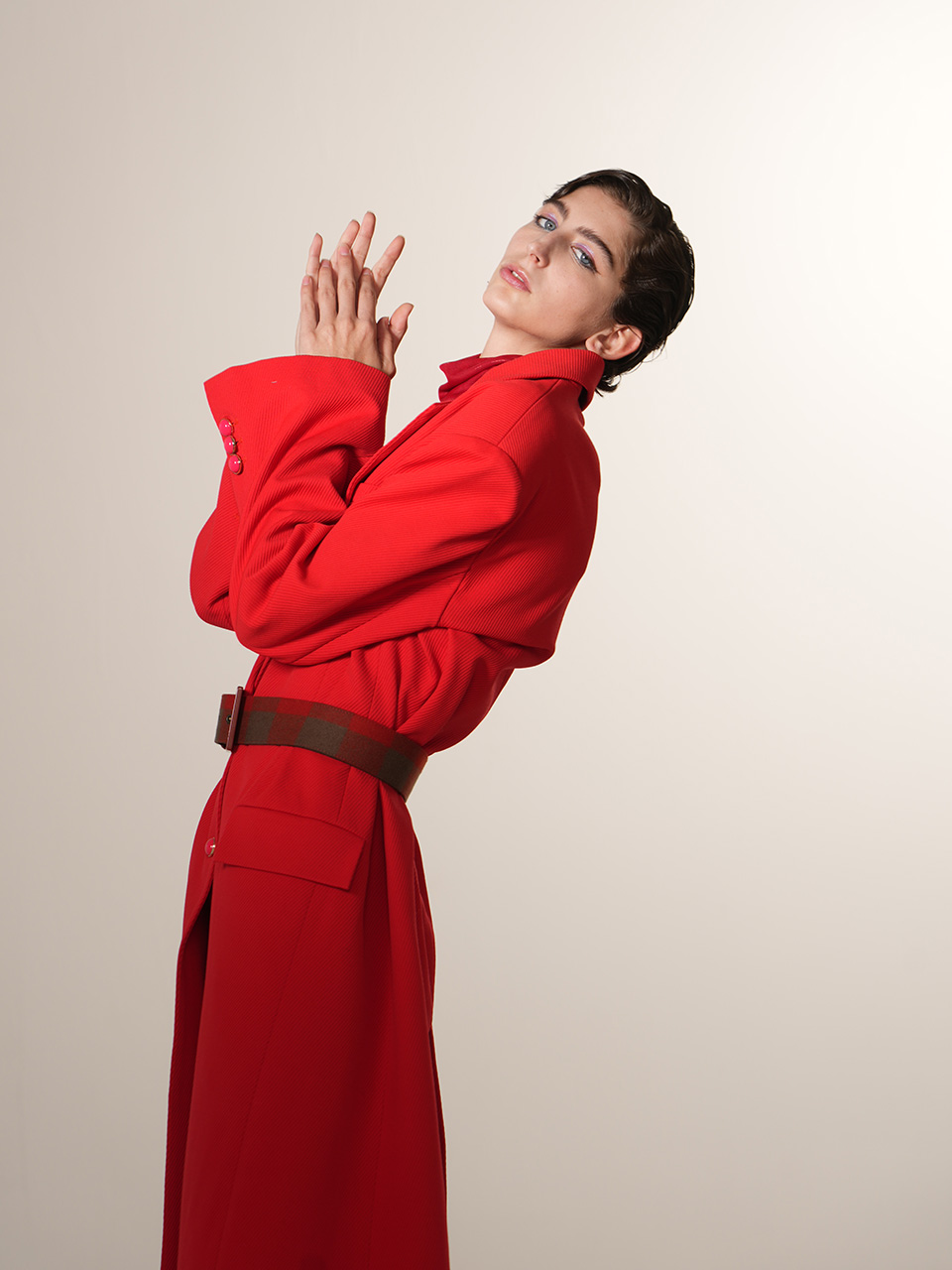 这款红色大衣,采用斜纹优质全棉面料,质感细腻且挺括有型,赋予整体高级大气的风范。宽肩设计强化肩部线条,展现出强大的气场与力量感,既帅气又充满自信。红色立体纽扣点缀其间,成为点睛之笔,为整体增添了一抹精致与层次感。整体设计既保留了经典大衣的干练气质,又通过细节的雕琢,彰显现代时尚的张力。