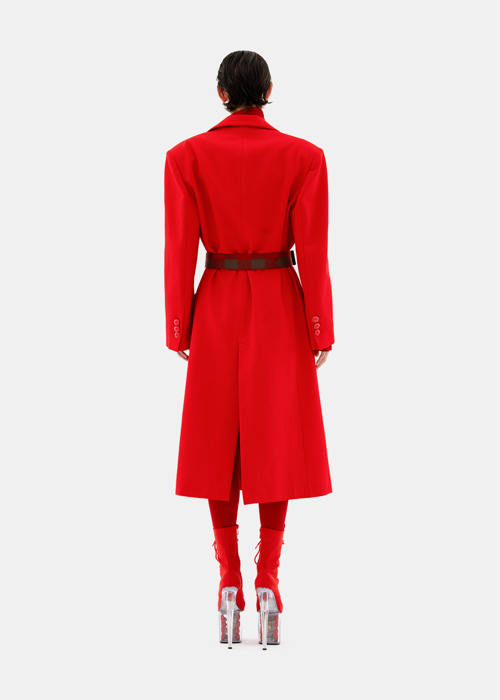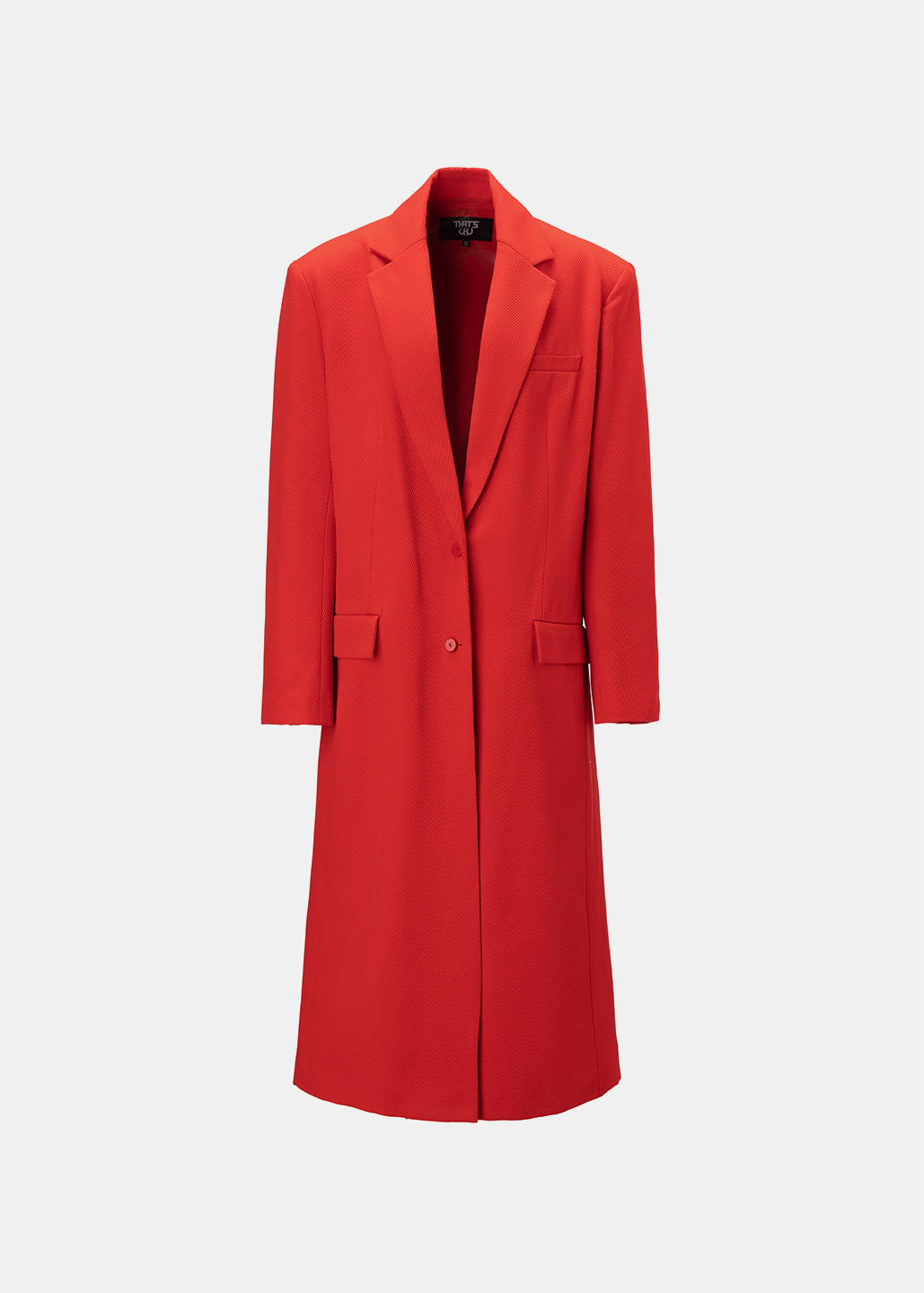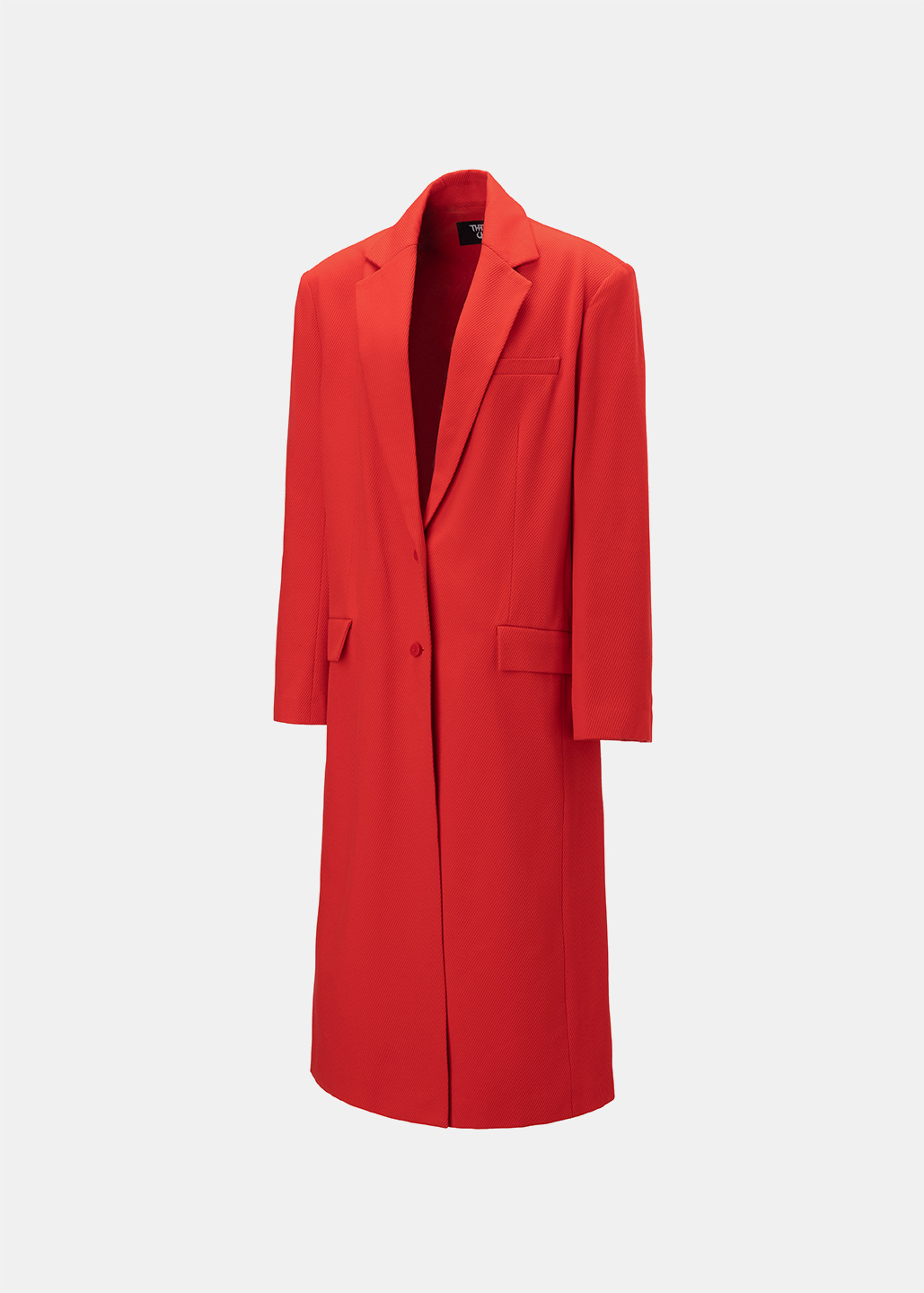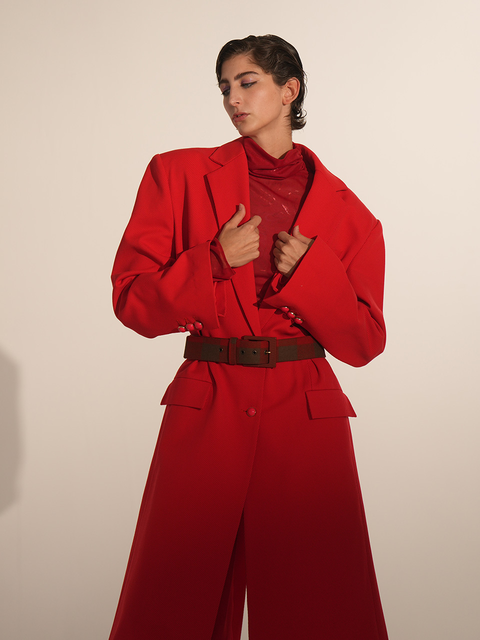 这款红色大衣,采用斜纹优质全棉面料,质感细腻且挺括有型,赋予整体高级大气的风范。宽肩设计强化肩部线条,展现出强大的气场与力量感,既帅气又充满自信。红色立体纽扣点缀其间,成为点睛之笔,为整体增添了一抹精致与层次感。整体设计既保留了经典大衣的干练气质,又通过细节的雕琢,彰显现代时尚的张力。