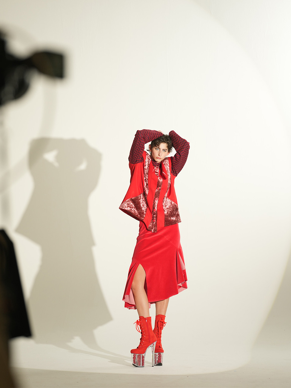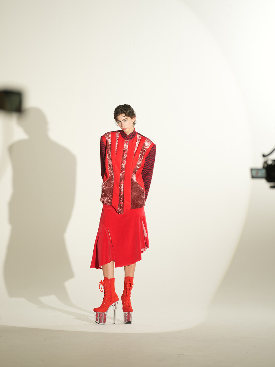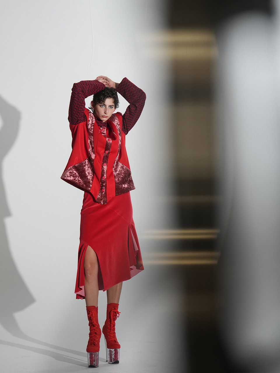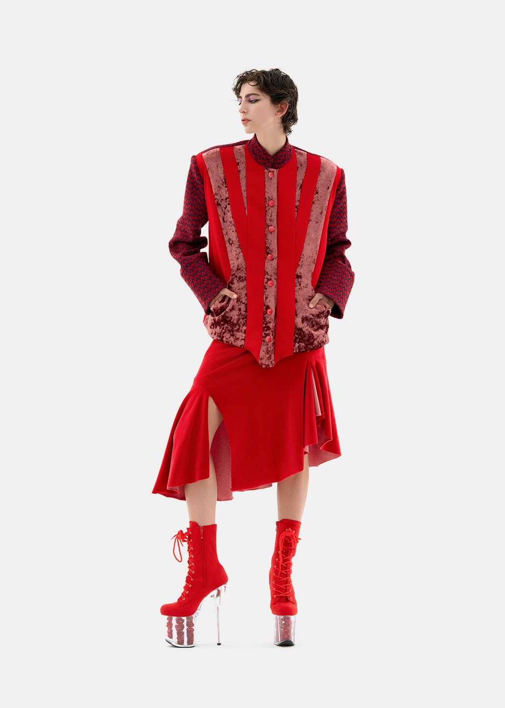 这款红色斜裁不规则开衩 裙,选用细腻的绒面面料, 触感柔软舒适,既温柔又充满热情。斜向剪裁与不规则 开衩设计,赋予裙身独特的 流动感与层次感,展现出不 羁与自由的态度。论是行走 时的灵动张扬,还是静立时 的温婉气质,仿佛将热情与 浪漫穿在身上,自由而洒脱。