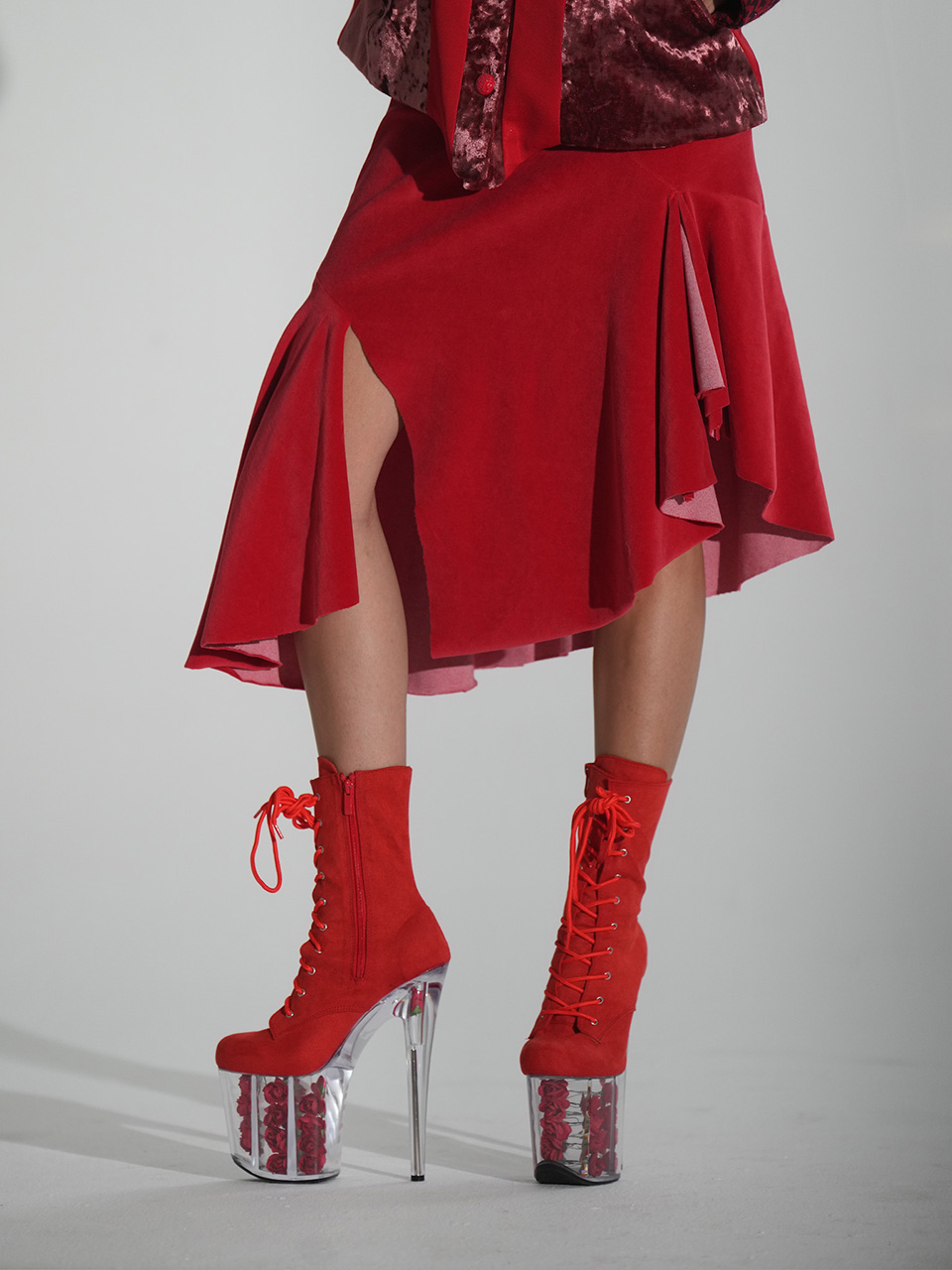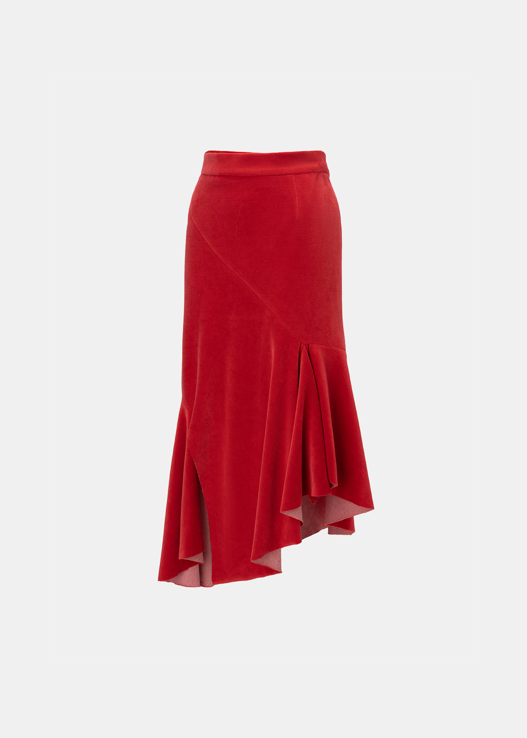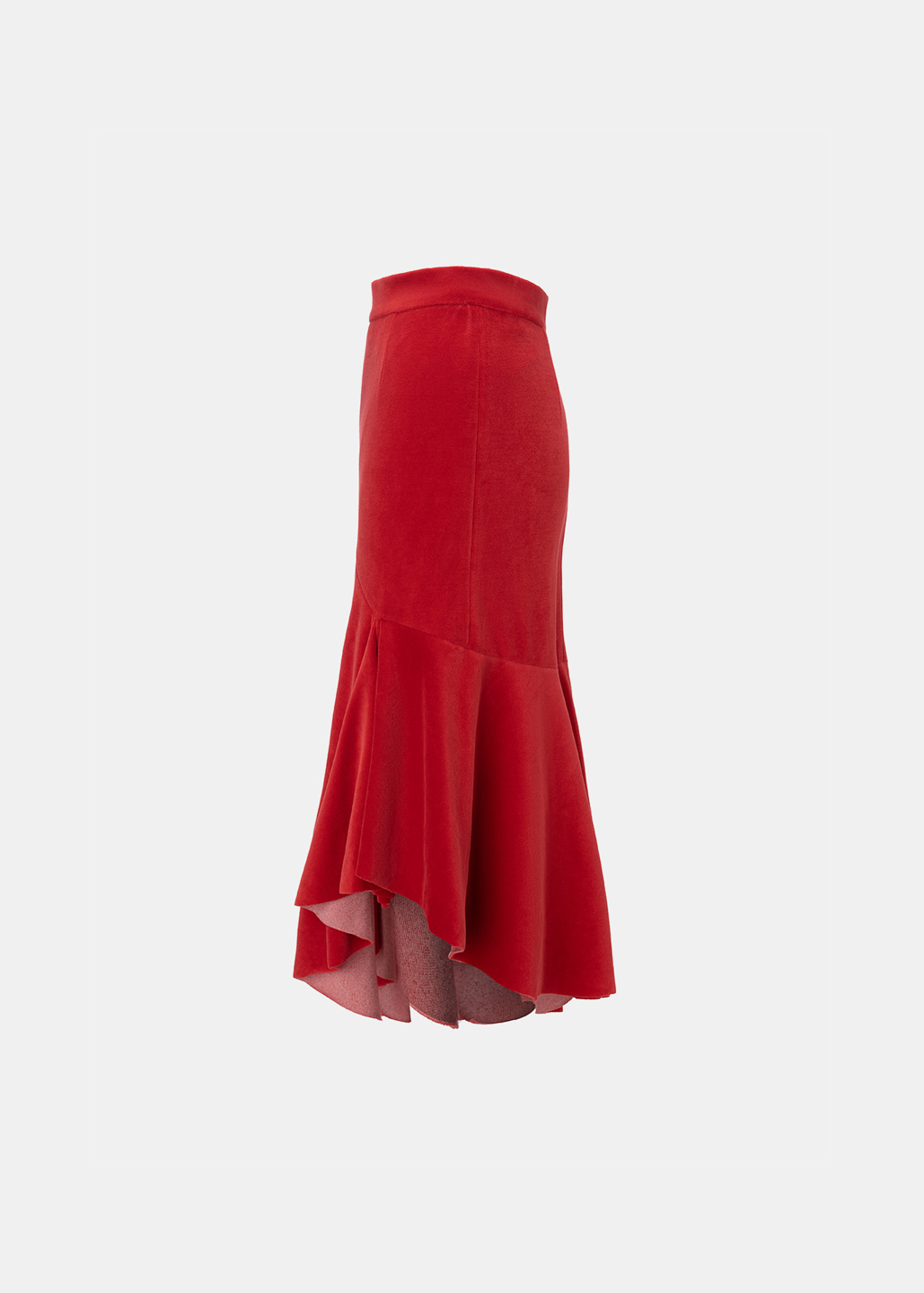 红色细绒开衩斜摆半裙