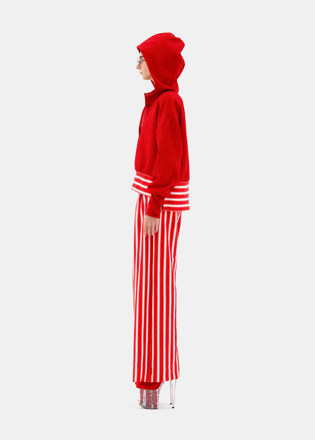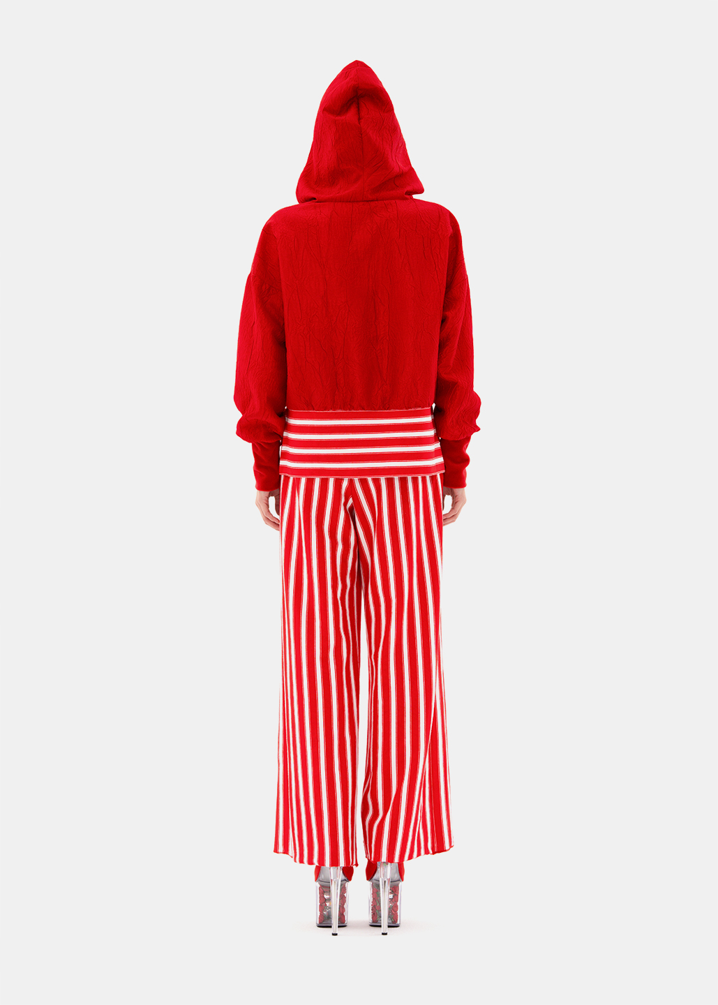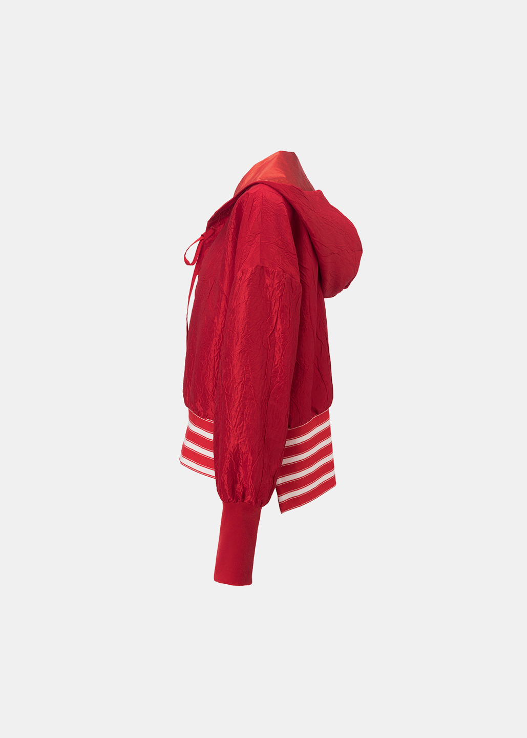 这款连帽卫衣采用压褶面料,轻盈舒适,赋予整体独特的纹理与层次感。打孔系带领口设计,既个性又充满细节感,下摆条纹设计,为整体增添了活力与时尚感。前后落差设计巧妙打造出立体轮廓,既有致又富有张力,展现出年轻态度的同时,又极具前卫与个性。