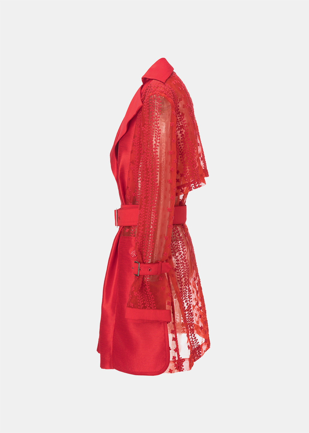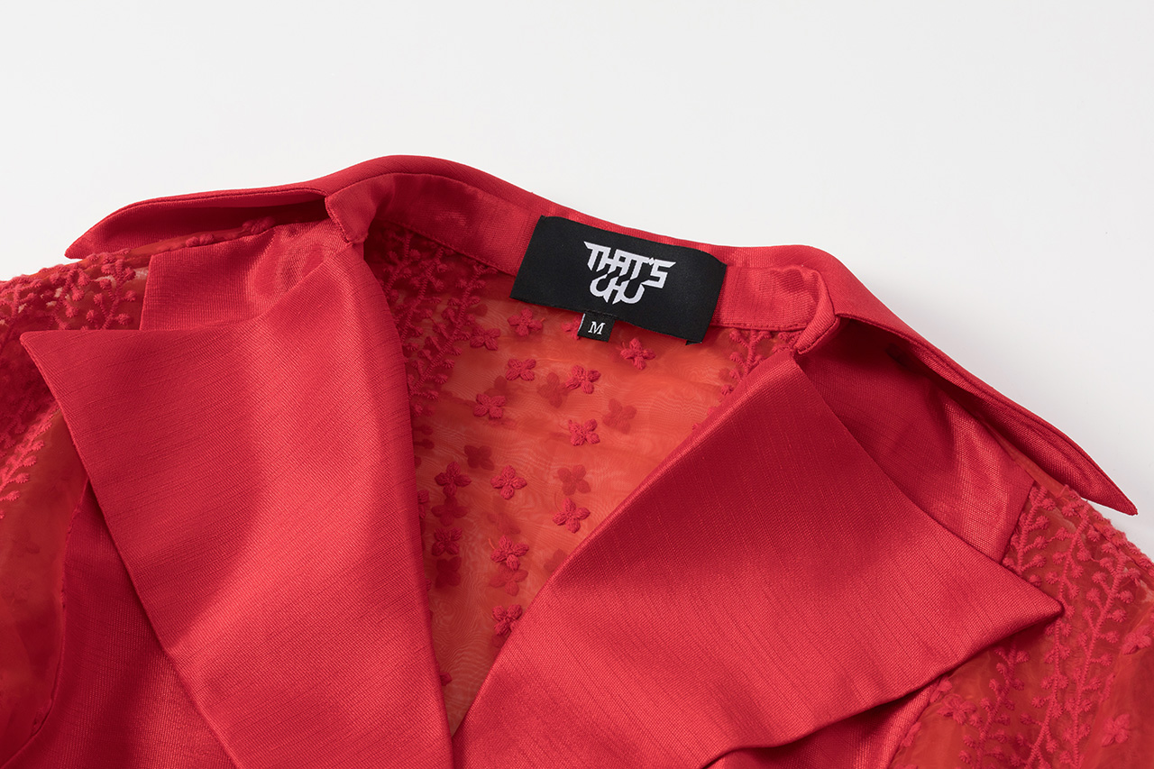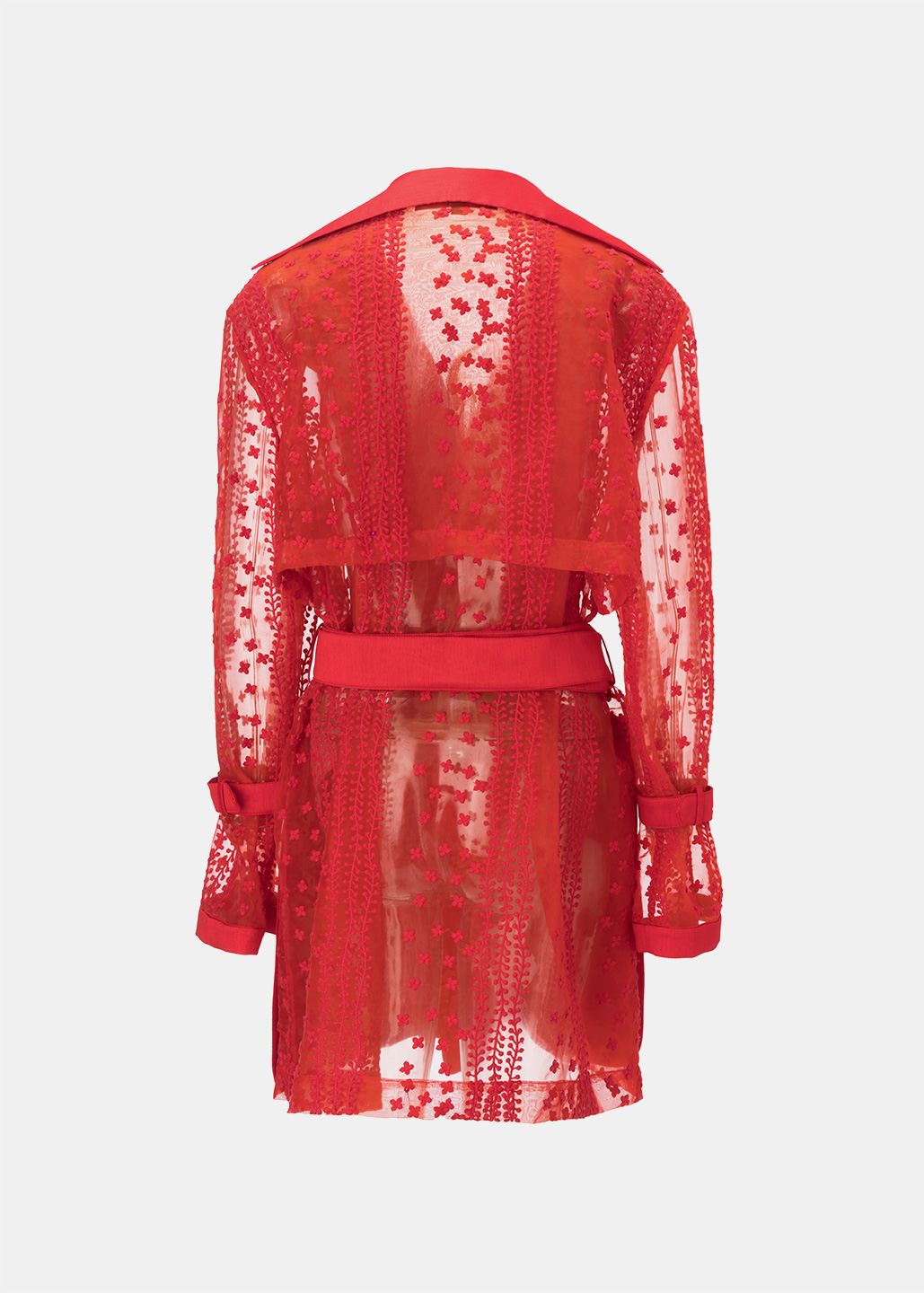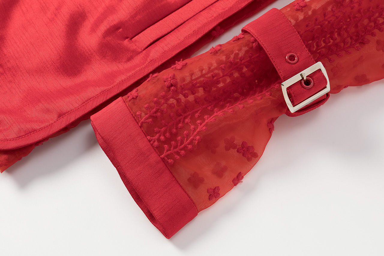 这款短款风衣以红色为主调,充满热情与张力,蕾丝纱拼接设计为整体注入性感与神秘感,半透效果既时尚又充满不羁态度。经典风衣的轮廓与解构主义的剪裁手法相结合,打破传统设计,赋予整体前卫与艺术感。既保留了风衣的干练气质,又通过蕾丝与解构的细节设计,展现出独特的个性与魅力。