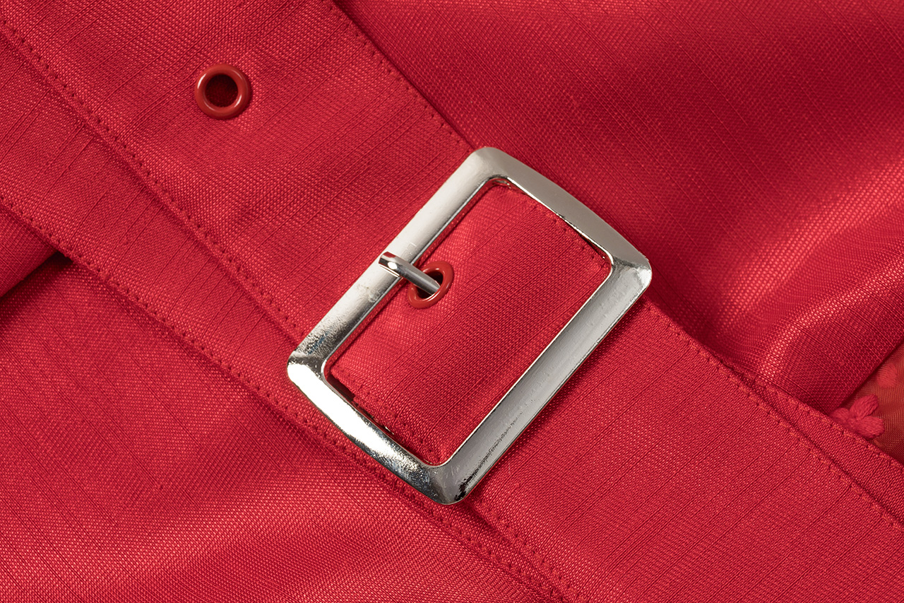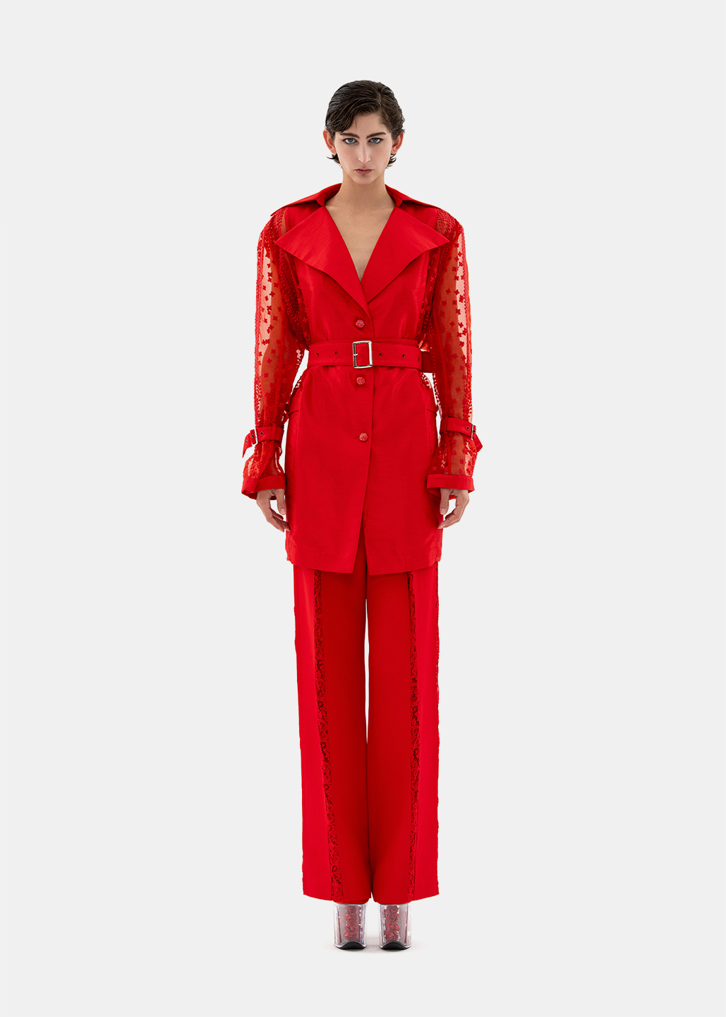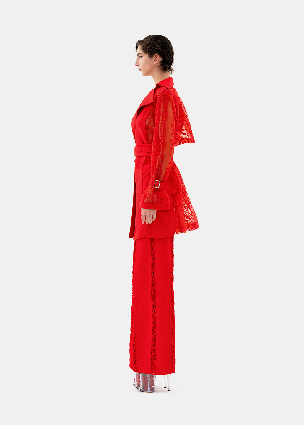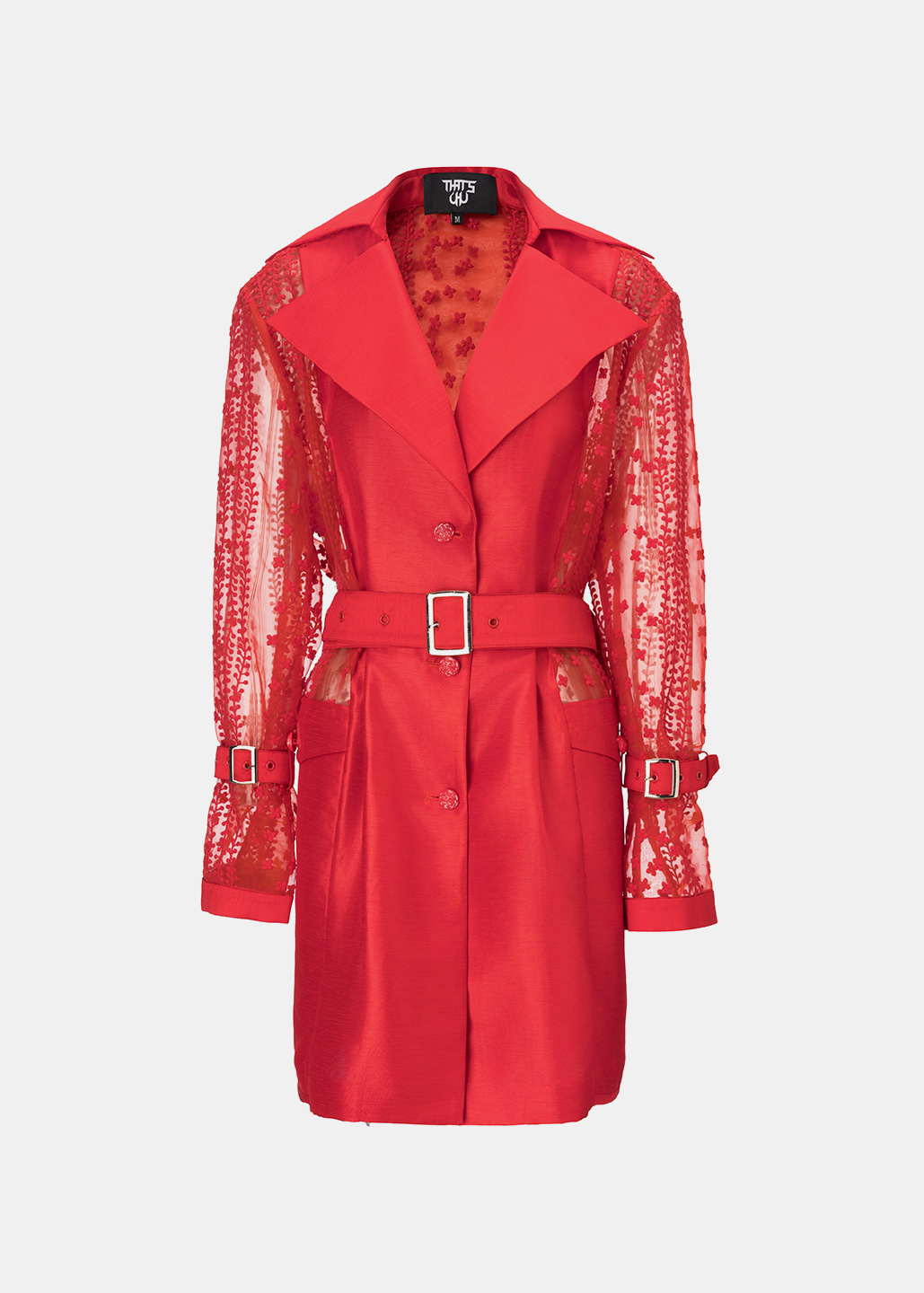 这款短款风衣以红色为主调,充满热情与张力,蕾丝纱拼接设计为整体注入性感与神秘感,半透效果既时尚又充满不羁态度。经典风衣的轮廓与解构主义的剪裁手法相结合,打破传统设计,赋予整体前卫与艺术感。既保留了风衣的干练气质,又通过蕾丝与解构的细节设计,展现出独特的个性与魅力。