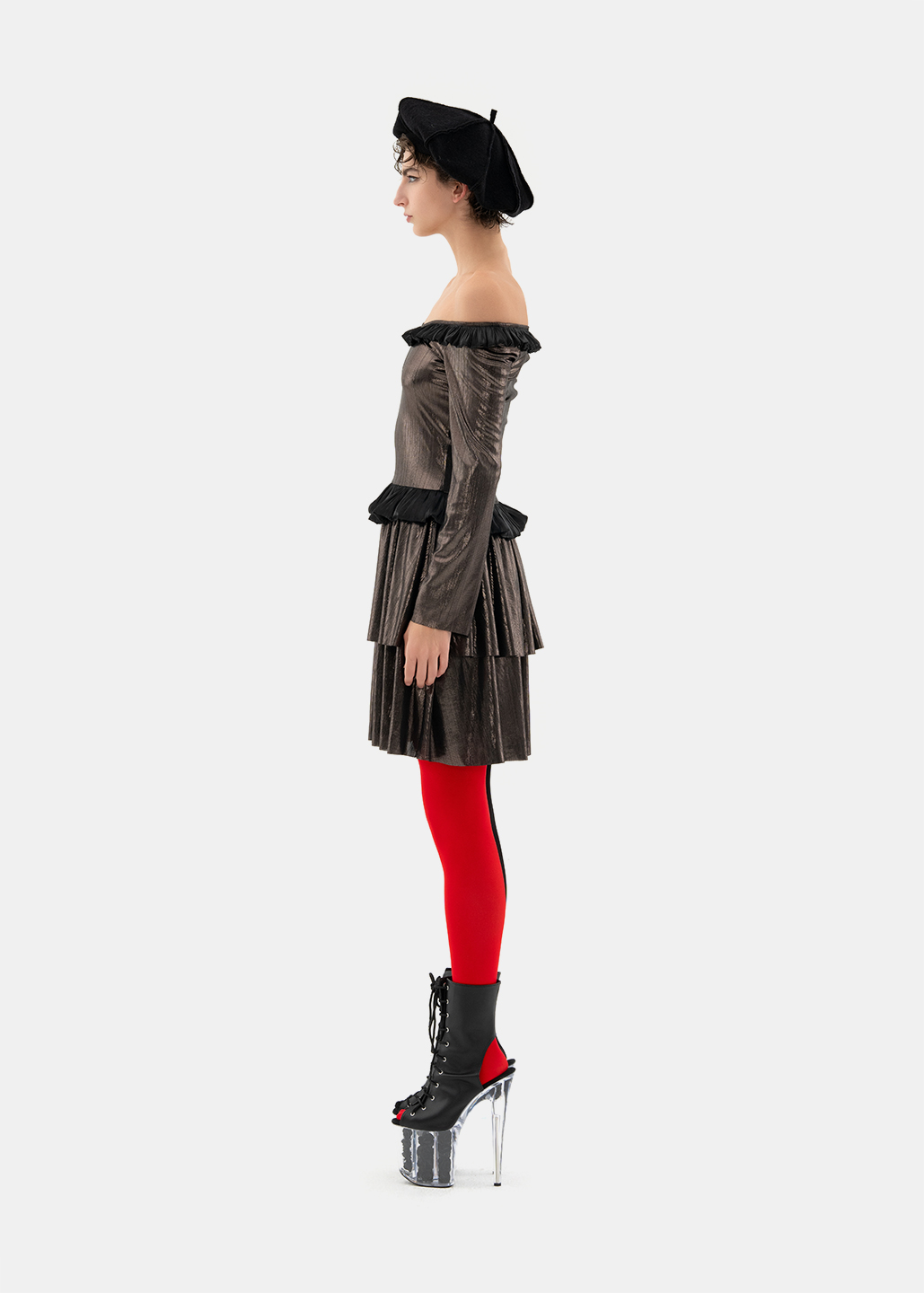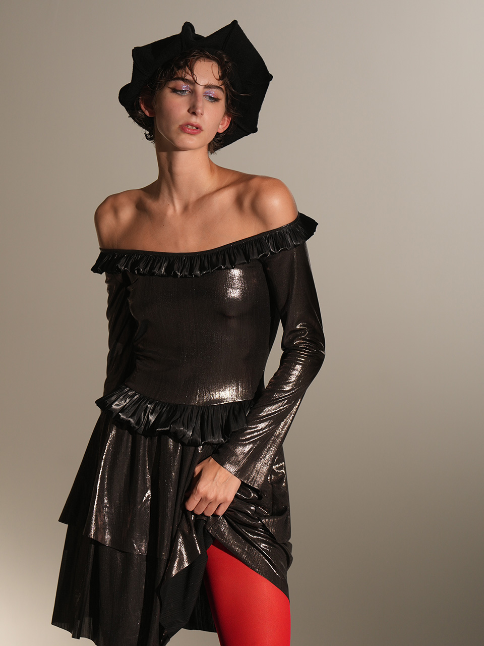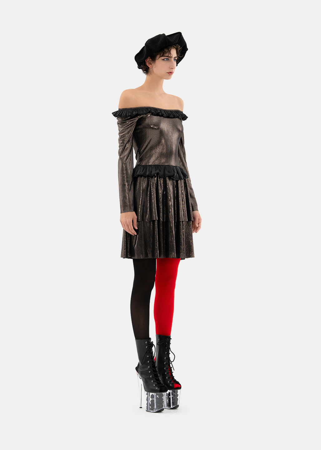 0084-L49-银黑荷叶边多层连衣裙