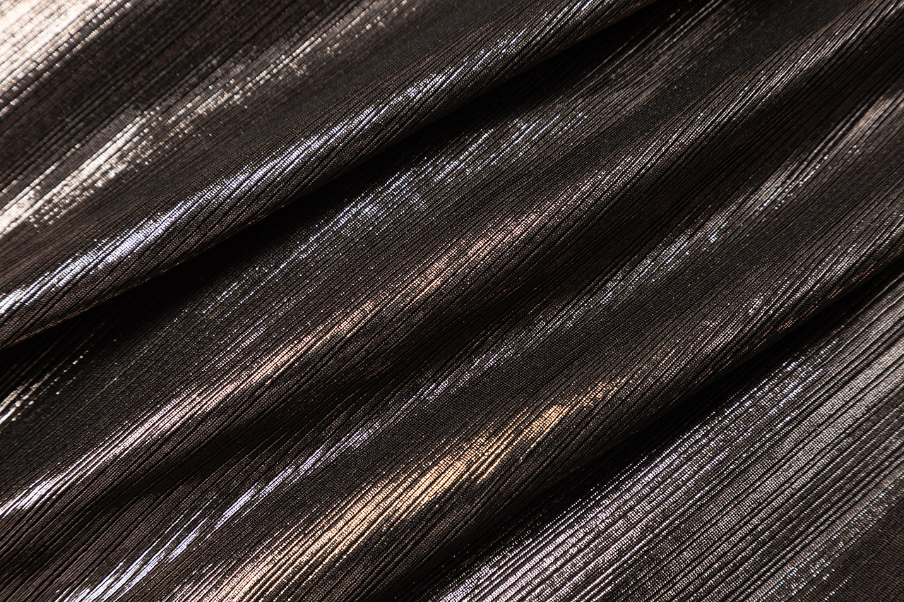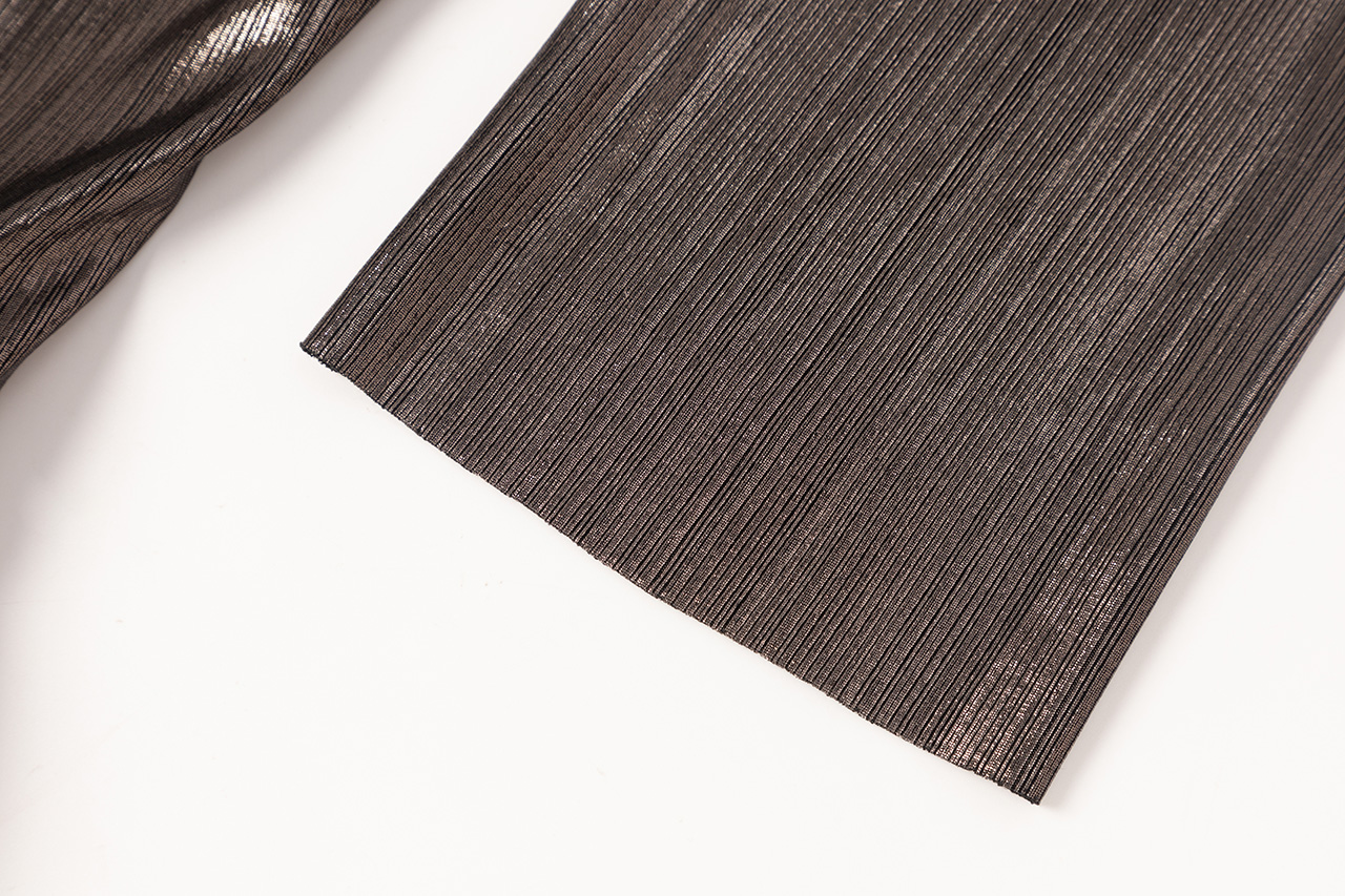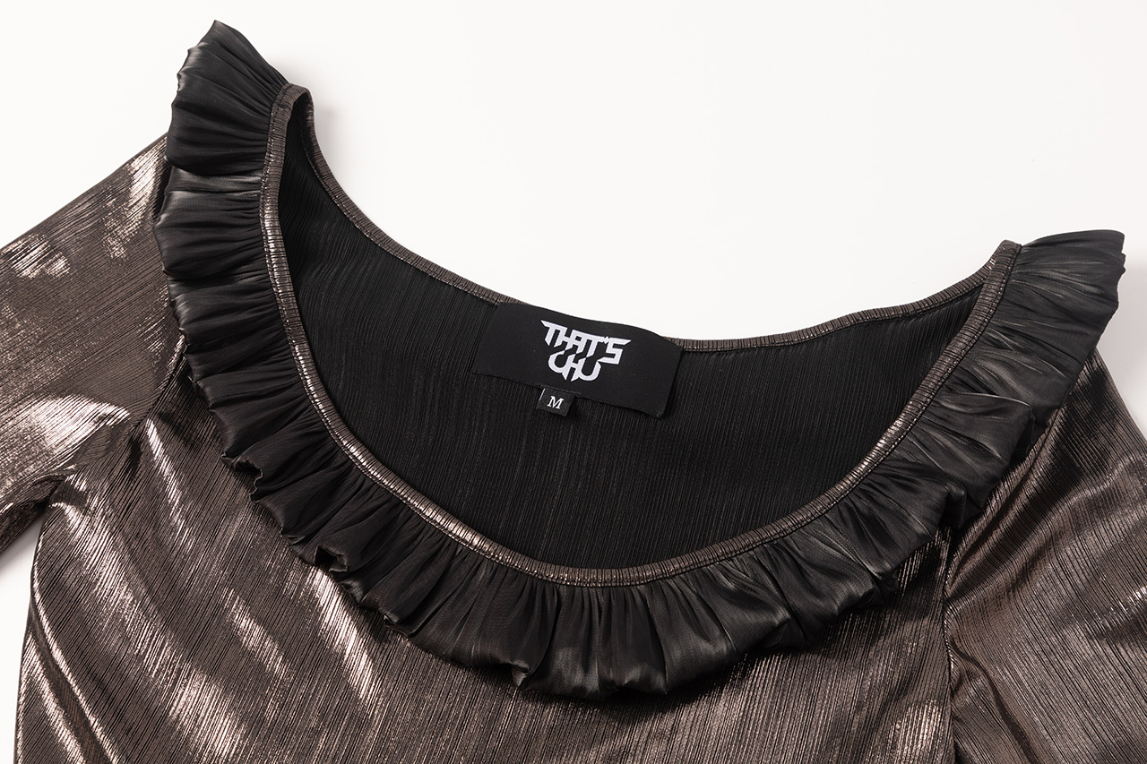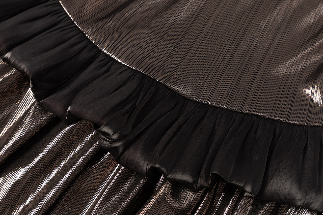 这款设计选用神秘银河般的 黑银面料,搭配蜿蜒黑色荷 叶边,如暗夜中绽放的神秘之花,深邃而魅惑。荷叶边 纹理精致,为领口增添层次 感,修饰颈部线条,尽显优 雅。腰部荷叶边勾勒身材曲 线,既似精美腰带增添时尚 感,又自然衔接上下身,使 造型流畅和谐,神秘而迷人