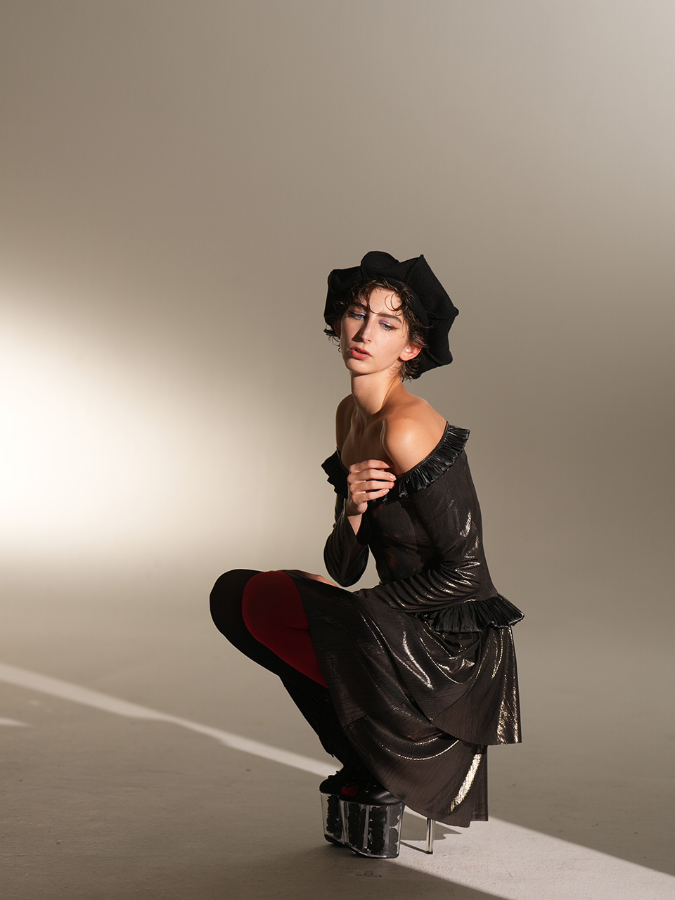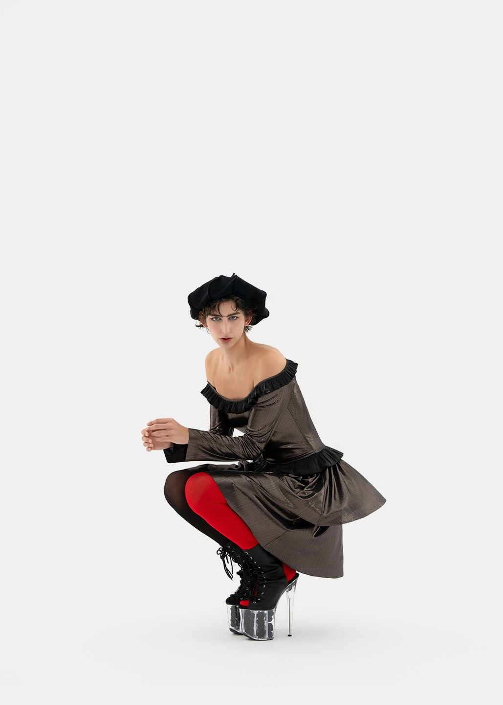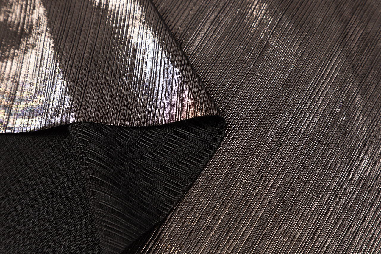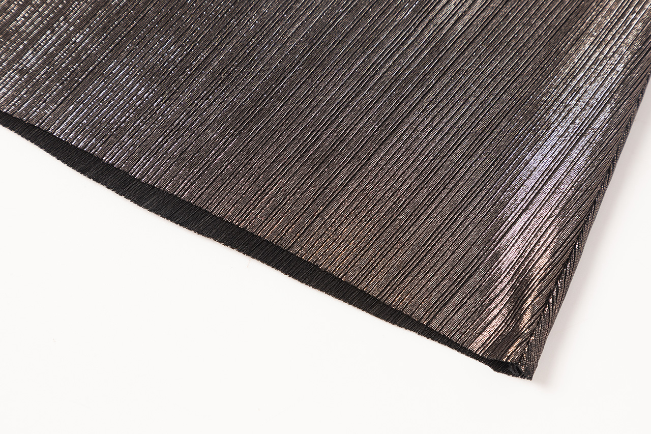这款设计选用神秘银河般的 黑银面料,搭配蜿蜒黑色荷 叶边,如暗夜中绽放的神秘之花,深邃而魅惑。荷叶边 纹理精致,为领口增添层次 感,修饰颈部线条,尽显优 雅。腰部荷叶边勾勒身材曲 线,既似精美腰带增添时尚 感,又自然衔接上下身,使 造型流畅和谐,神秘而迷人