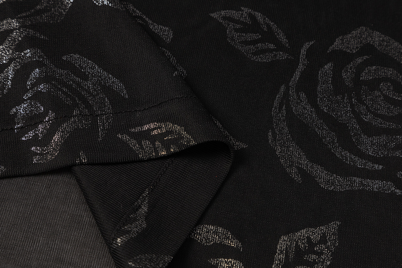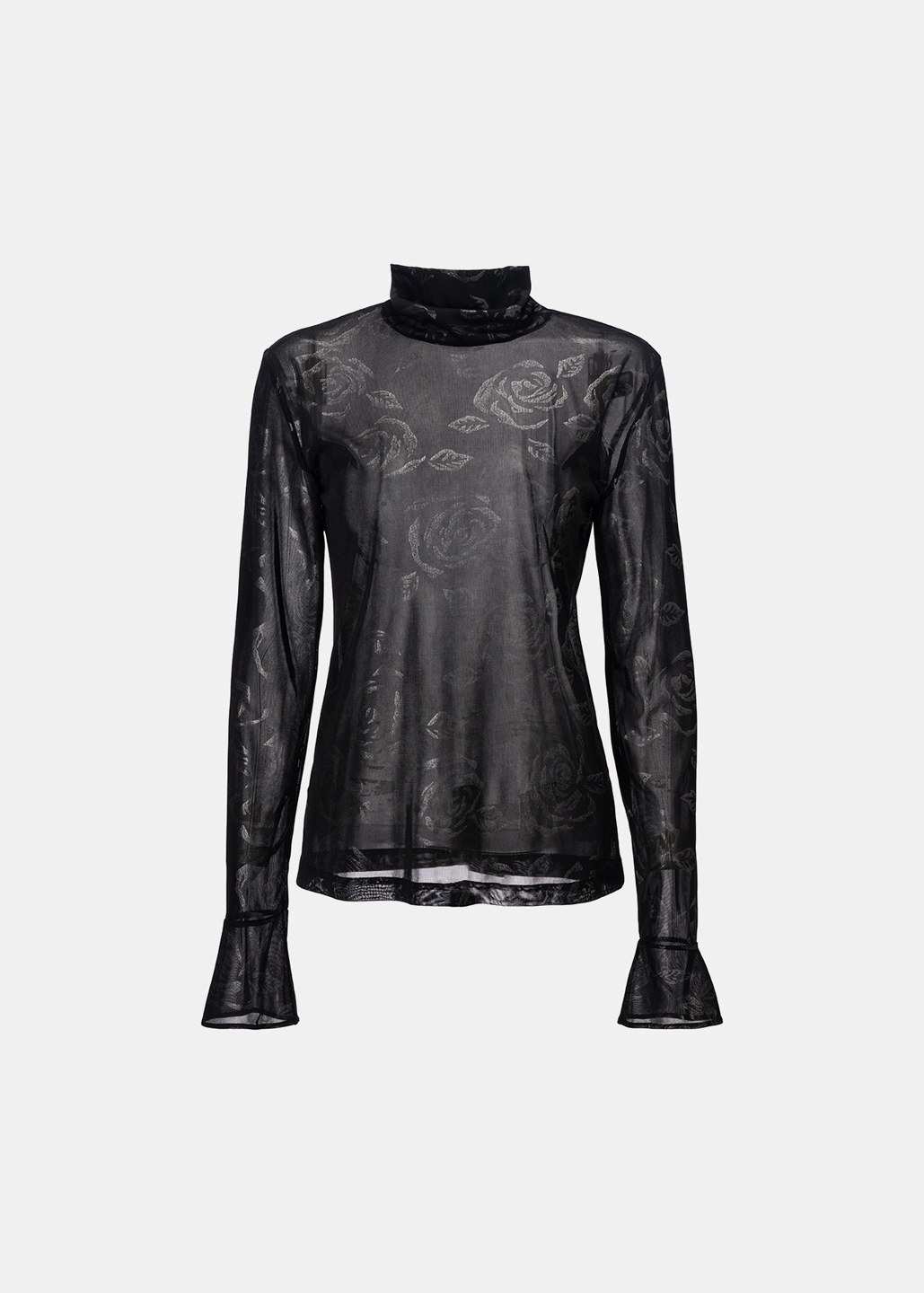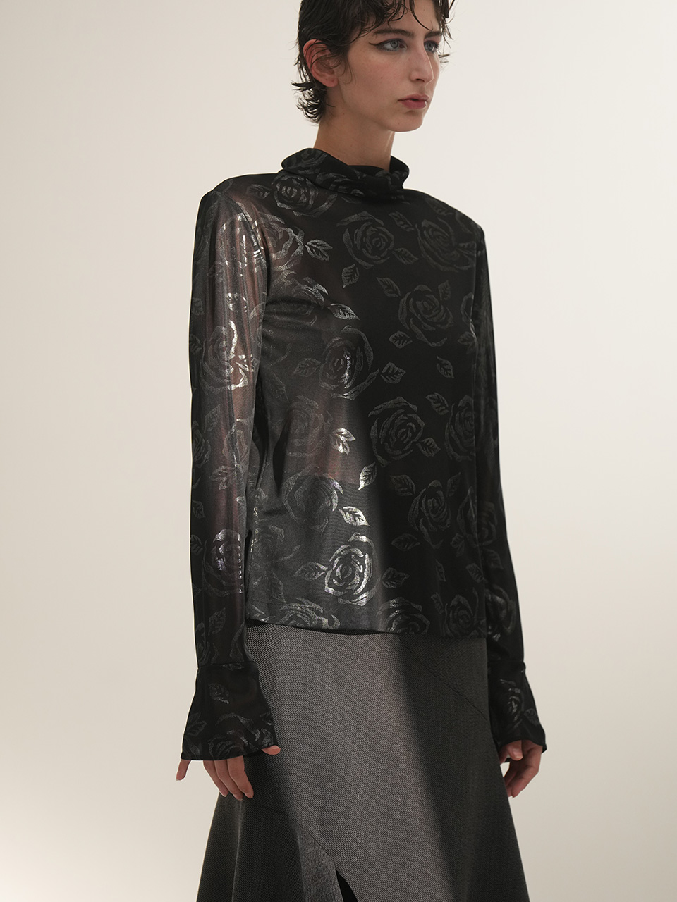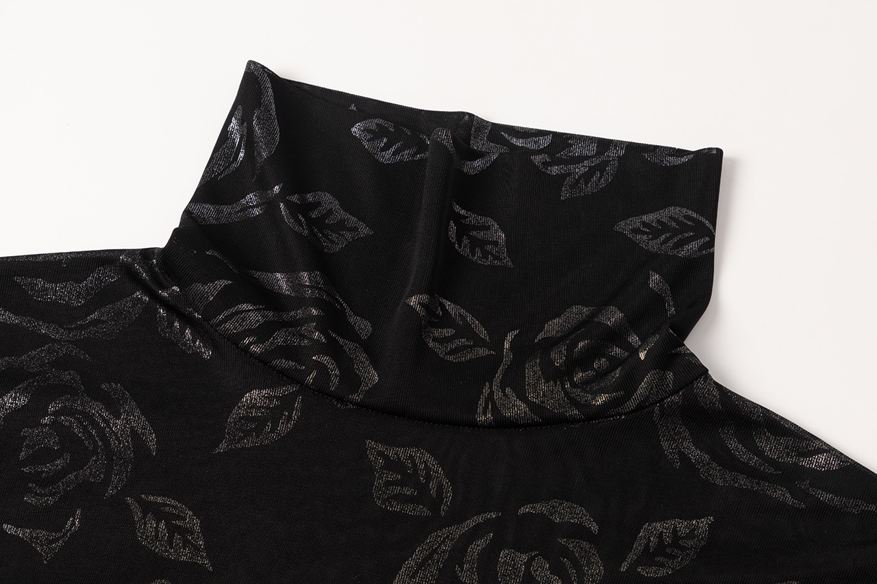 这款高领上衣以黑底银花为基调,低调而富有艺术感。喇叭袖口优雅灵动,剪裁易于穿搭,实用且时尚。银花图案与喇叭袖的融合,传递出独特的艺术魅力,既高级又充满创意,展现别具一格的品味。