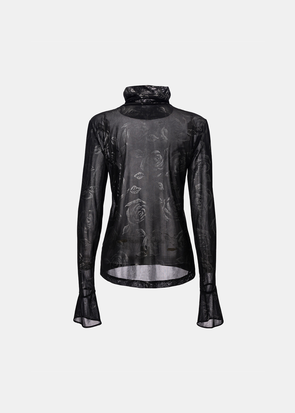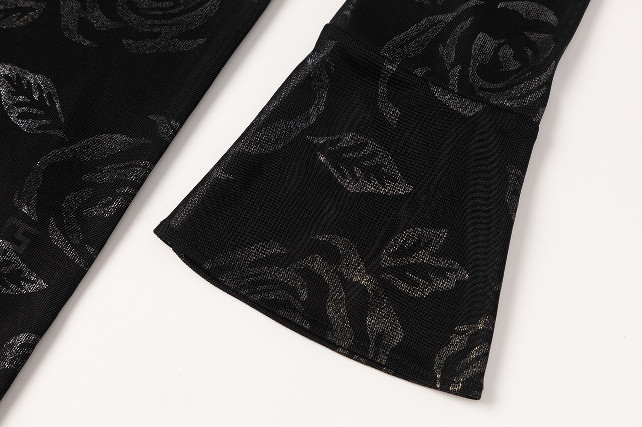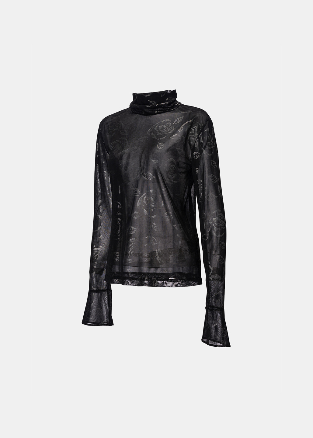 这款高领上衣以黑底银花为基调,低调而富有艺术感。喇叭袖口优雅灵动,剪裁易于穿搭,实用且时尚。银花图案与喇叭袖的融合,传递出独特的艺术魅力,既高级又充满创意,展现别具一格的品味。