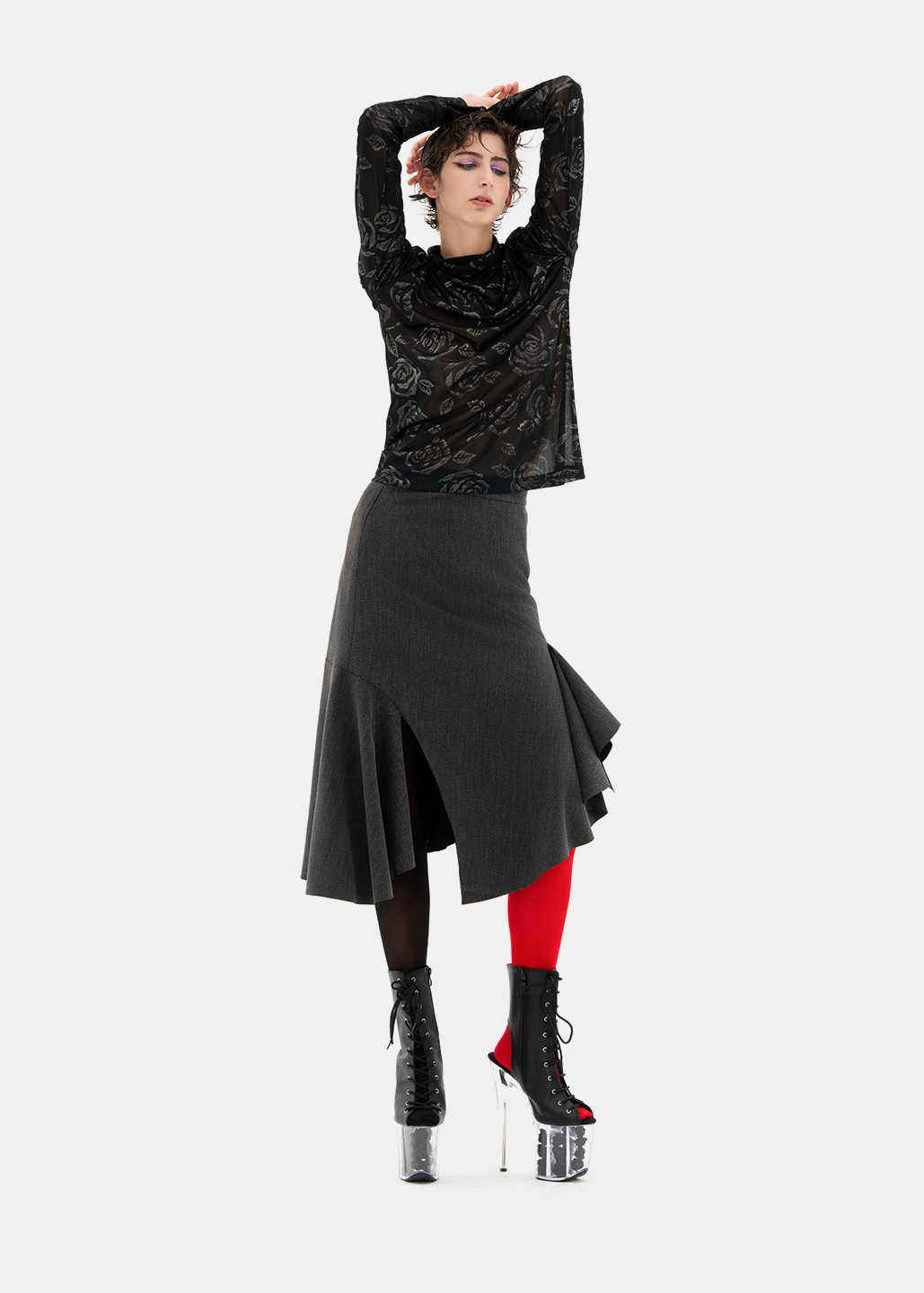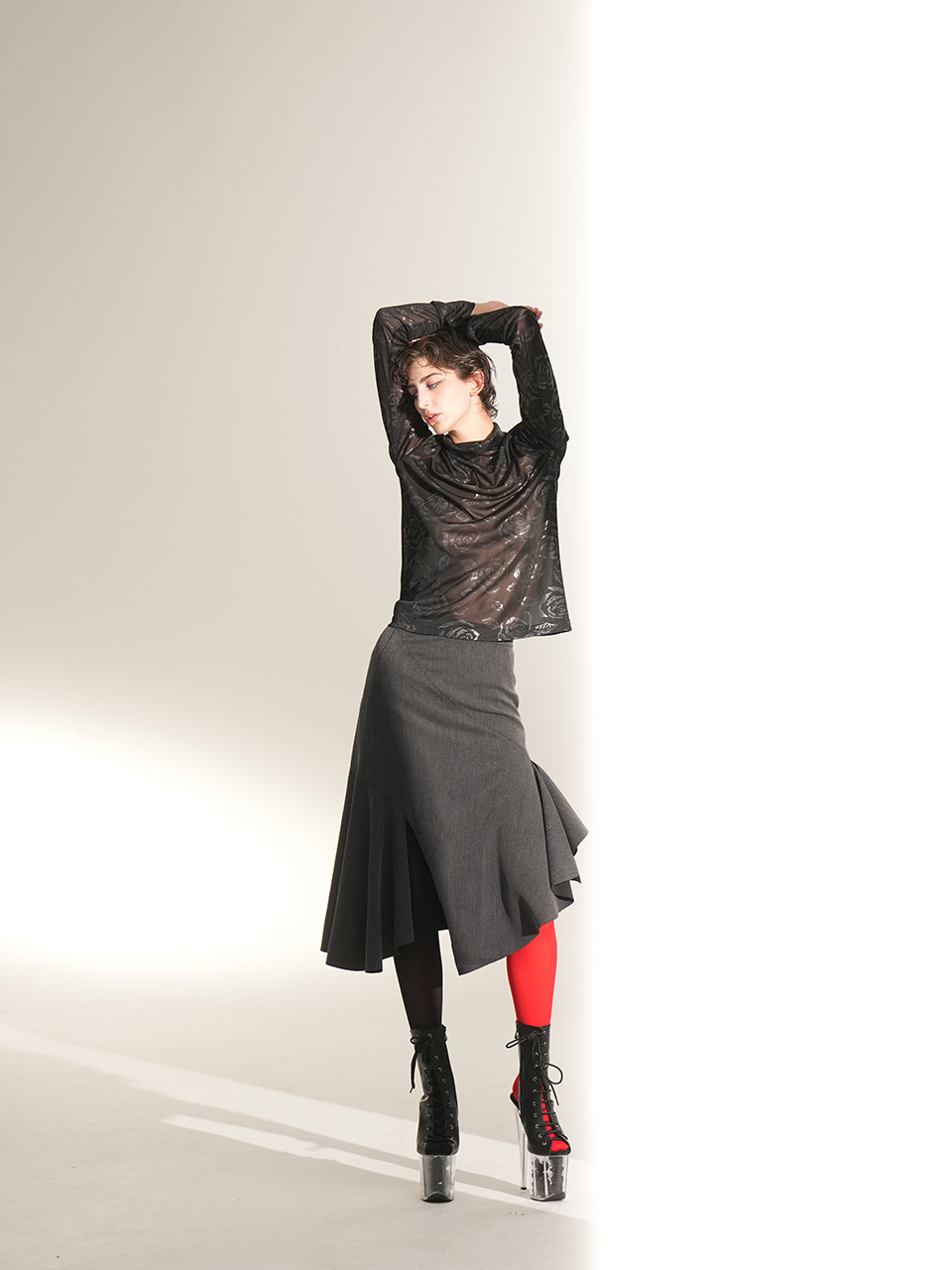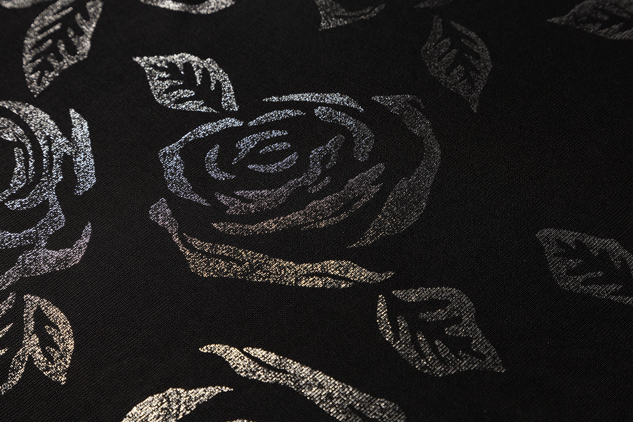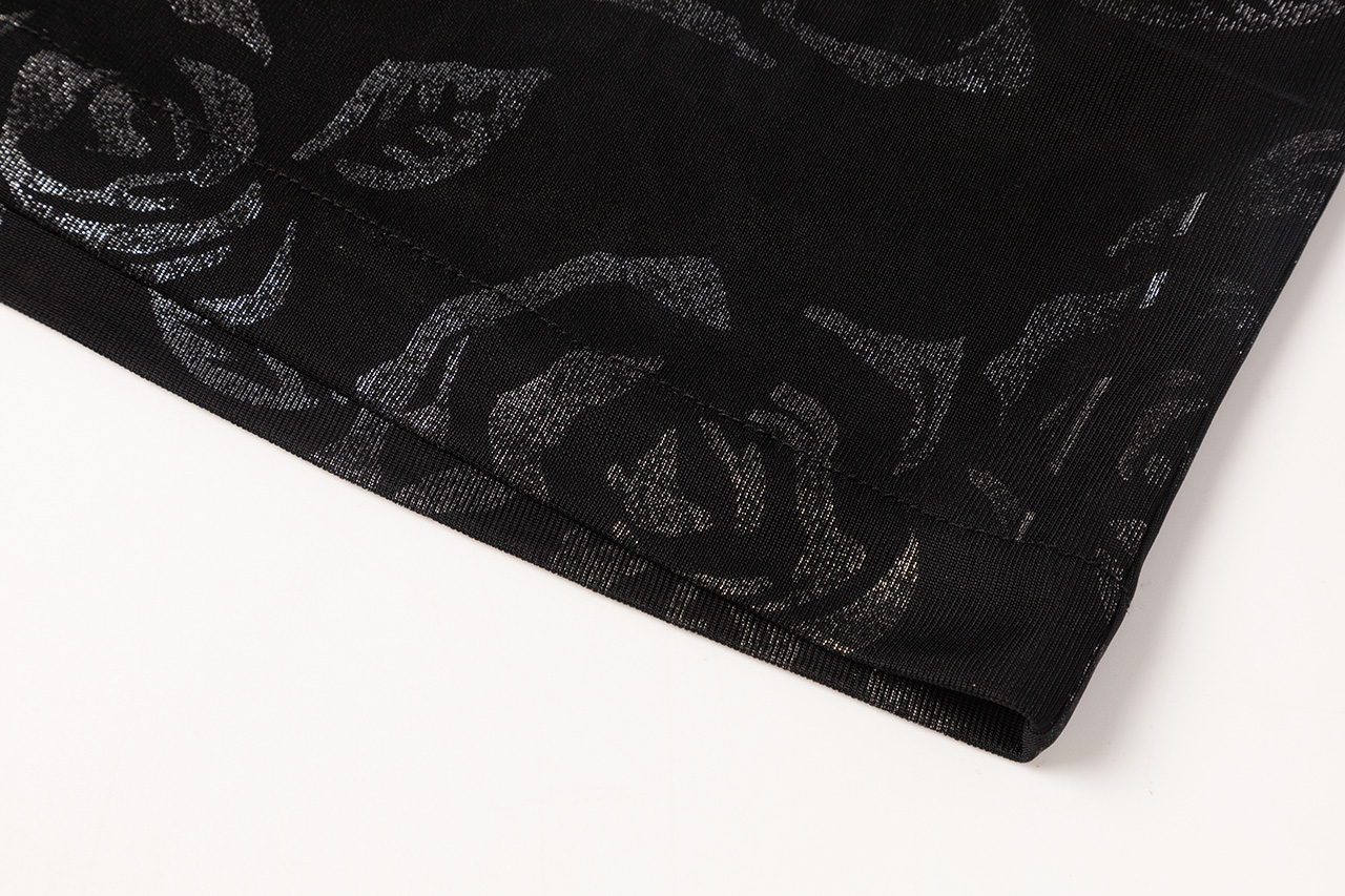 这款高领上衣以黑底银花为基调,低调而富有艺术感。喇叭袖口优雅灵动,剪裁易于穿搭,实用且时尚。银花图案与喇叭袖的融合,传递出独特的艺术魅力,既高级又充满创意,展现别具一格的品味。