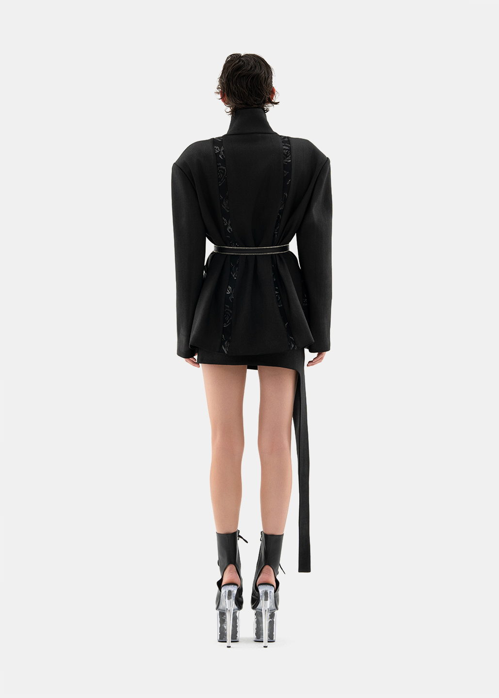 这条黑色包臀裙,将干练与柔美浪漫交织,成为时尚宣言的完美表达。光泽羊毛面料与利落剪裁相结合,包臀版型精准勾勒出臀部曲线,半边飘带设计赋予穿着者独特魅力,为整体增添灵动与飘逸感,既不失力量感,又充满浪漫气息,轻松在人群中脱颖而出。传递出独立而自信的时尚态度。
