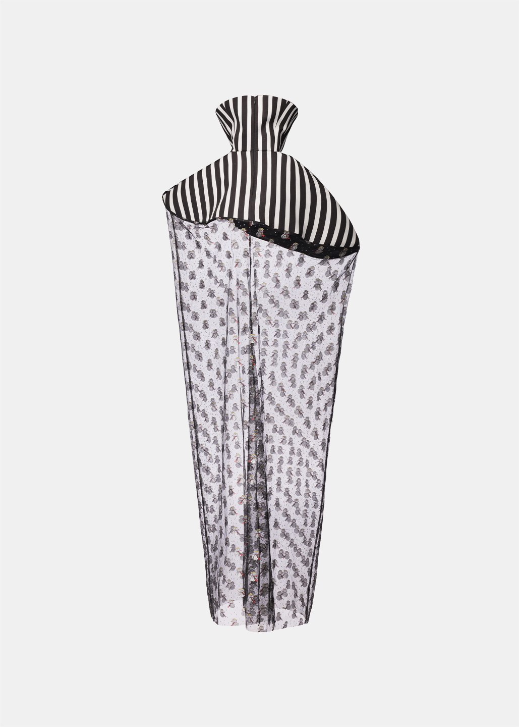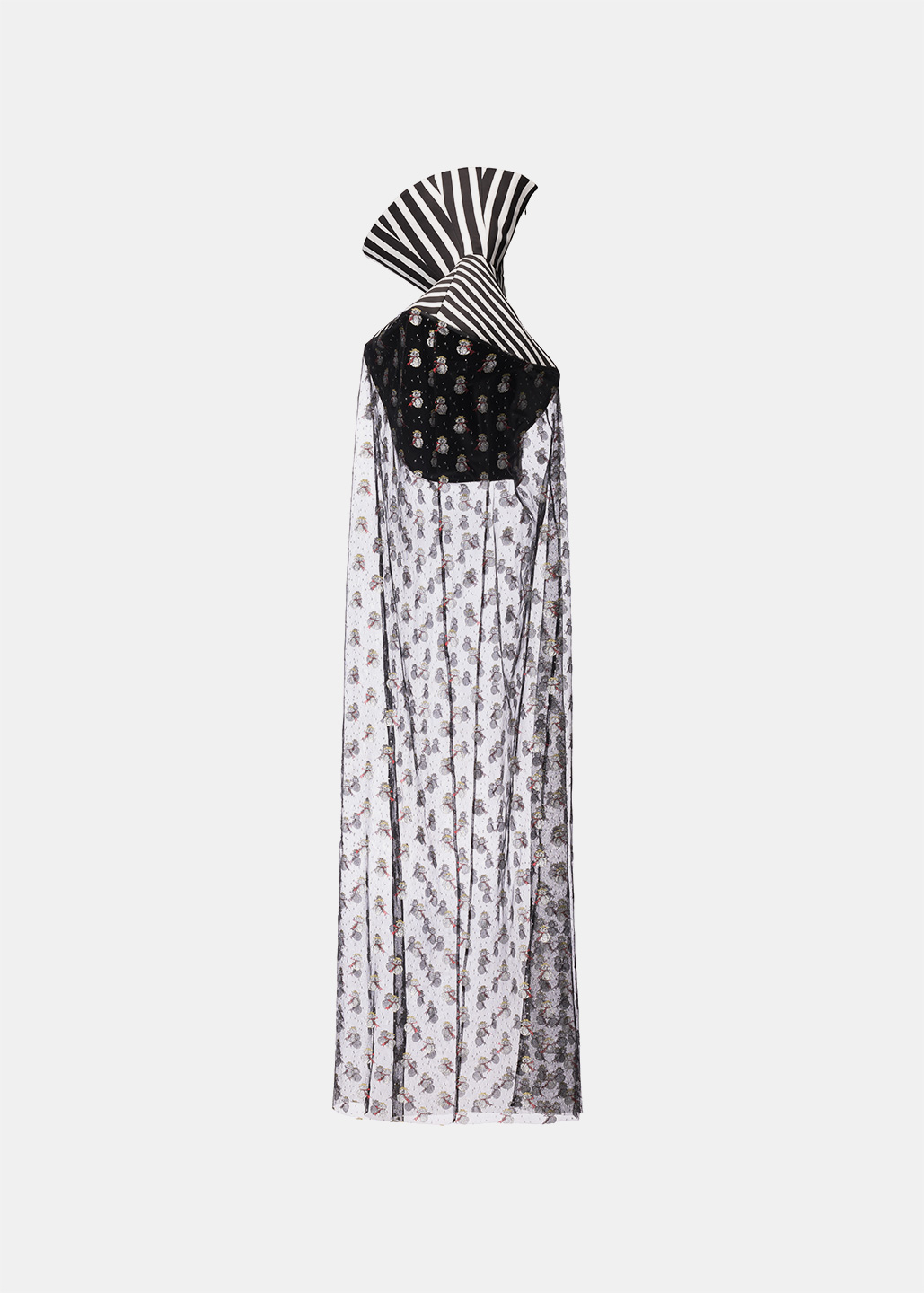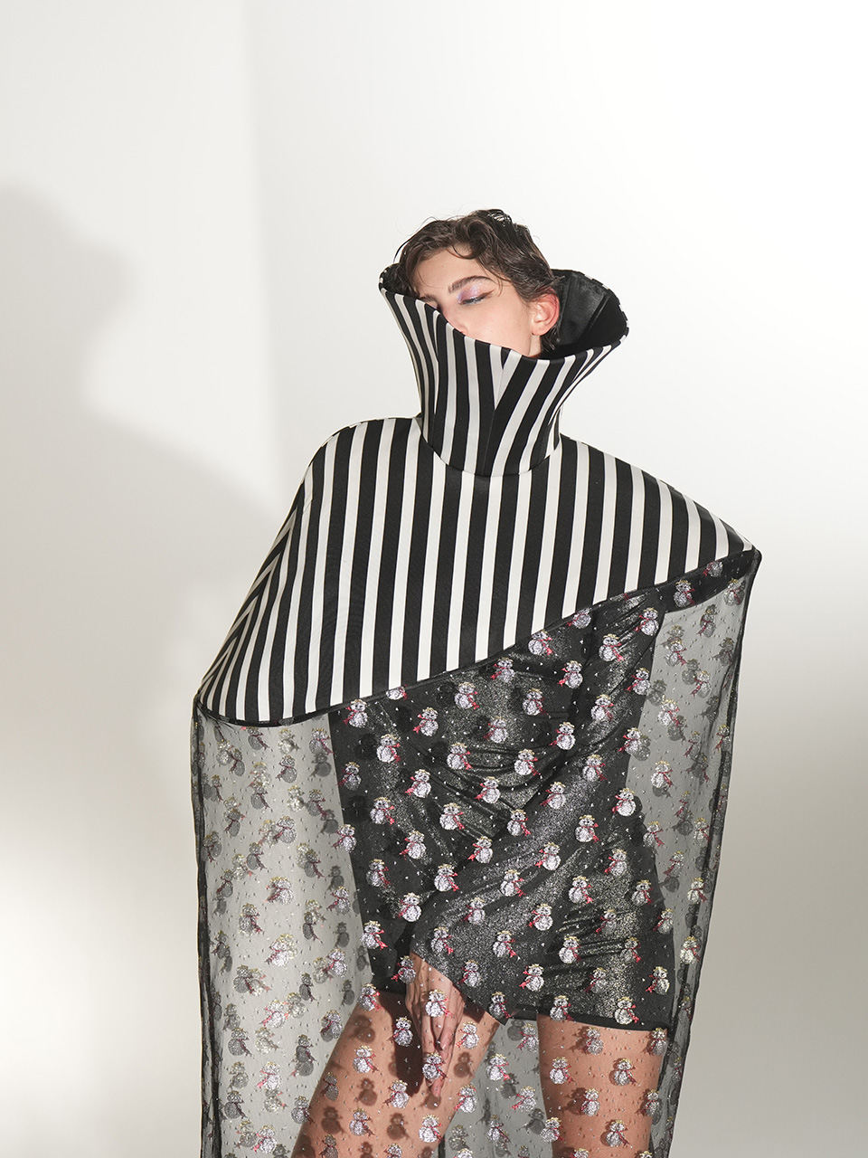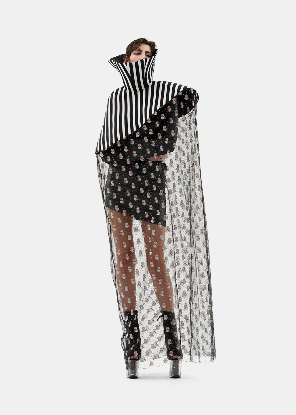 这款雪人斗篷以条纹高领为 设计亮点,高度半掩眼睛, 艺术感十足。雪人欧根纱材 质轻盈透明,闪烁着梦幻光芒,桶状廓形与无袖设计, 罩在人体外,既神秘又前卫 。鱼骨框架支撑造型,赋予 斗篷雕塑般的立体感与结构 美,既大胆又充满创意。整 体设计充满未来主义风格, 梦幻色彩与梦想交织,展现 出独特的时尚态度与艺术美