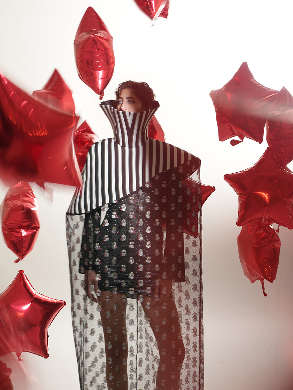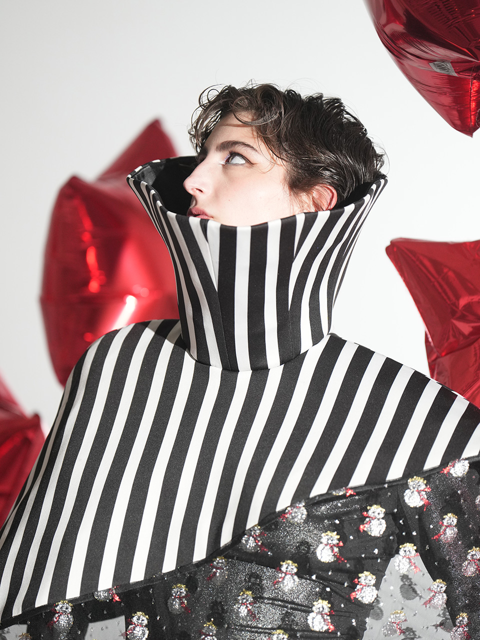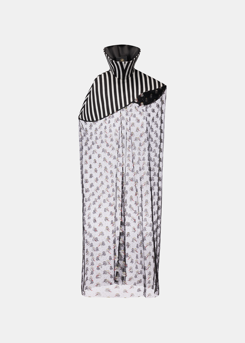 这款雪人斗篷以条纹高领为 设计亮点,高度半掩眼睛, 艺术感十足。雪人欧根纱材 质轻盈透明,闪烁着梦幻光芒,桶状廓形与无袖设计, 罩在人体外,既神秘又前卫 。鱼骨框架支撑造型,赋予 斗篷雕塑般的立体感与结构 美,既大胆又充满创意。整 体设计充满未来主义风格, 梦幻色彩与梦想交织,展现 出独特的时尚态度与艺术美