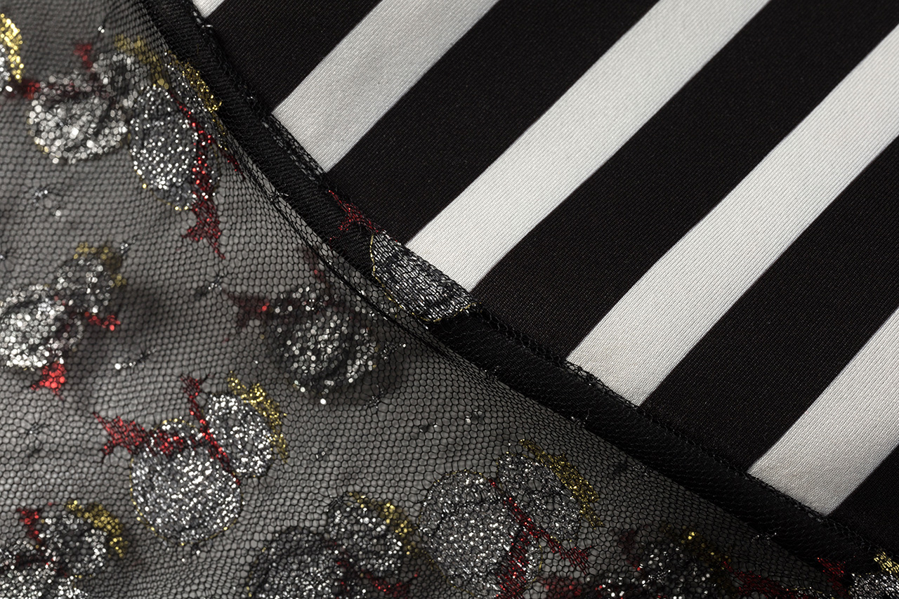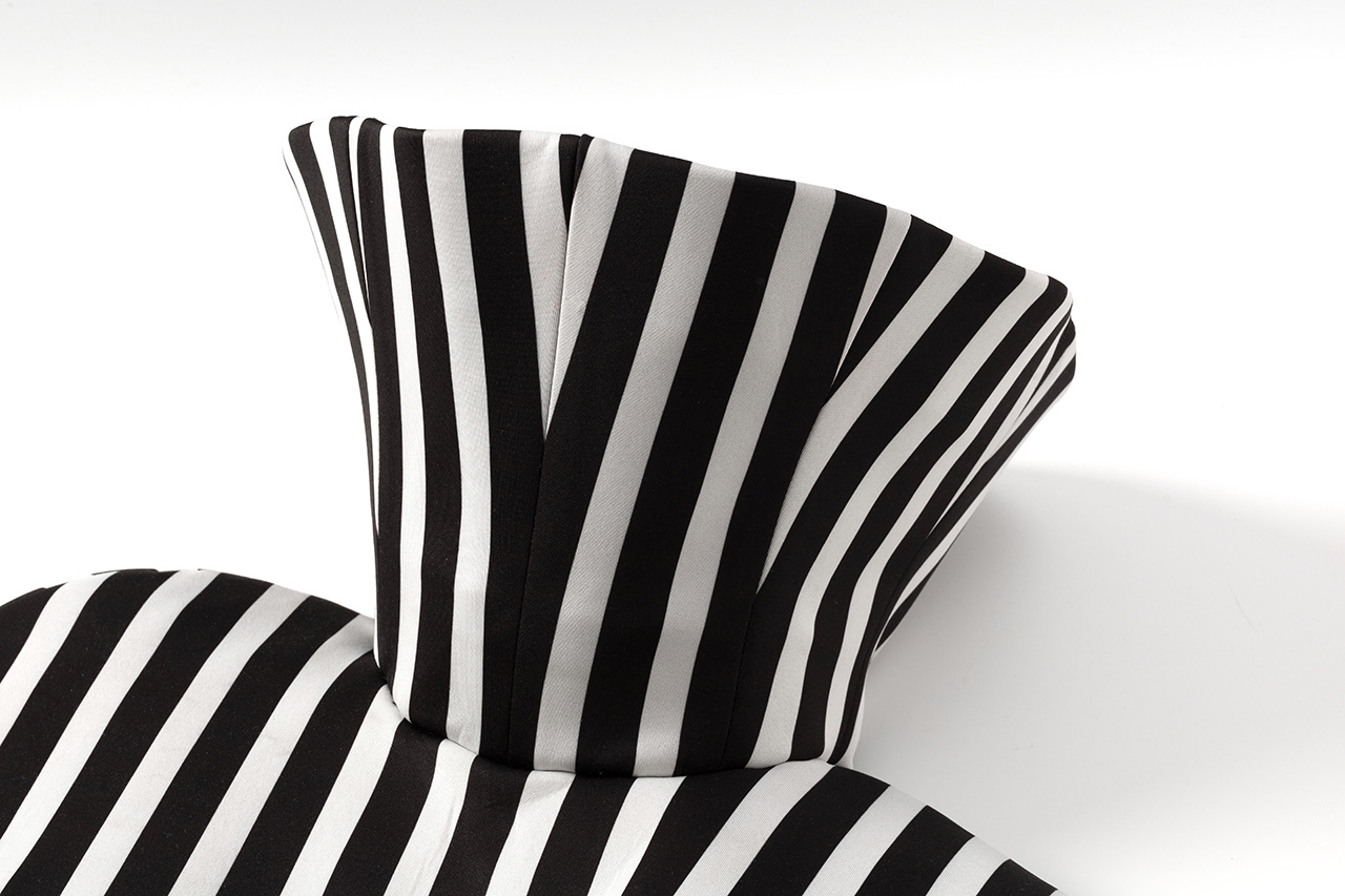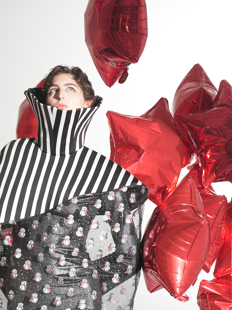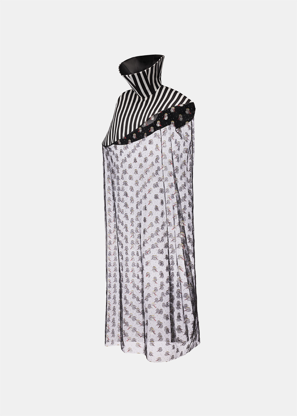 这款雪人斗篷以条纹高领为 设计亮点,高度半掩眼睛, 艺术感十足。雪人欧根纱材 质轻盈透明,闪烁着梦幻光芒,桶状廓形与无袖设计, 罩在人体外,既神秘又前卫 。鱼骨框架支撑造型,赋予 斗篷雕塑般的立体感与结构 美,既大胆又充满创意。整 体设计充满未来主义风格, 梦幻色彩与梦想交织,展现 出独特的时尚态度与艺术美