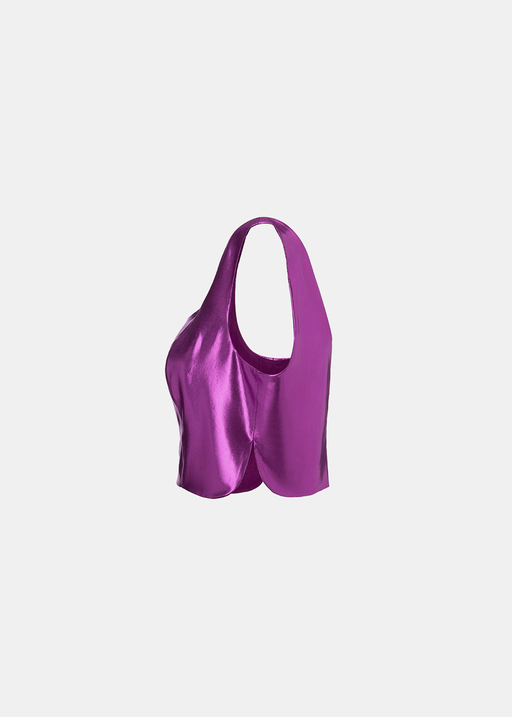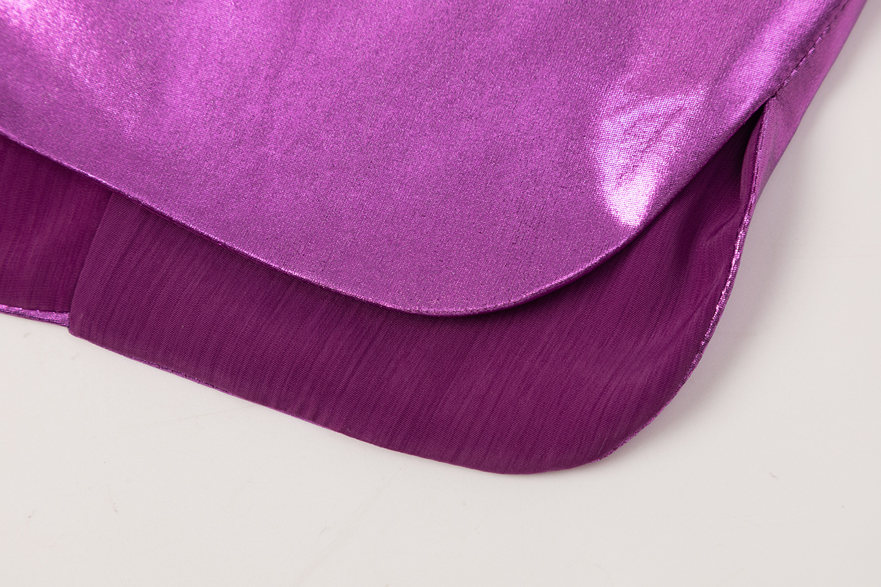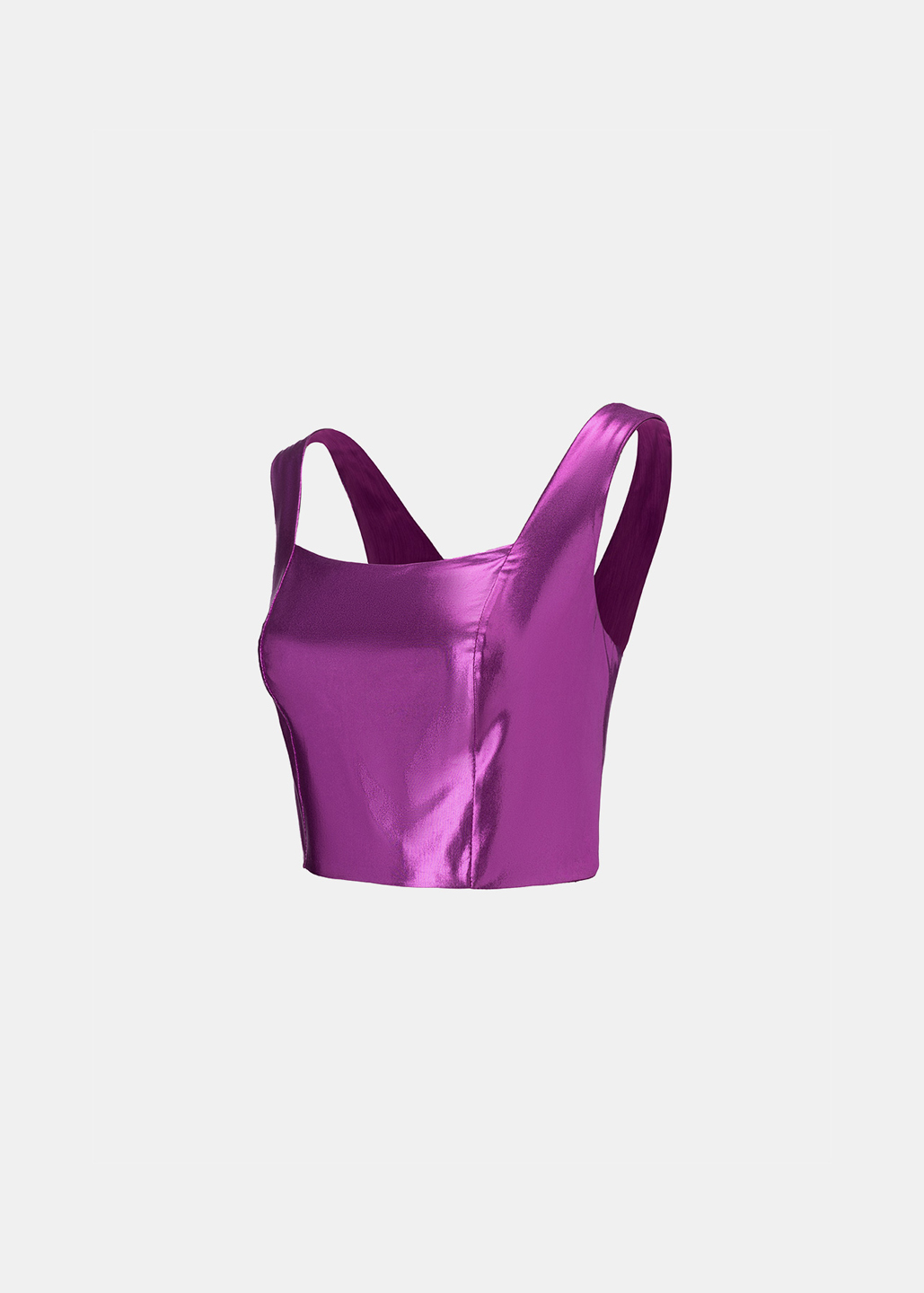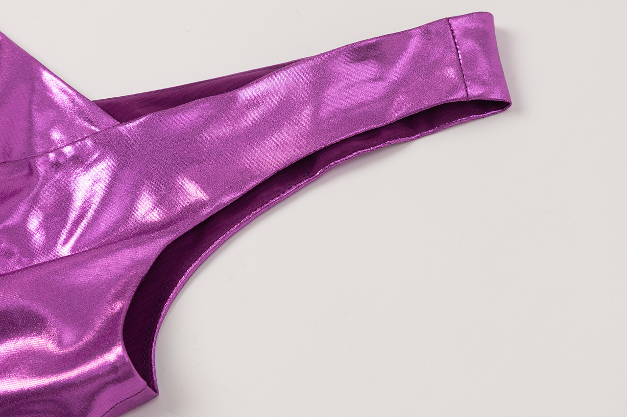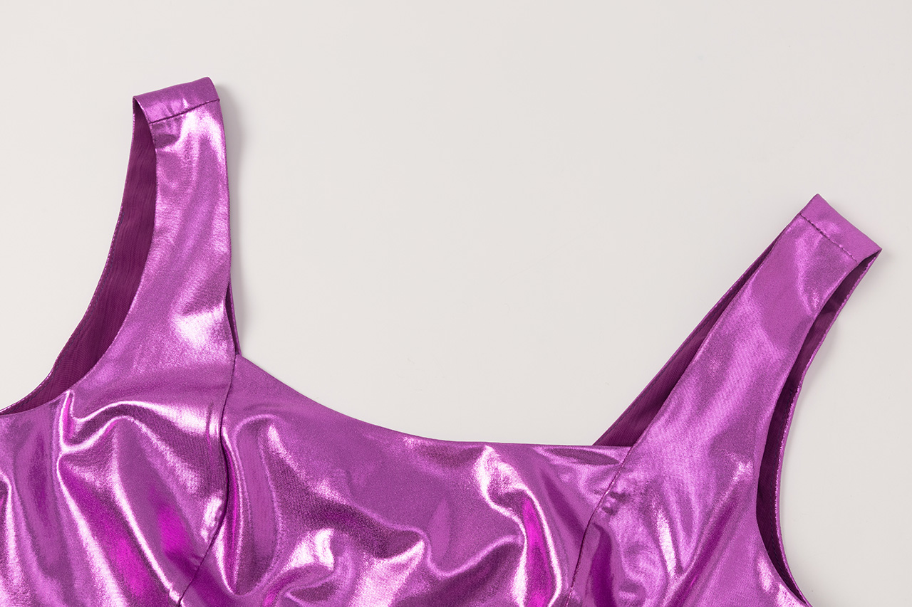 采用紫光亮面面料,似拥有迷人魅力的紫罗兰,加入变幻莫测的灵魂。选择背心的版型,露出大面积皮肤,极具梦幻感与视觉吸引力。