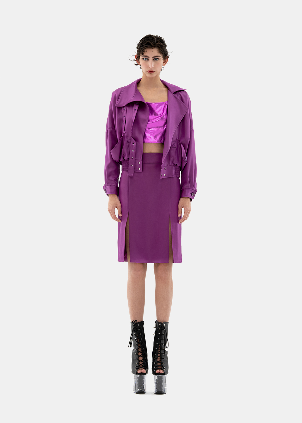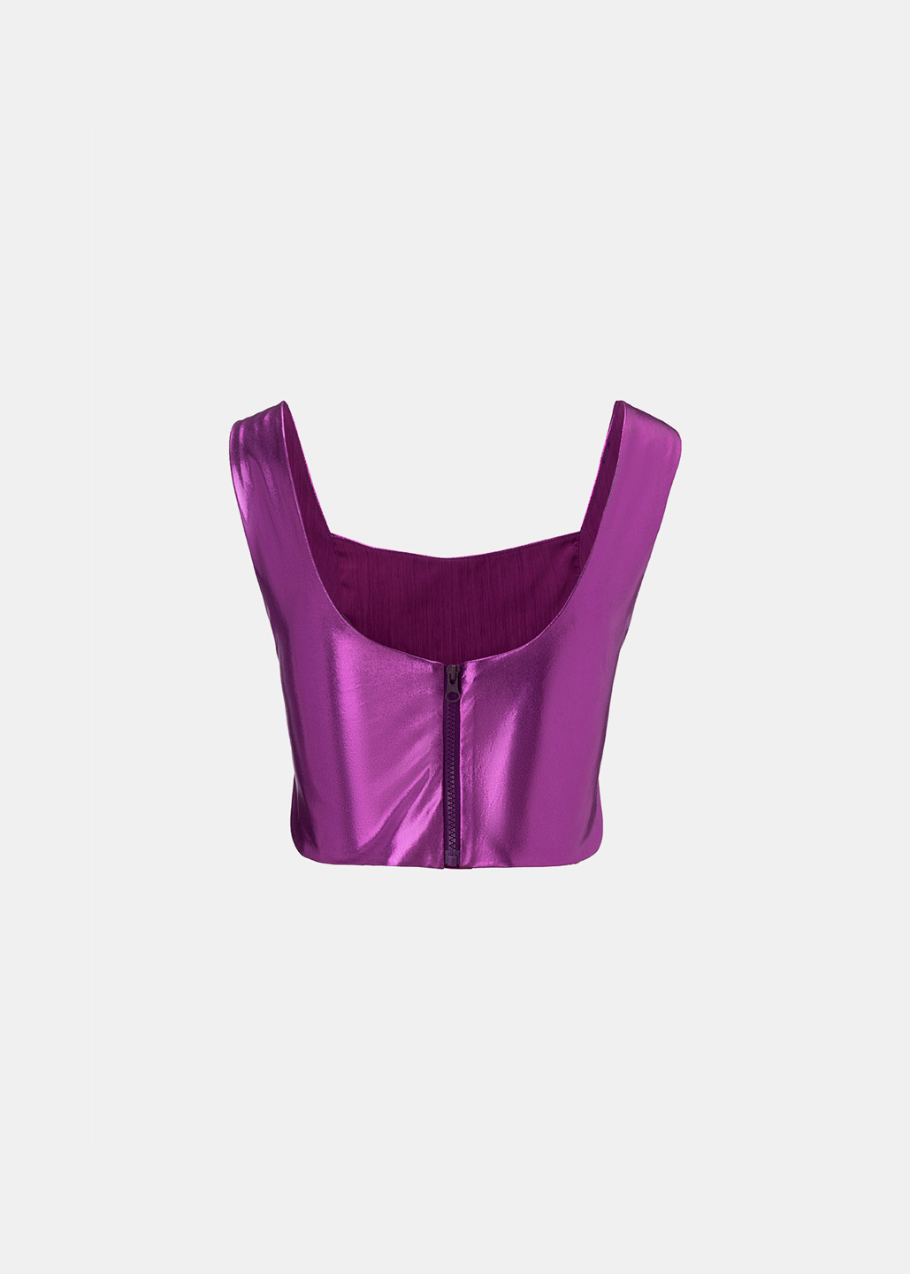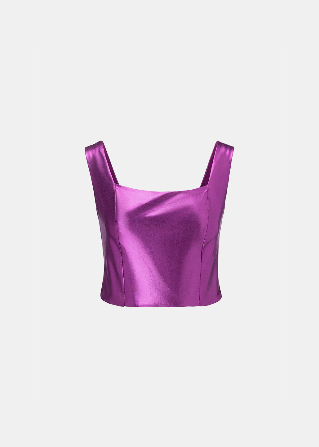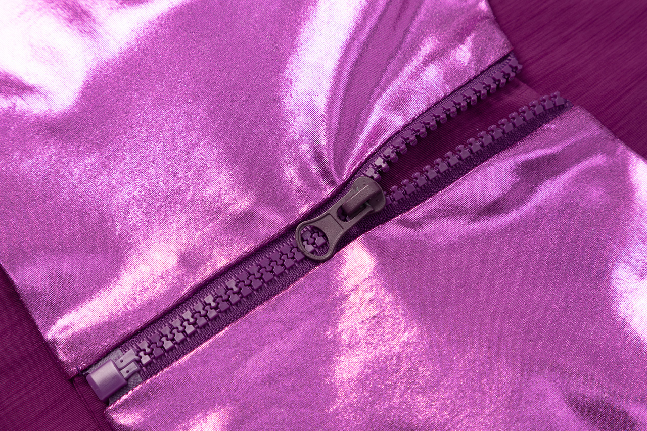 采用紫光亮面面料,似拥有迷人魅力的紫罗兰,加入变幻莫测的灵魂。选择背心的版型,露出大面积皮肤,极具梦幻感与视觉吸引力。