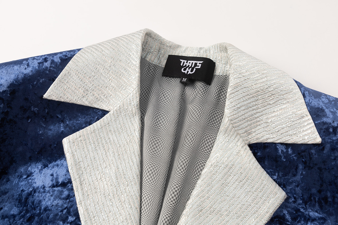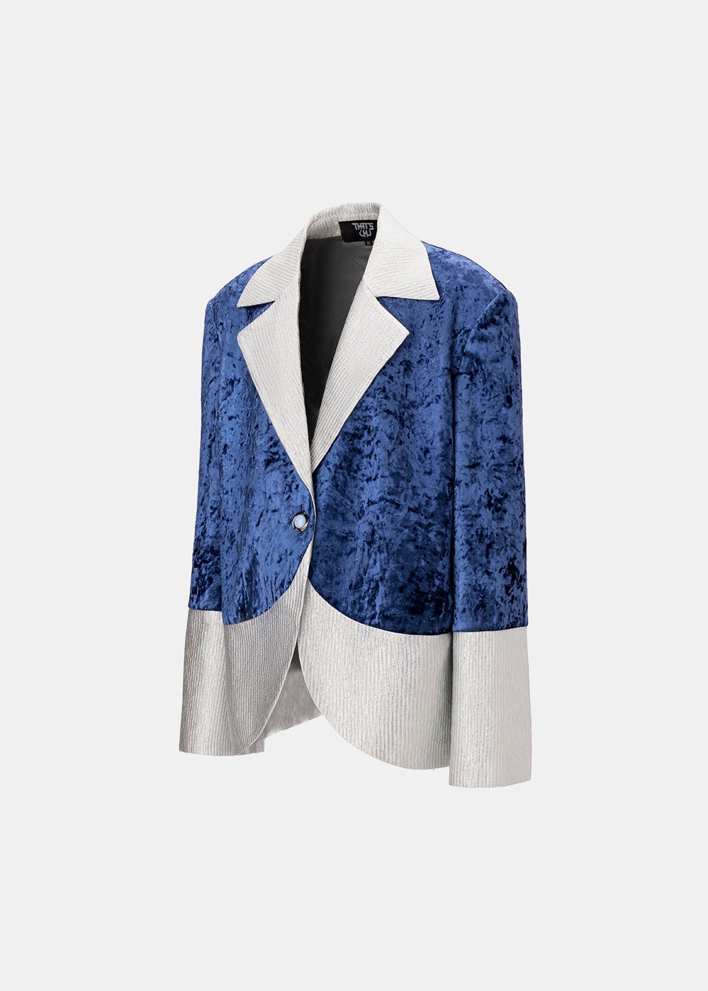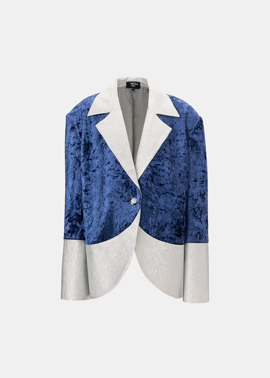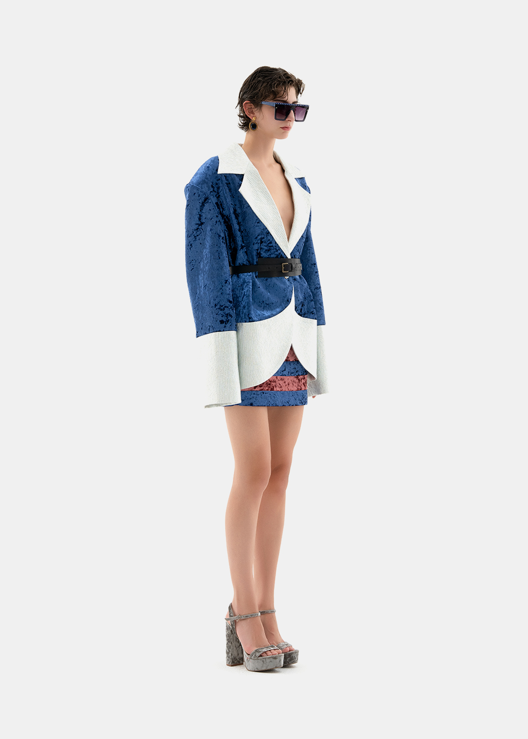 这款设计选用柔软细腻的麂皮绒面料,触感舒适,拼接银白色闪光面料,宛如月光洒落,为西装注入了一抹清冷与奢华的气息。宽肩设计拓展肩部线条,打造出强大的气场与力量感,既展现了现代女性的自信与从容,又通过材质的碰撞,传递出时尚的独特魅力。