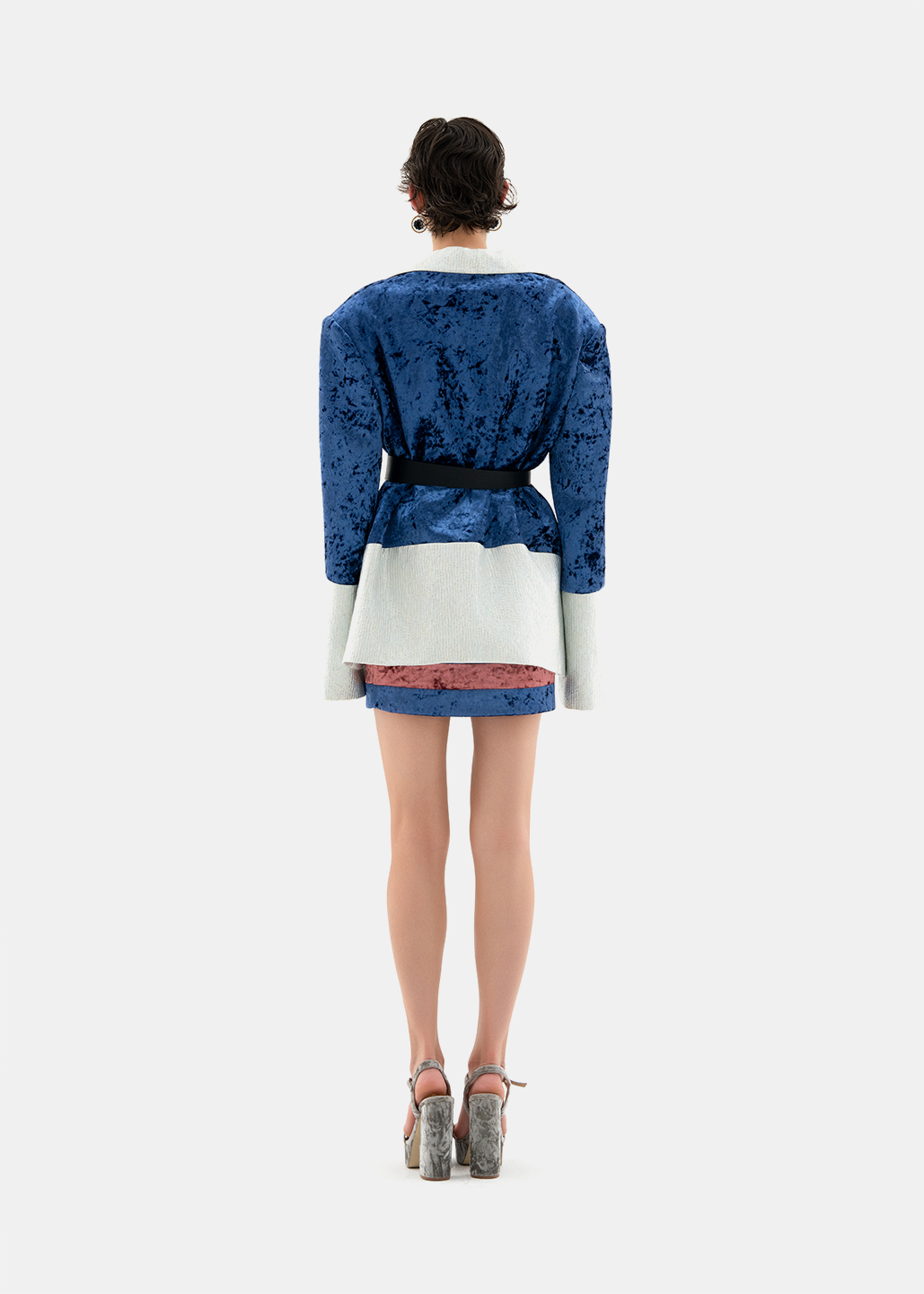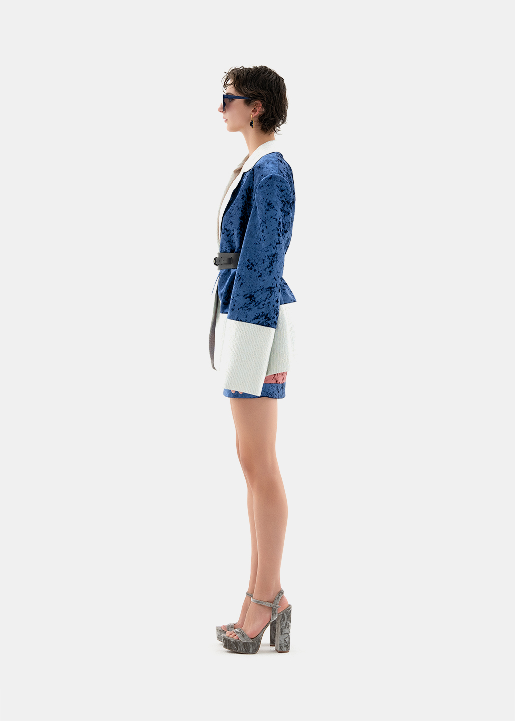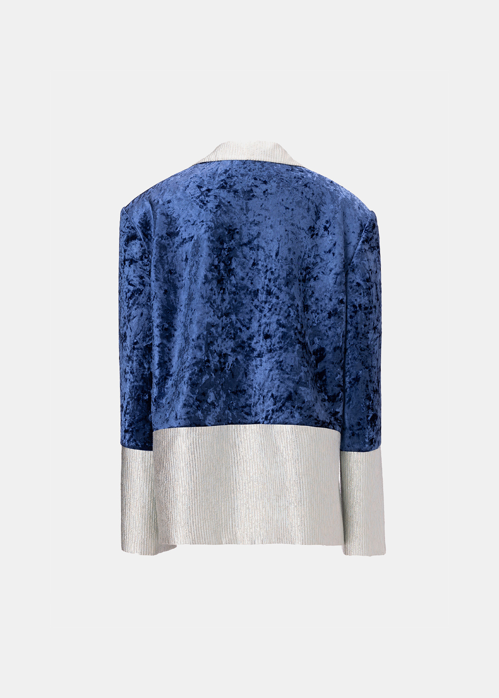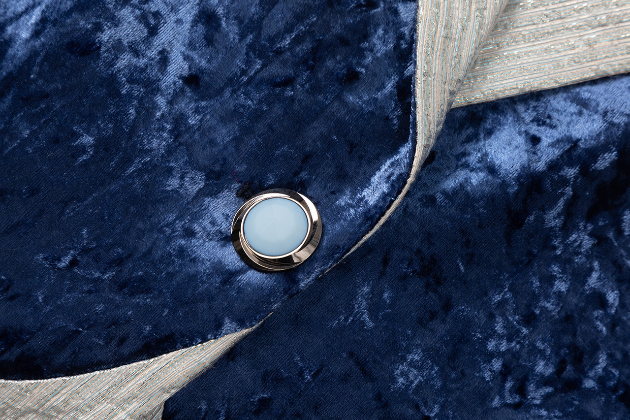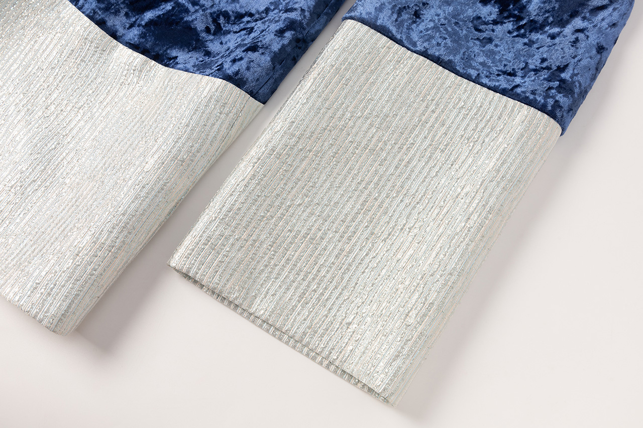 这款设计选用柔软细腻的麂皮绒面料,触感舒适,拼接银白色闪光面料,宛如月光洒落,为西装注入了一抹清冷与奢华的气息。宽肩设计拓展肩部线条,打造出强大的气场与力量感,既展现了现代女性的自信与从容,又通过材质的碰撞,传递出时尚的独特魅力。