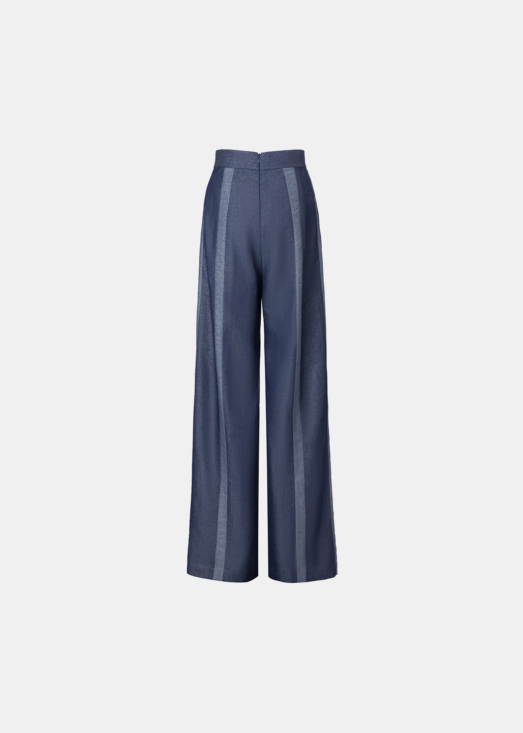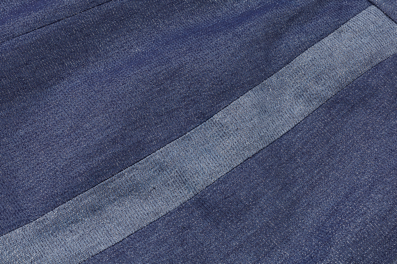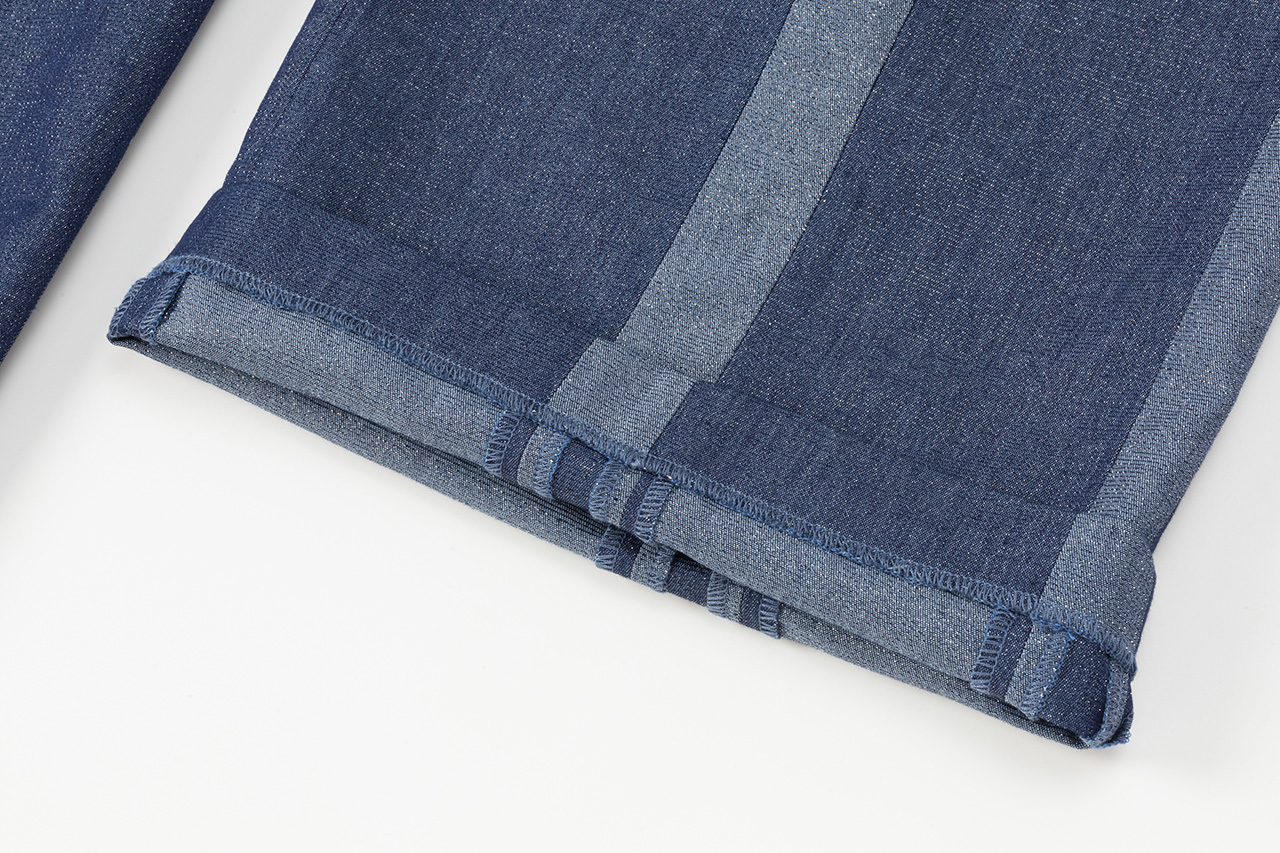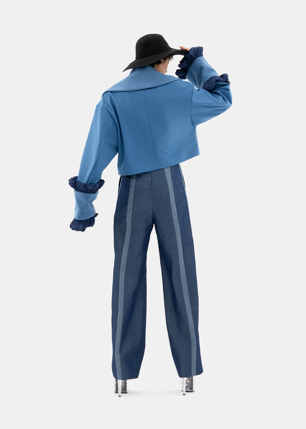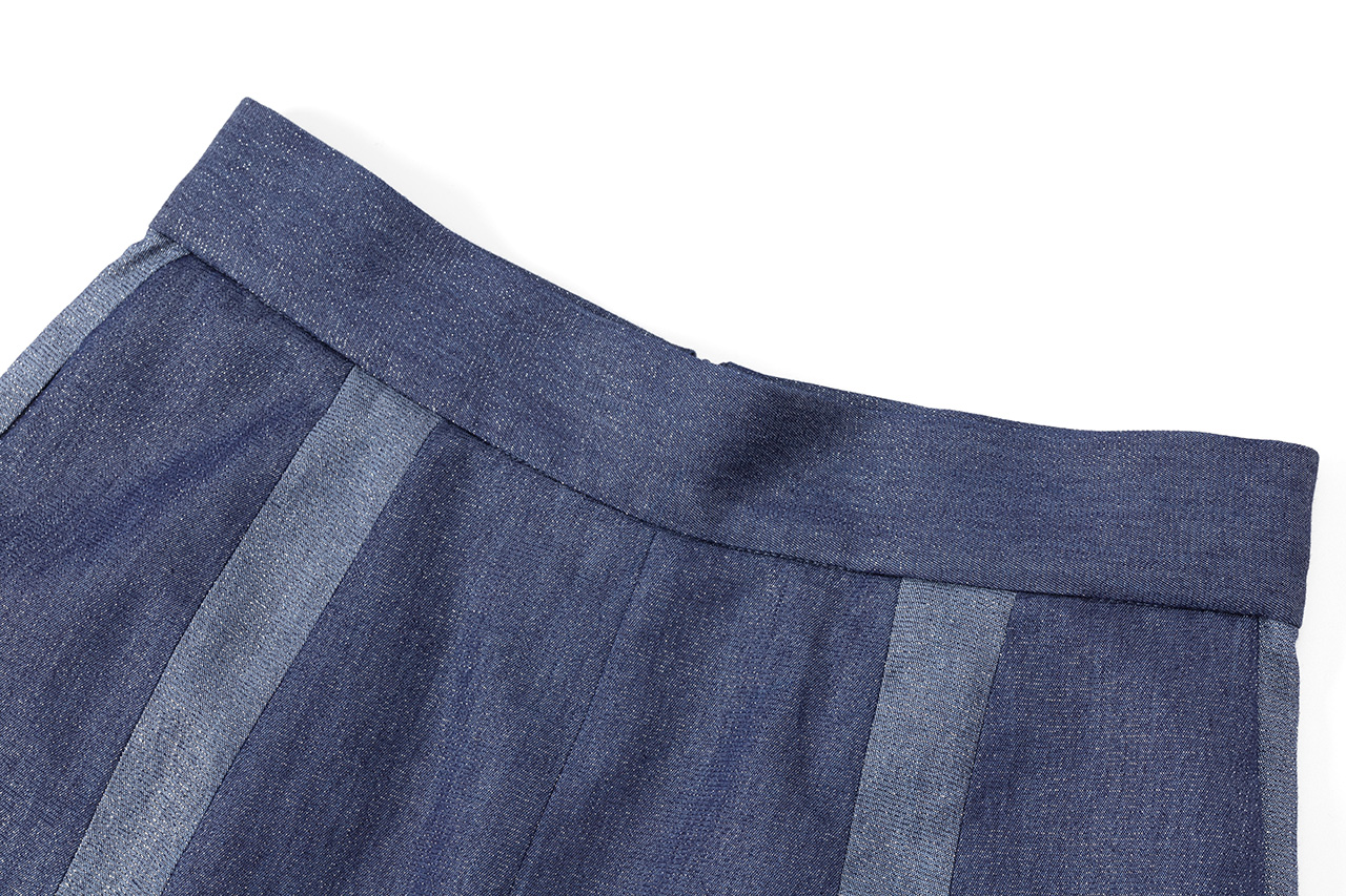 这款设计以闪光的蓝色牛仔 为基底,搭配品牌经典裤型,简约而利落。前中、侧缝和后中巧妙运用蓝色牛仔 的反面作为拼条设计,面料 材质一致却形成深浅对比, 为裤子注入了独特的灵魂与 层次感。整体设计既保留了 牛仔的硬朗气质,又通过细 节的碰撞,展现出别具一格的时尚态度。