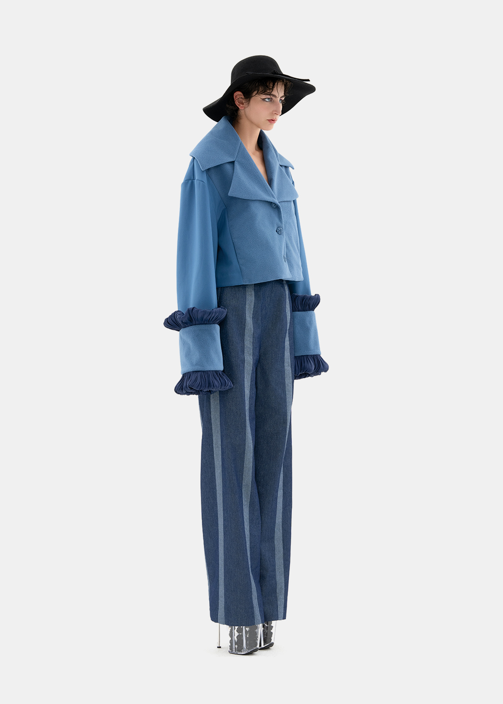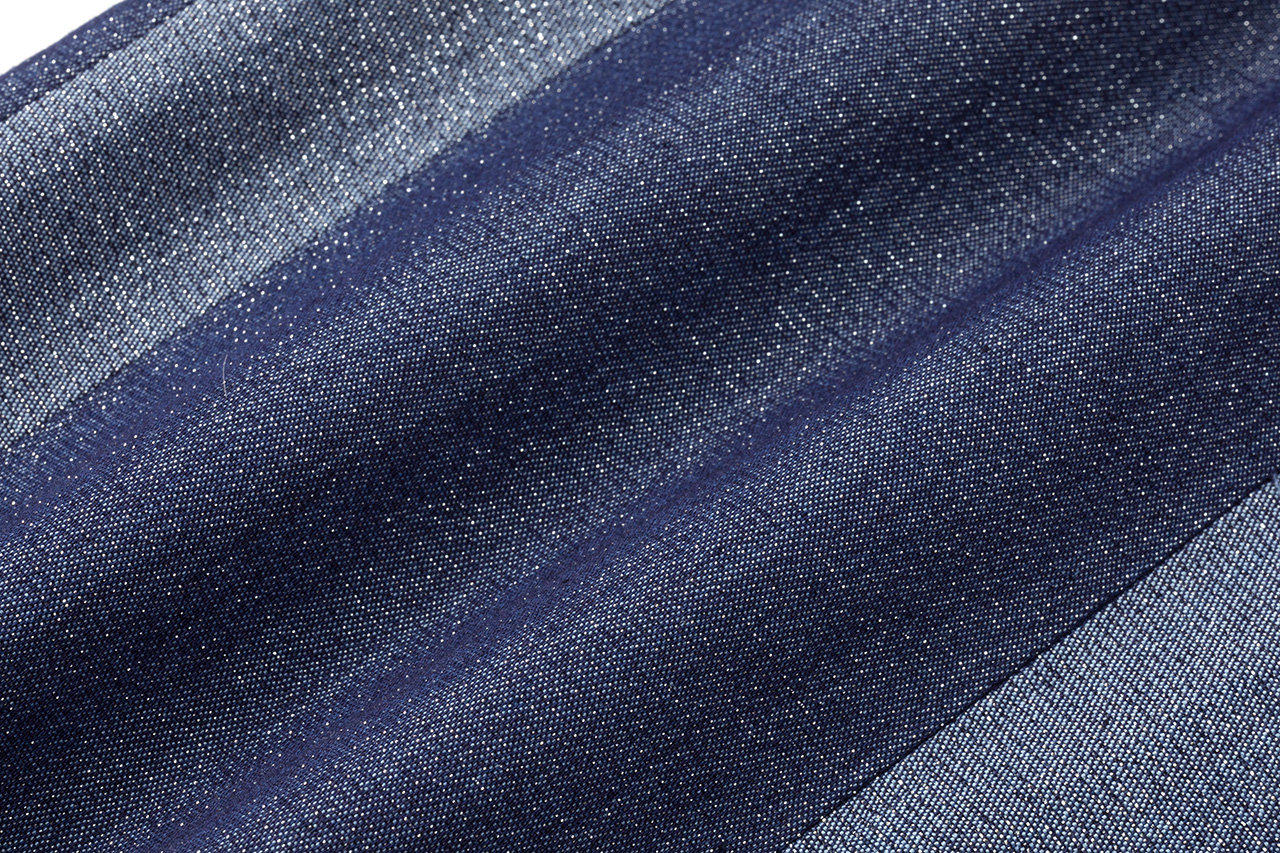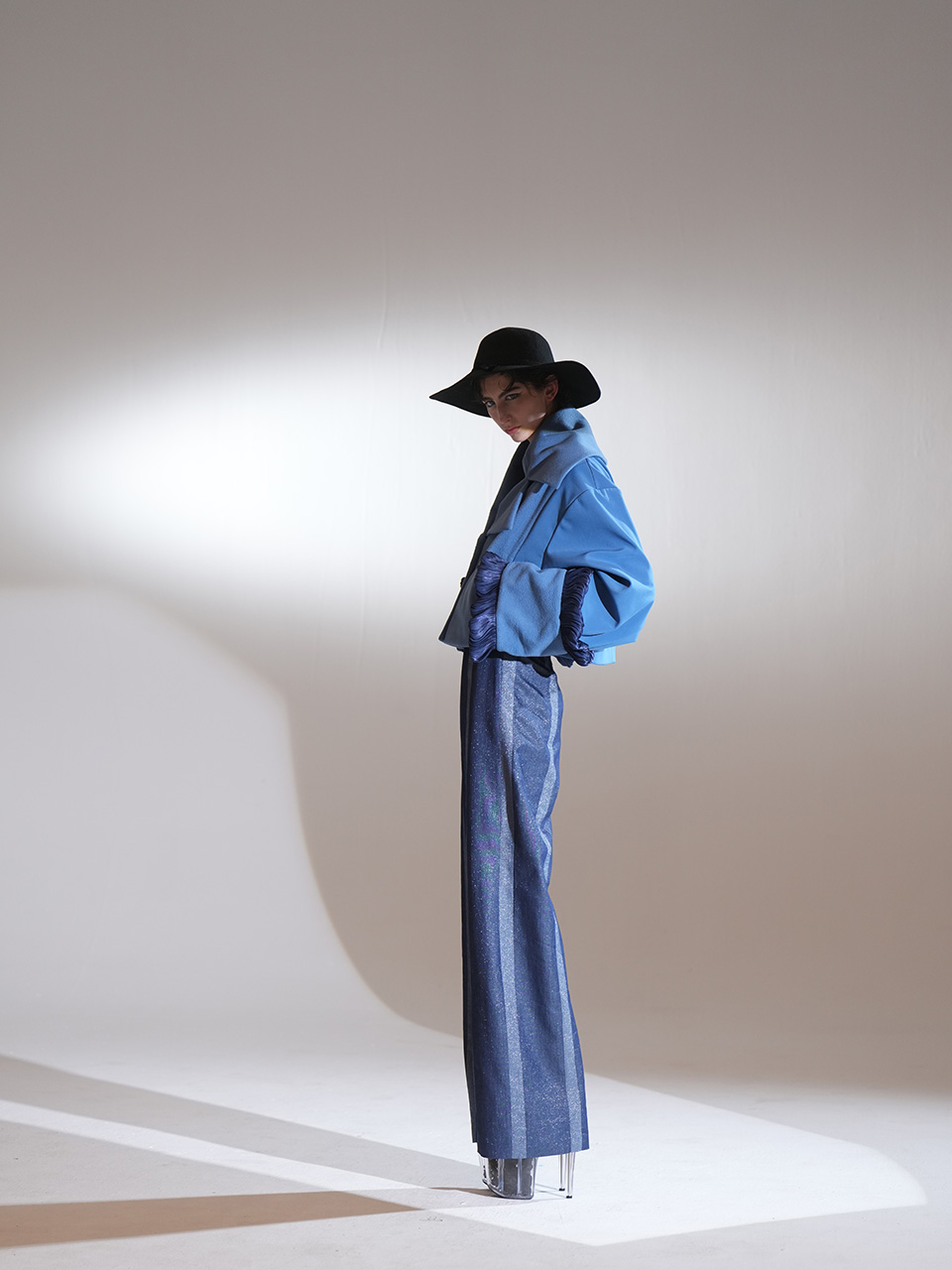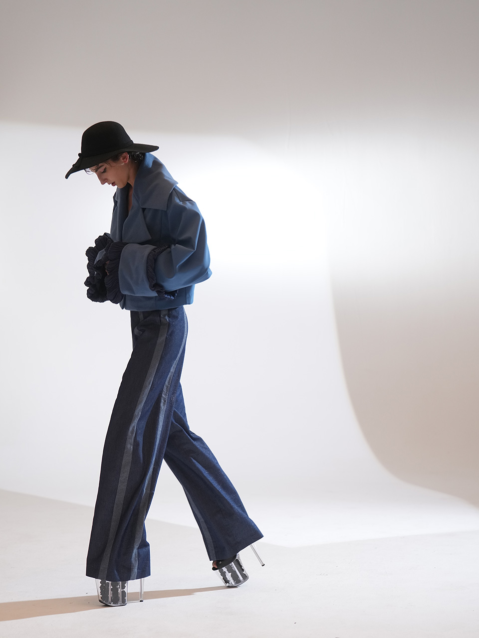这款设计以闪光的蓝色牛仔 为基底,搭配品牌经典裤型,简约而利落。前中、侧缝和后中巧妙运用蓝色牛仔 的反面作为拼条设计,面料 材质一致却形成深浅对比, 为裤子注入了独特的灵魂与 层次感。整体设计既保留了 牛仔的硬朗气质,又通过细 节的碰撞,展现出别具一格的时尚态度。