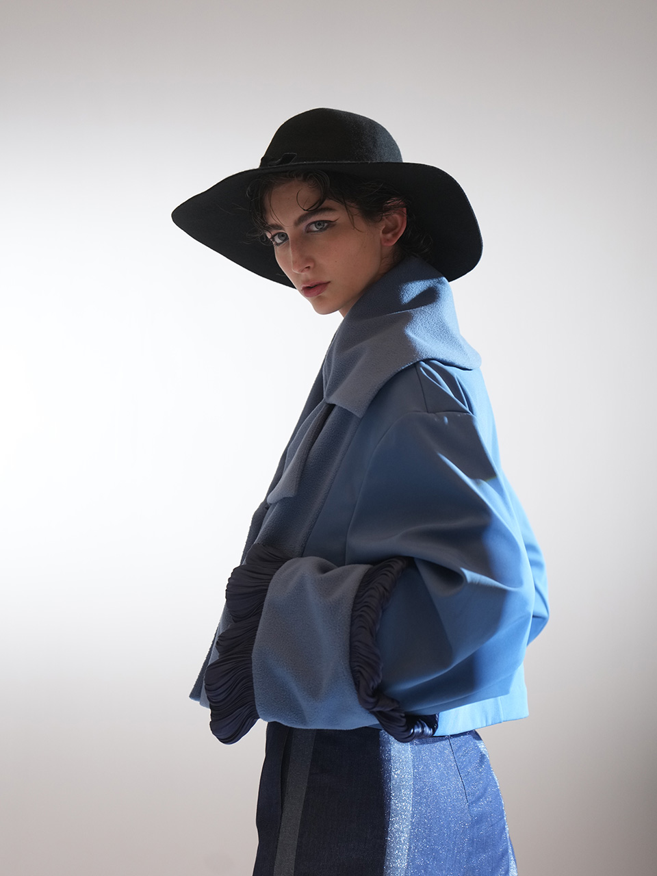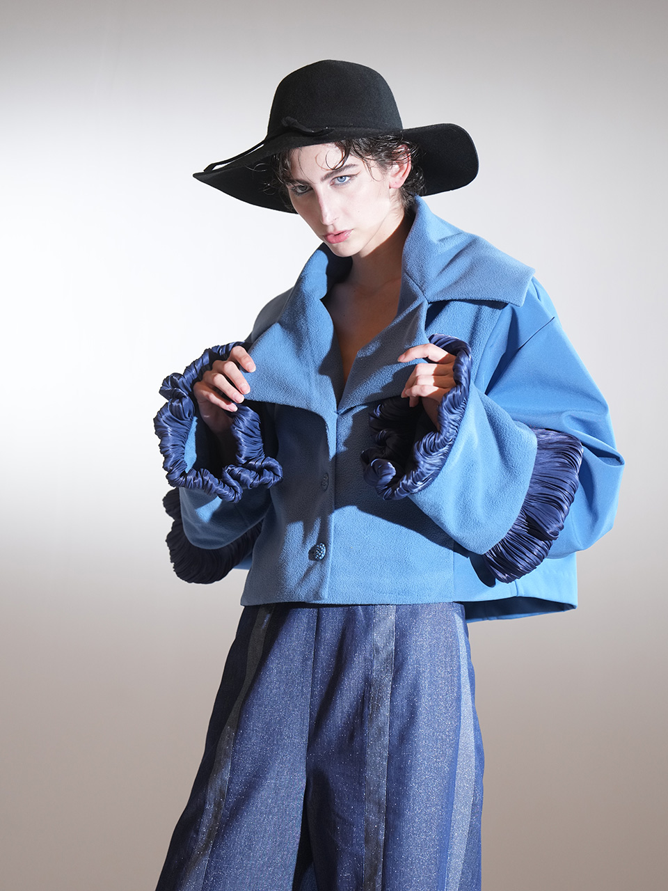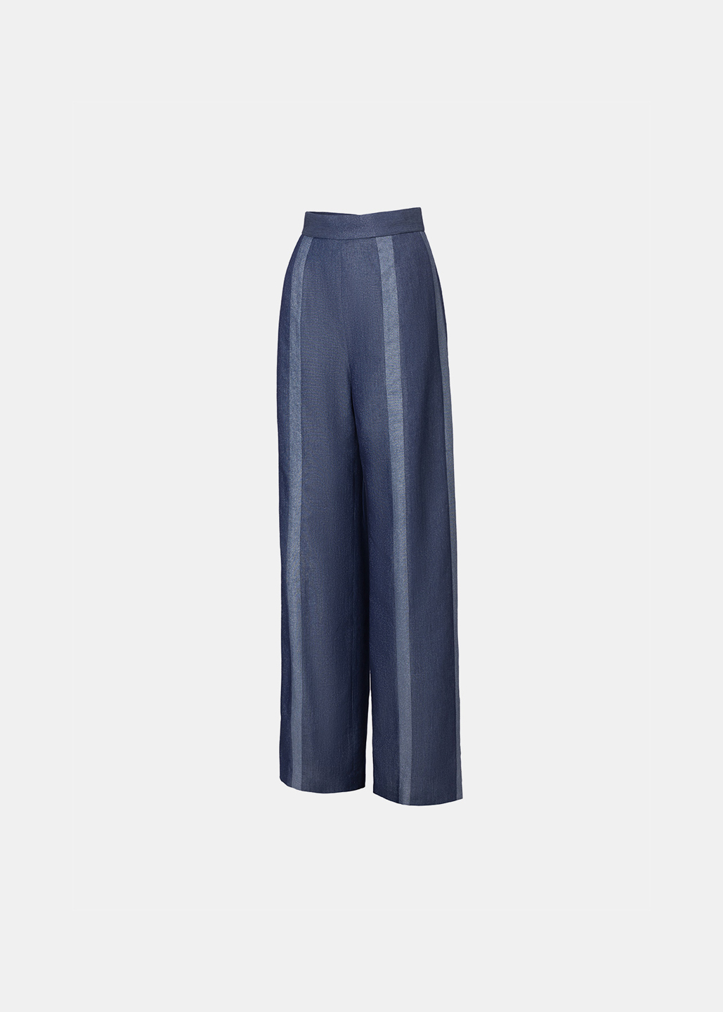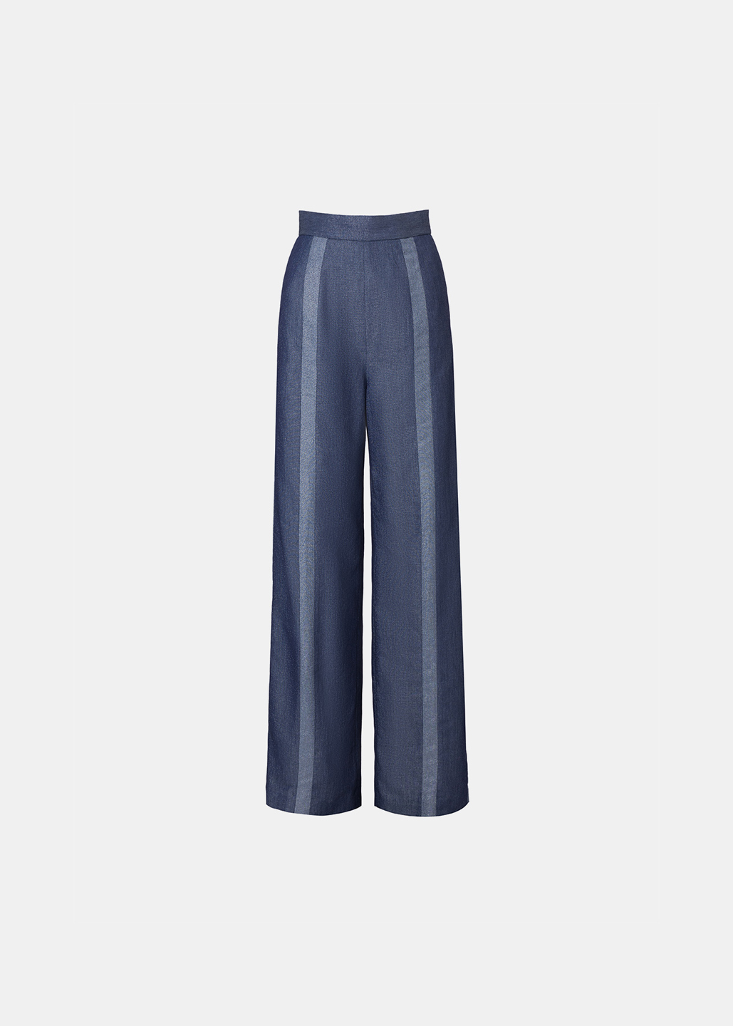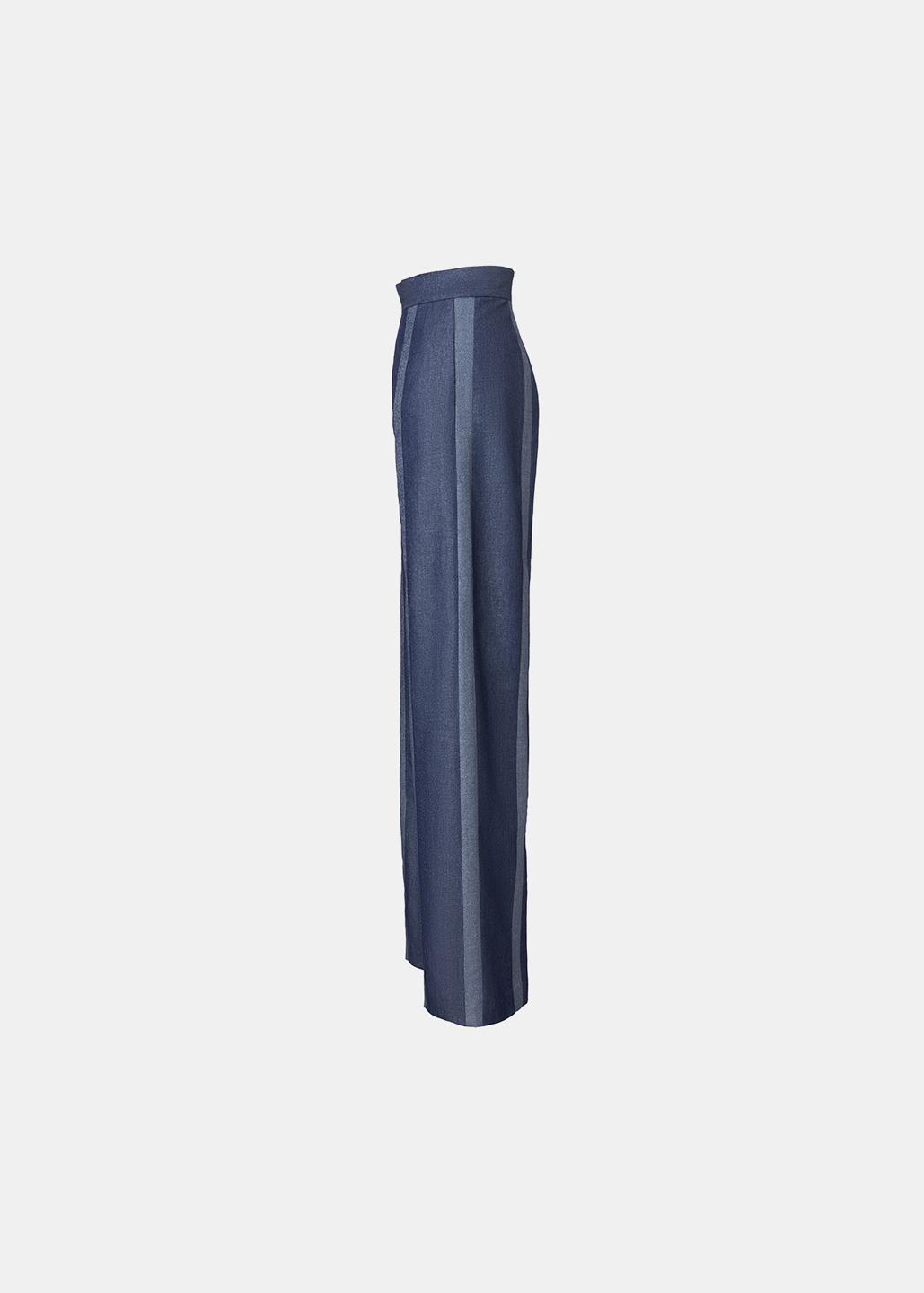 这款设计以闪光的蓝色牛仔 为基底,搭配品牌经典裤型,简约而利落。前中、侧缝和后中巧妙运用蓝色牛仔 的反面作为拼条设计,面料 材质一致却形成深浅对比, 为裤子注入了独特的灵魂与 层次感。整体设计既保留了 牛仔的硬朗气质,又通过细 节的碰撞,展现出别具一格的时尚态度。