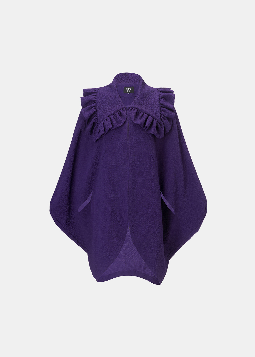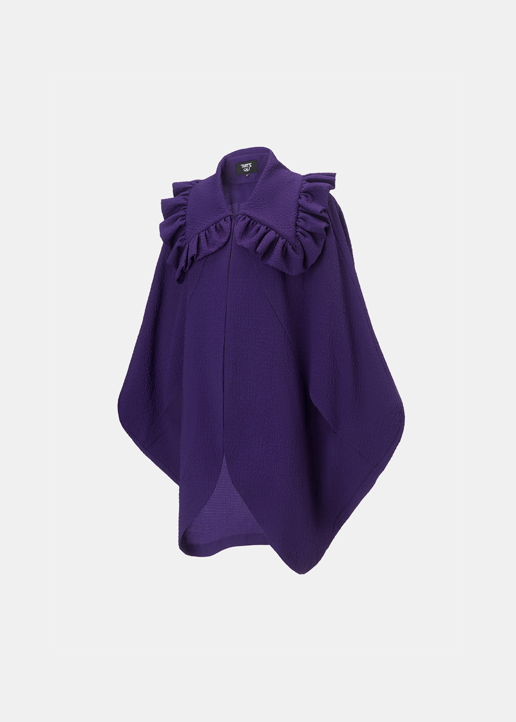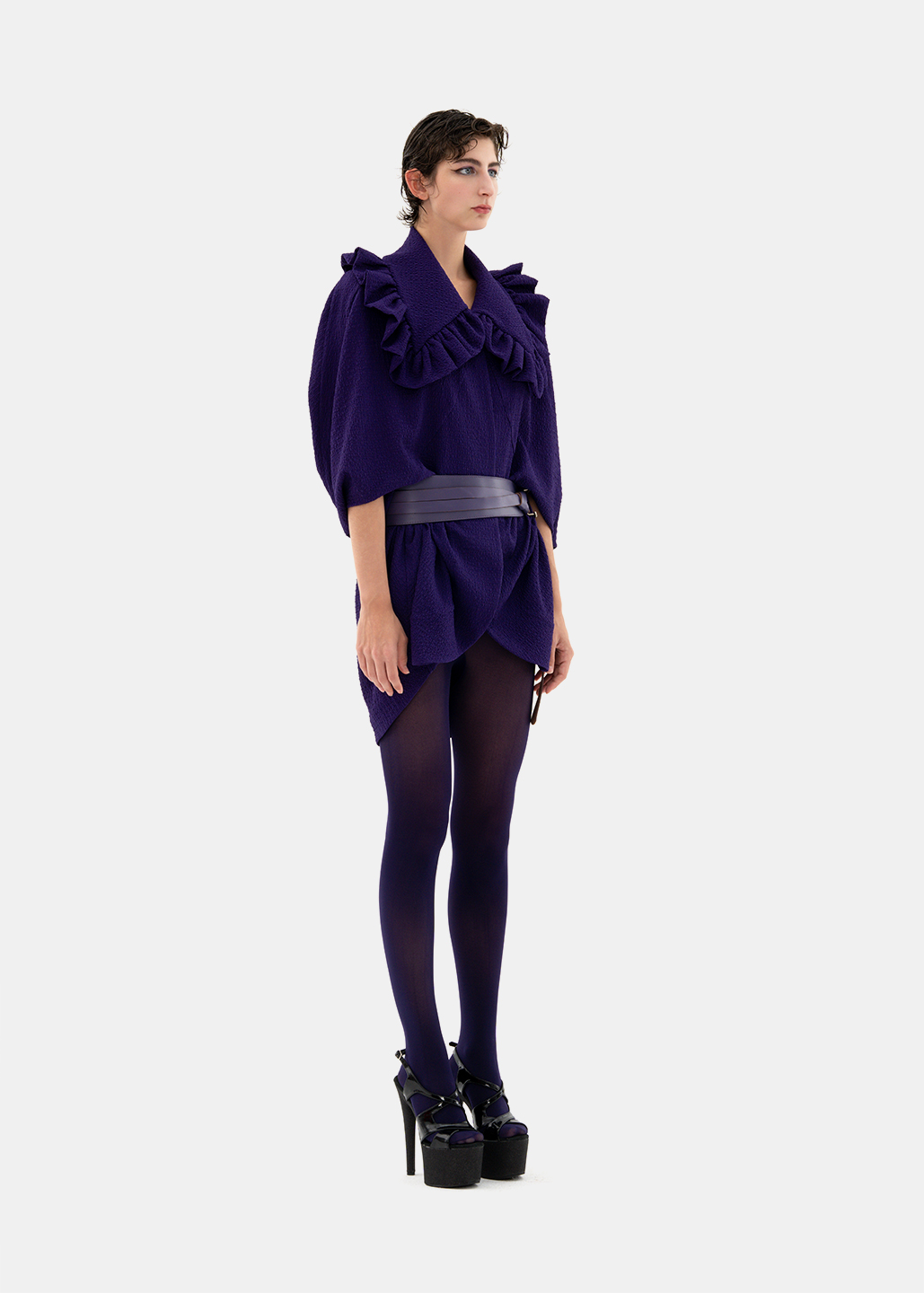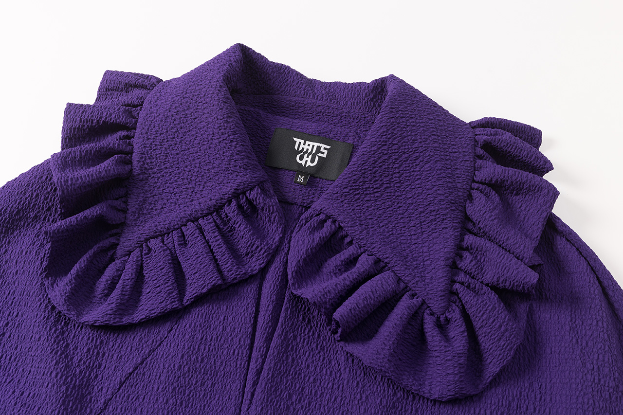 采用幽幽紫色面料,色泽深邃、收敛,如同深海中隐秘的神秘宝藏。特殊的肌理若隐若现,面料柔软有弹性。领口边缘环绕了一圈用衣服相同面料打褶制成的荷叶边,细腻的褶皱紧密排列,增添了年轻与精致。