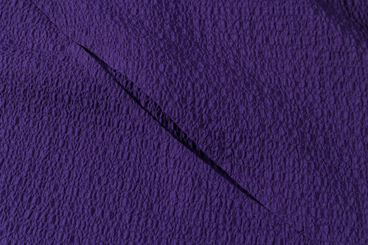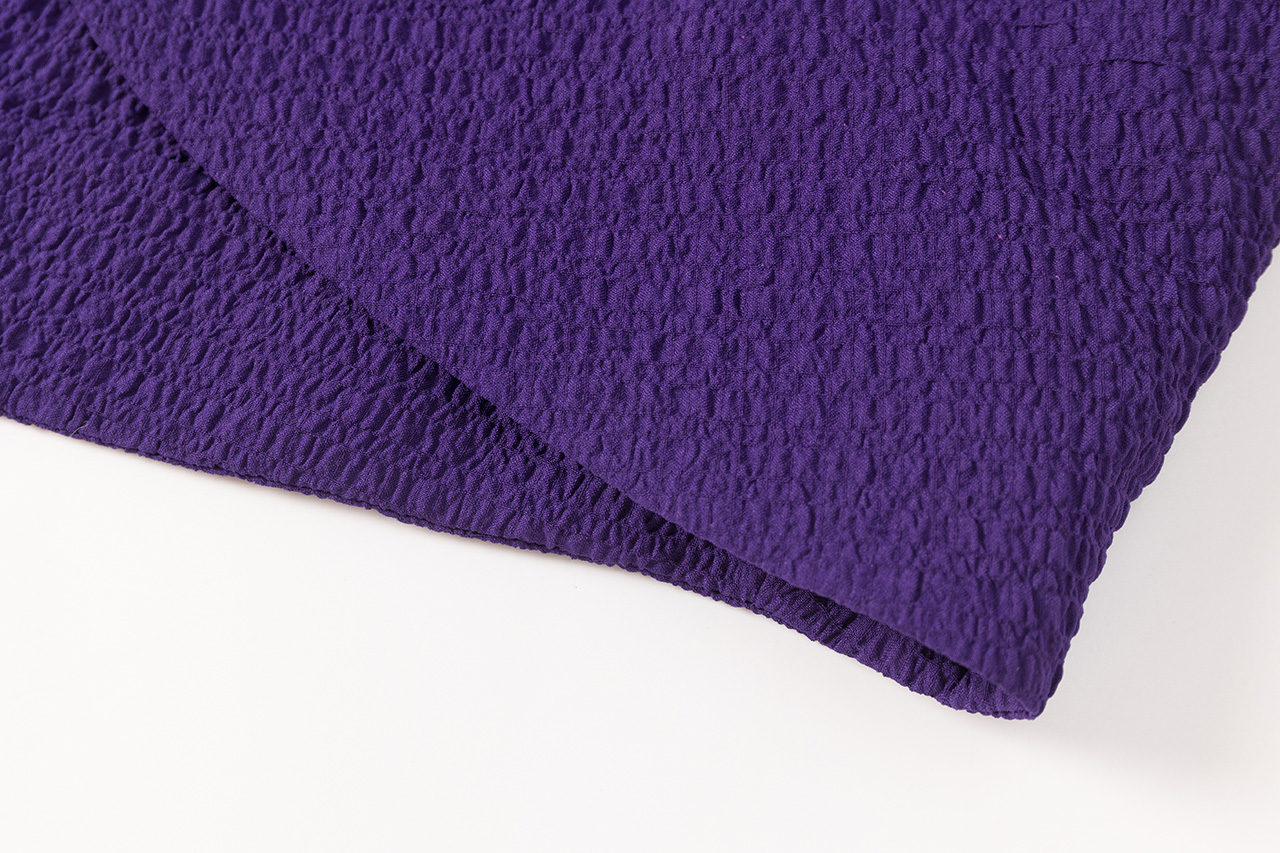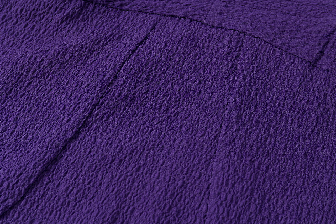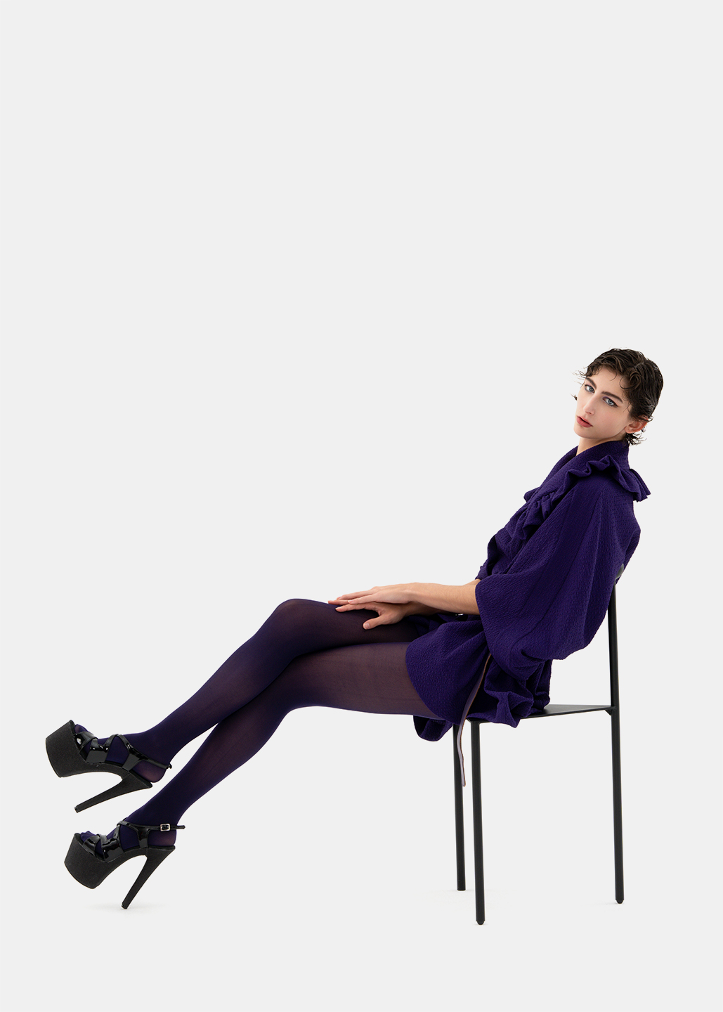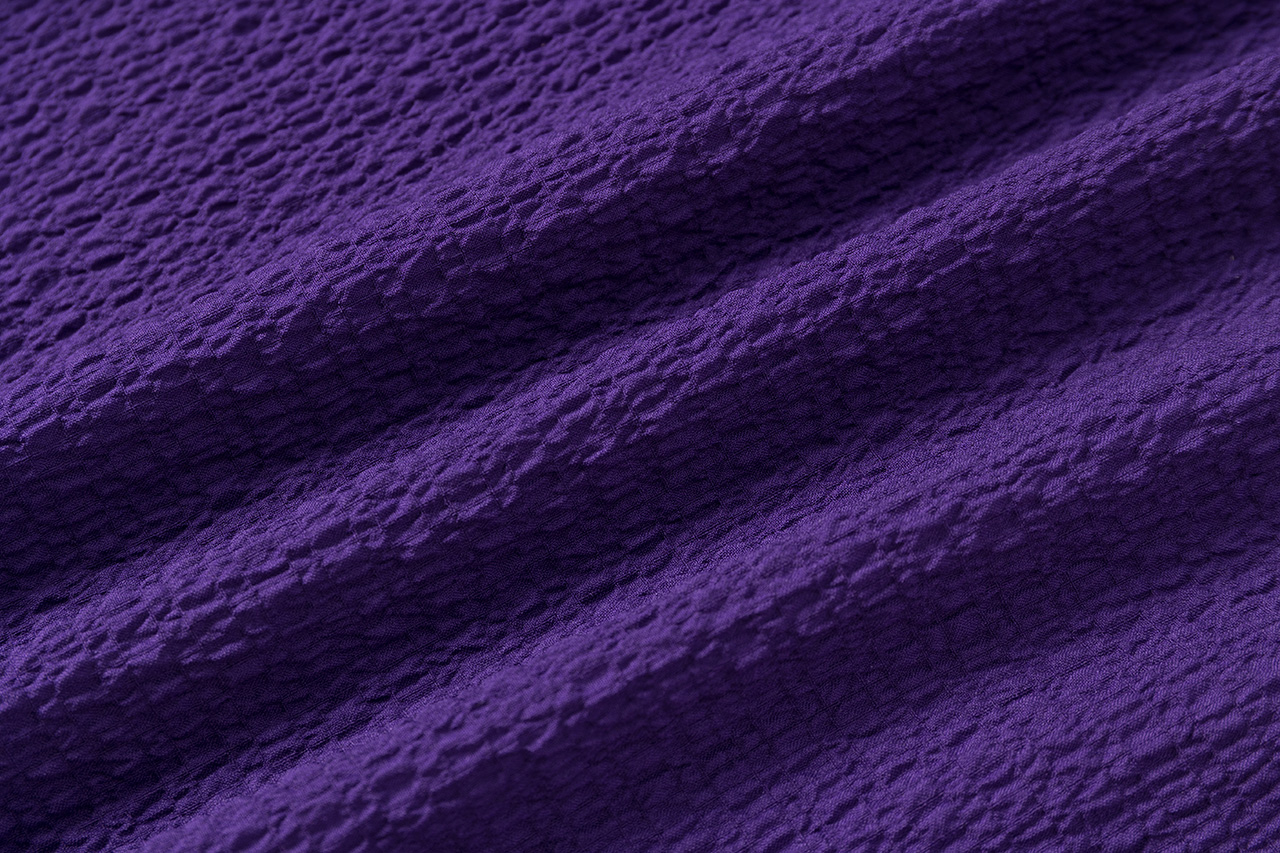 采用幽幽紫色面料,色泽深邃、收敛,如同深海中隐秘的神秘宝藏。特殊的肌理若隐若现,面料柔软有弹性。领口边缘环绕了一圈用衣服相同面料打褶制成的荷叶边,细腻的褶皱紧密排列,增添了年轻与精致。