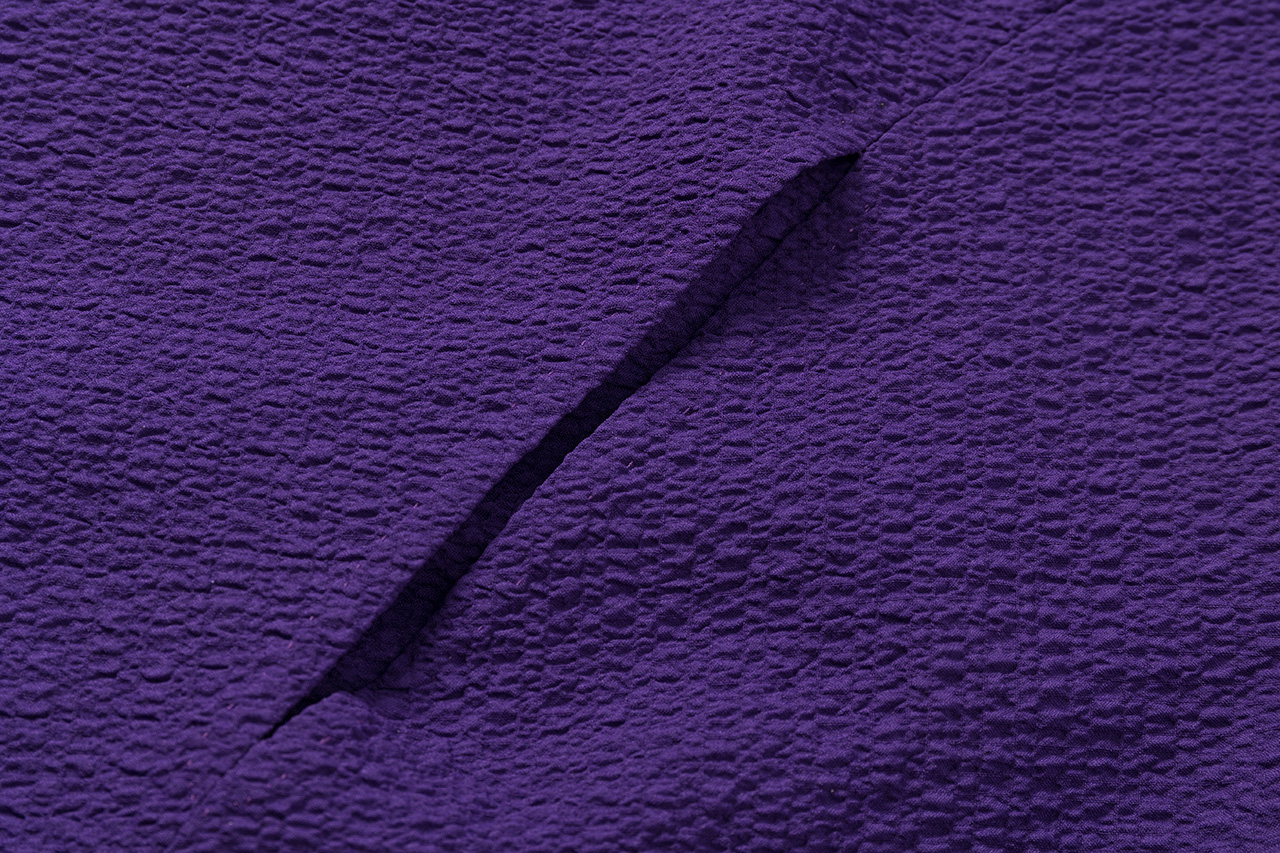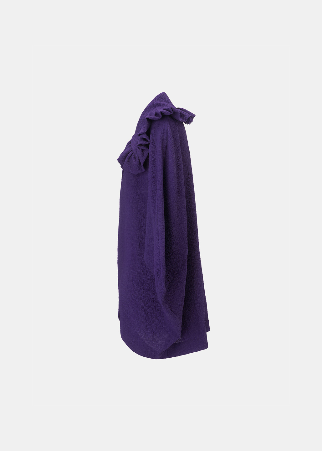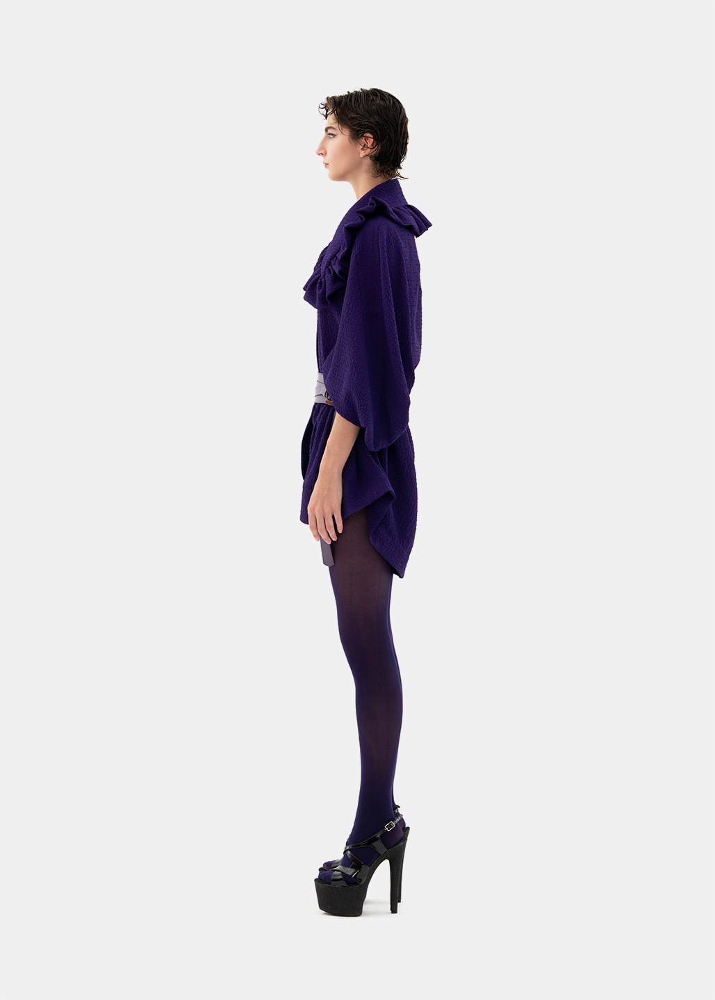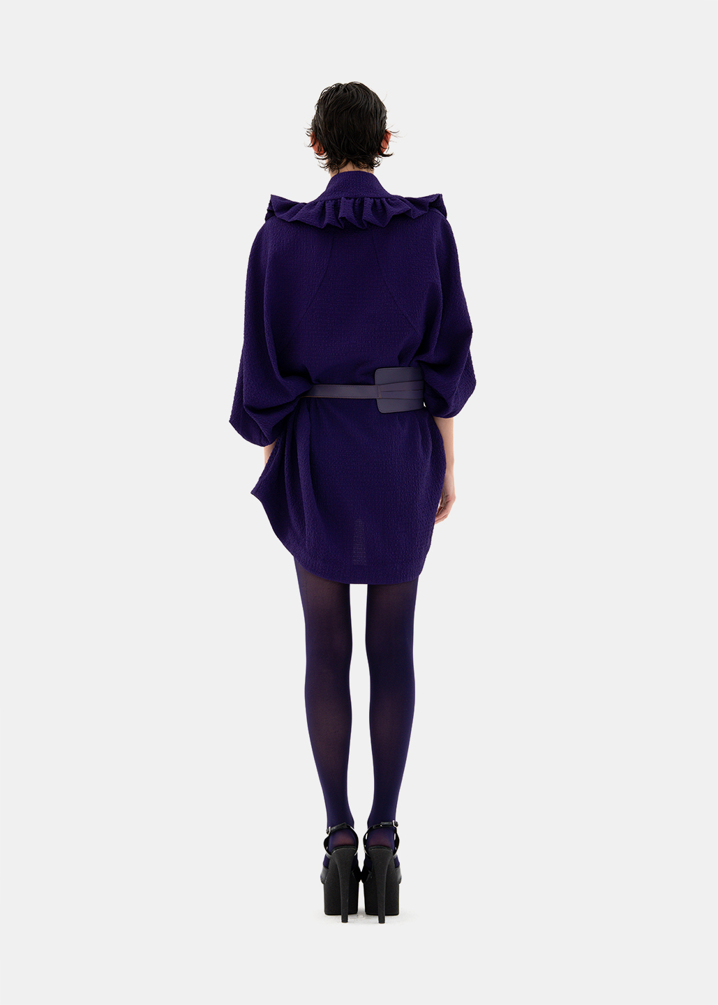 采用幽幽紫色面料,色泽深邃、收敛,如同深海中隐秘的神秘宝藏。特殊的肌理若隐若现,面料柔软有弹性。领口边缘环绕了一圈用衣服相同面料打褶制成的荷叶边,细腻的褶皱紧密排列,增添了年轻与精致。
