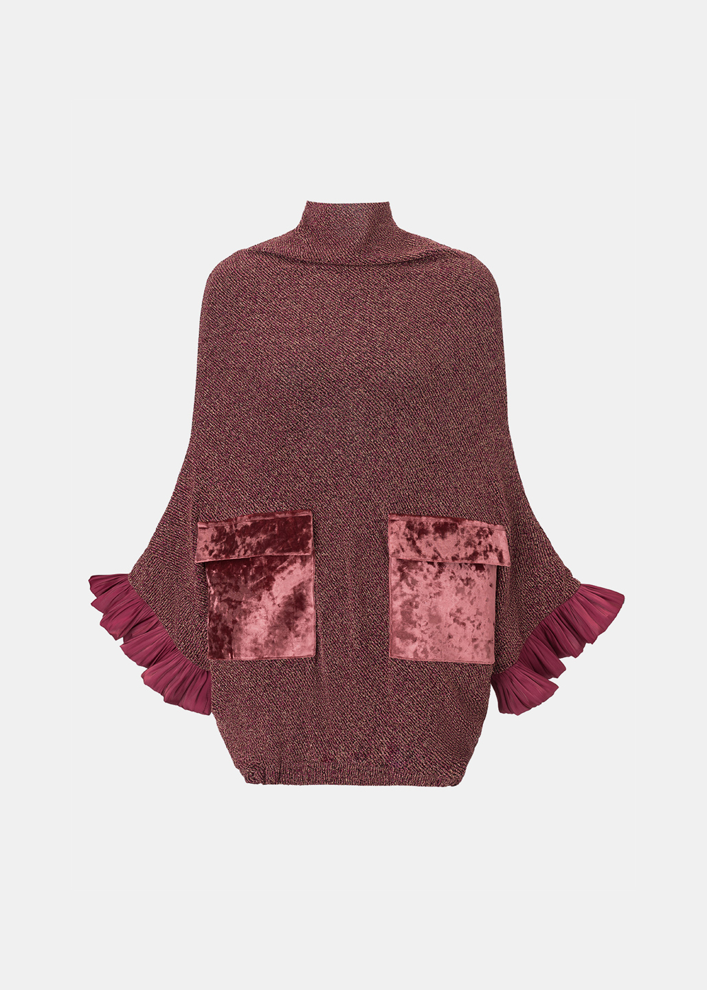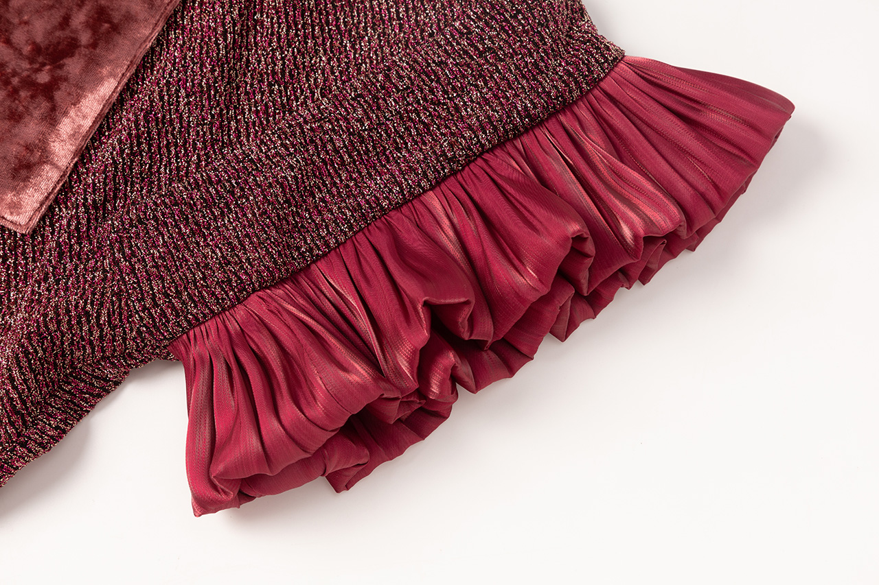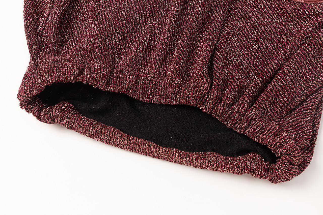 这款针织上衣采用闪光针织面料,弹力贴身收放自如,既可演绎直线高领的优雅穿法,也能展现直肩露肩的随性风格。袖口荷叶边设计为整体增添俏皮灵动感,既浪漫又充满活力,展现出多变的时尚态度与艺术美感。