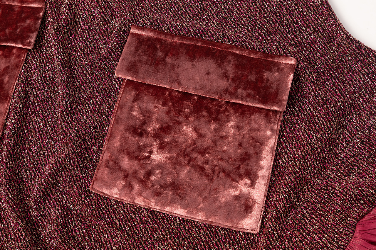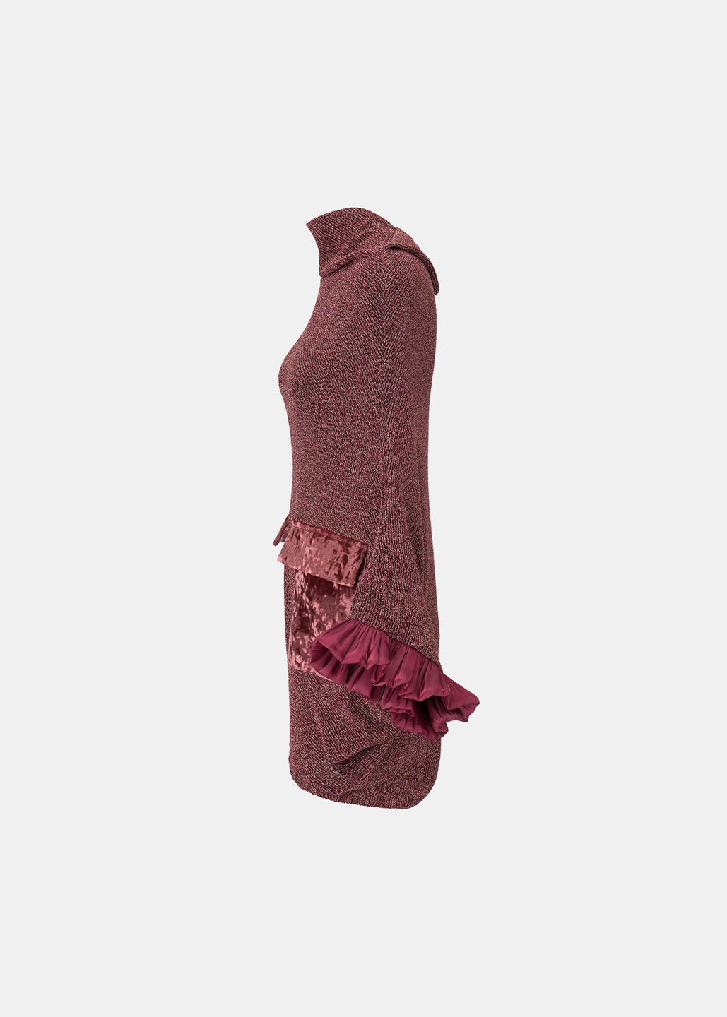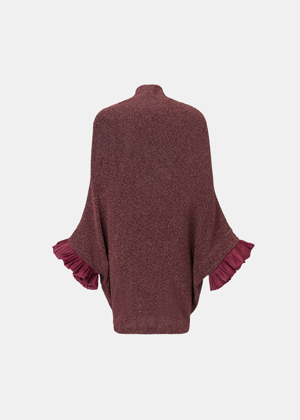 这款针织上衣采用闪光针织面料,弹力贴身收放自如,既可演绎直线高领的优雅穿法,也能展现直肩露肩的随性风格。袖口荷叶边设计为整体增添俏皮灵动感,既浪漫又充满活力,展现出多变的时尚态度与艺术美感。