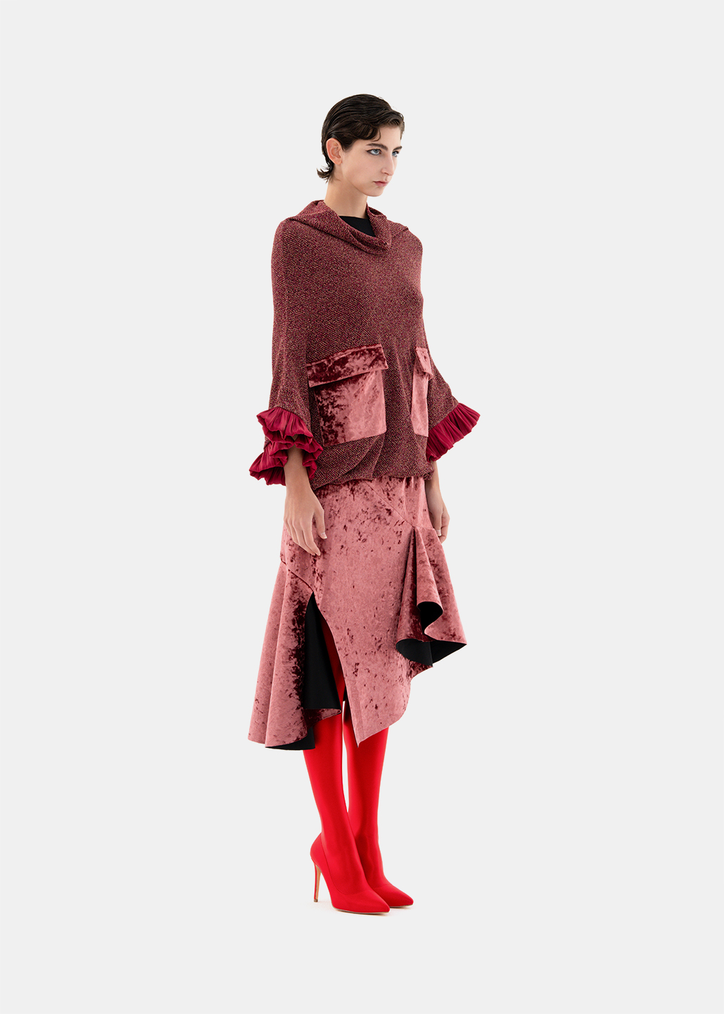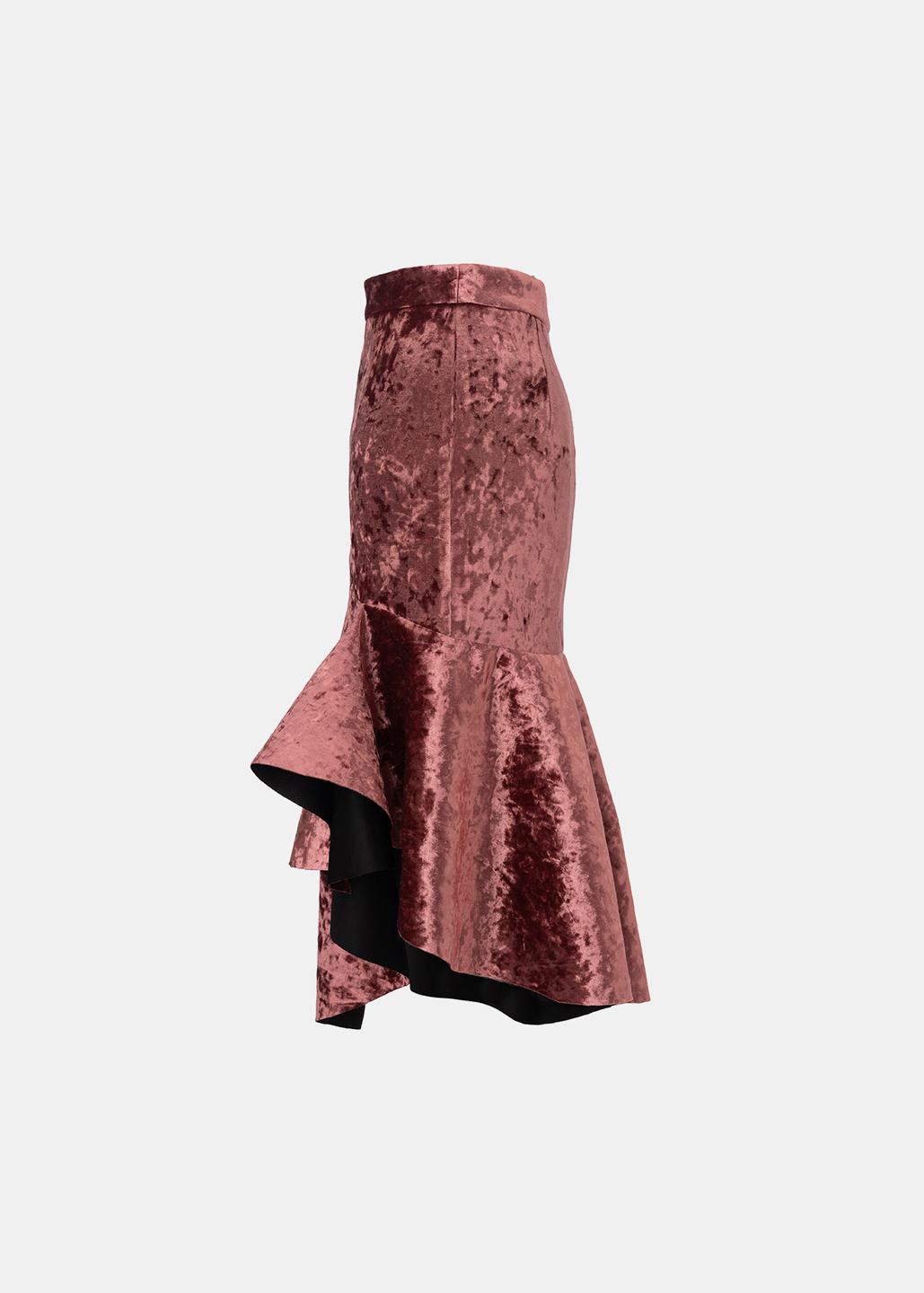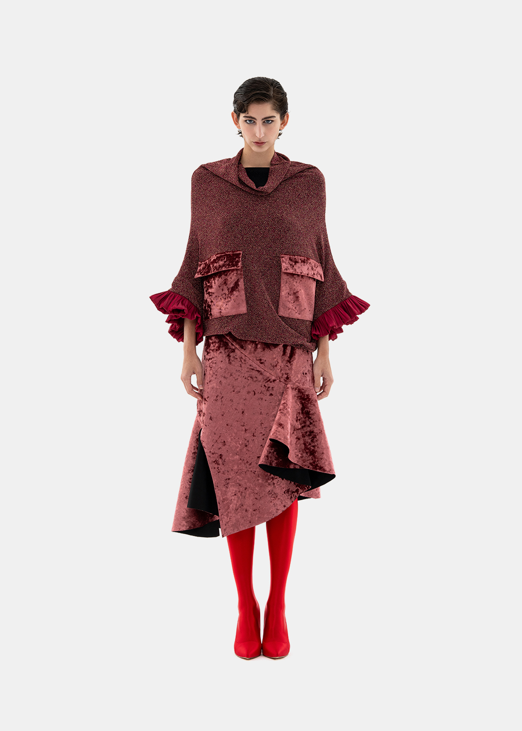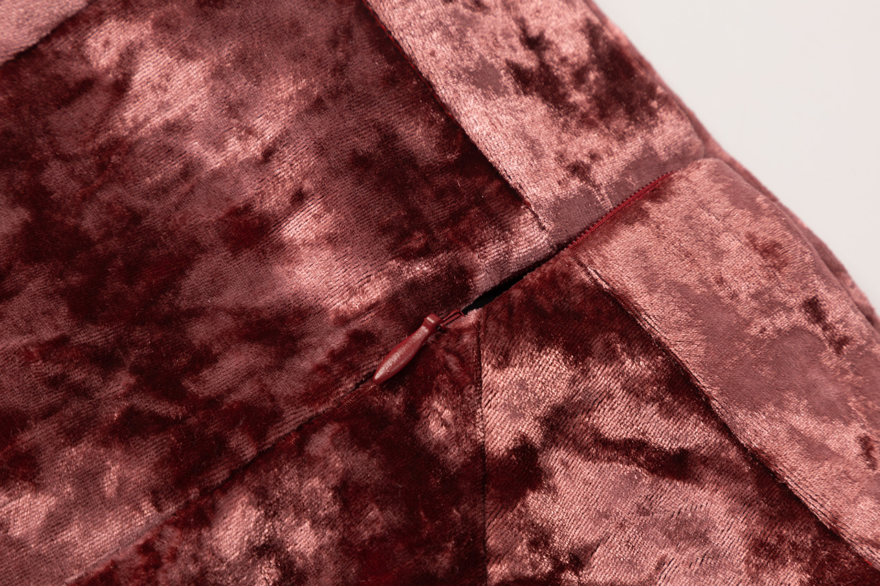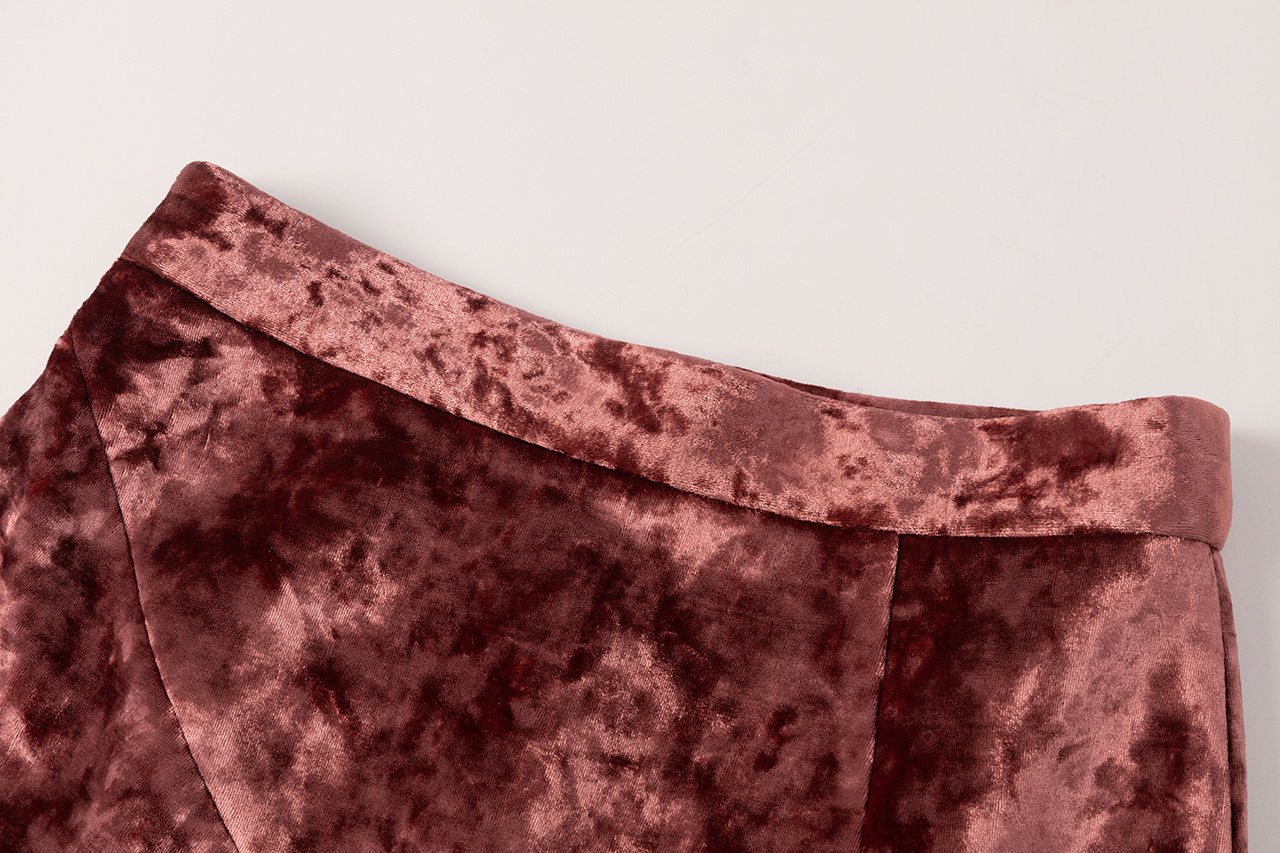 这款洋红不规则开衩裙,选 用发光丝绒面料,质感柔软且富有弹性。斜向剪裁与不规则开衩设计,为裙身注入流动感与层次感,彰显不羁的个性。行走时轻盈灵动,静立时俏皮从容,既洒脱随性又充满浪漫情调,将独特个性与迷人风范完美融合。