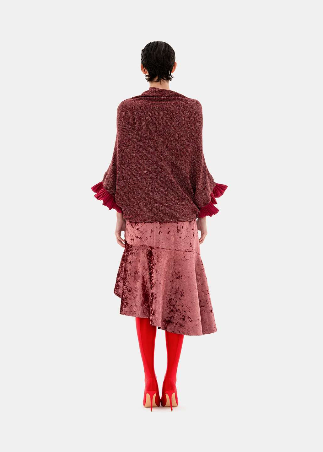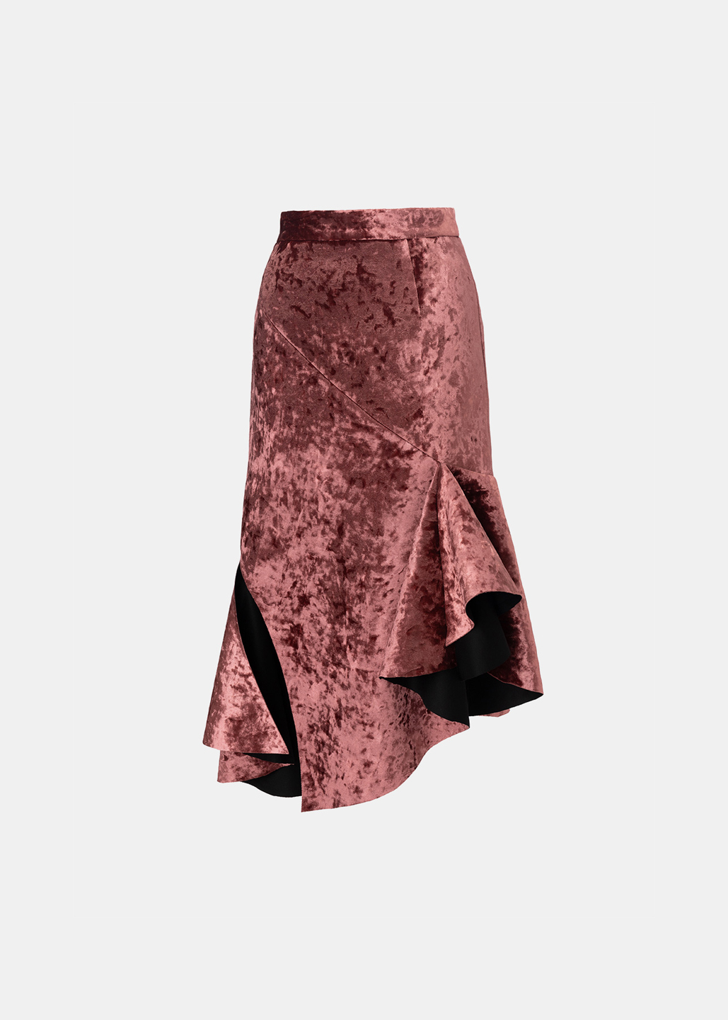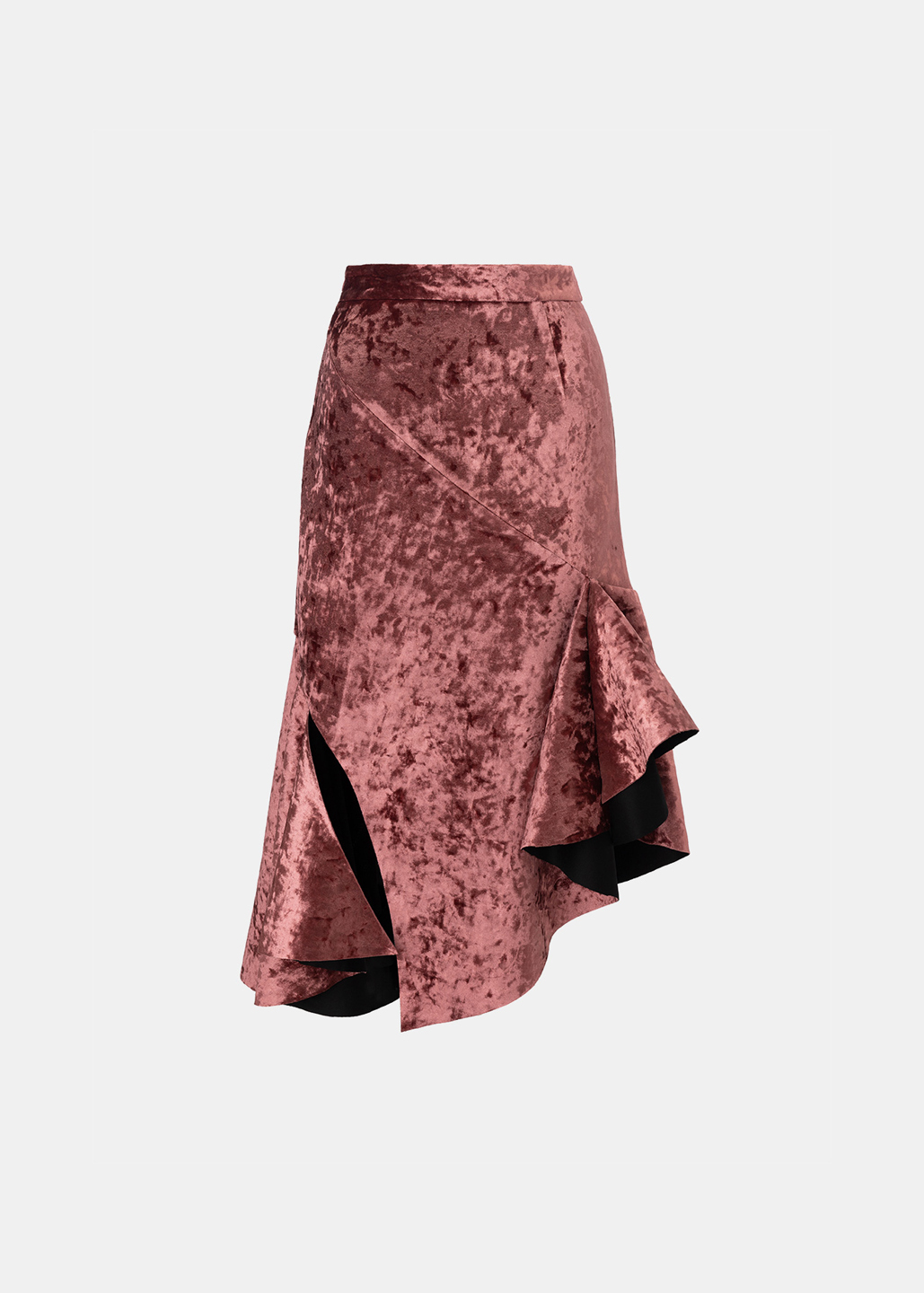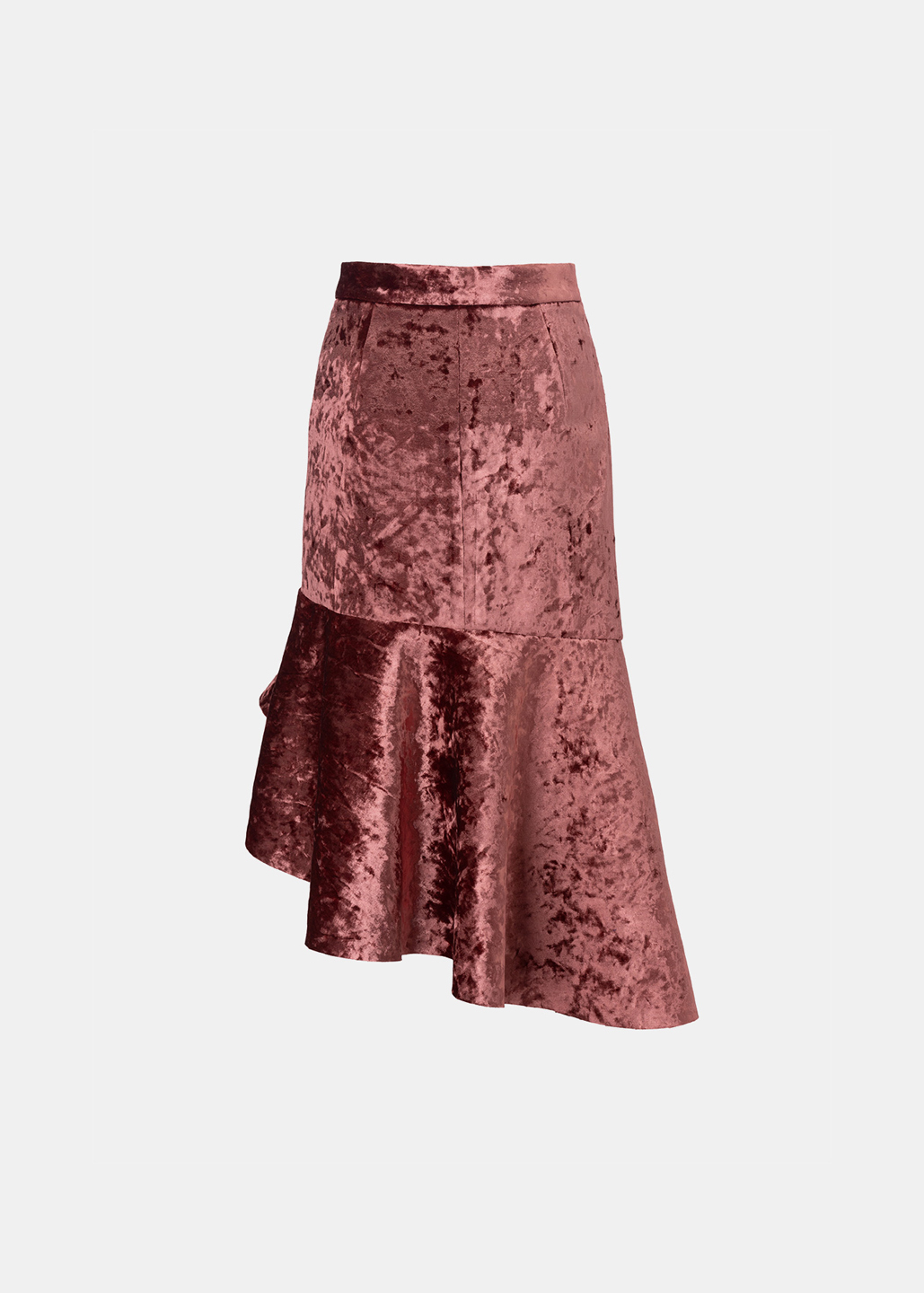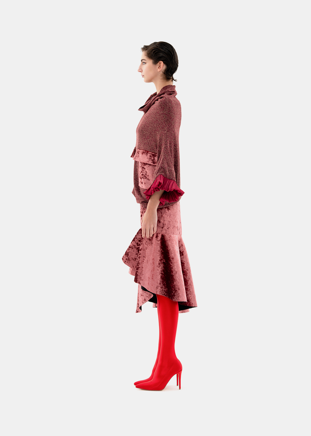 这款洋红不规则开衩裙,选 用发光丝绒面料,质感柔软且富有弹性。斜向剪裁与不规则开衩设计,为裙身注入流动感与层次感,彰显不羁的个性。行走时轻盈灵动,静立时俏皮从容,既洒脱随性又充满浪漫情调,将独特个性与迷人风范完美融合。